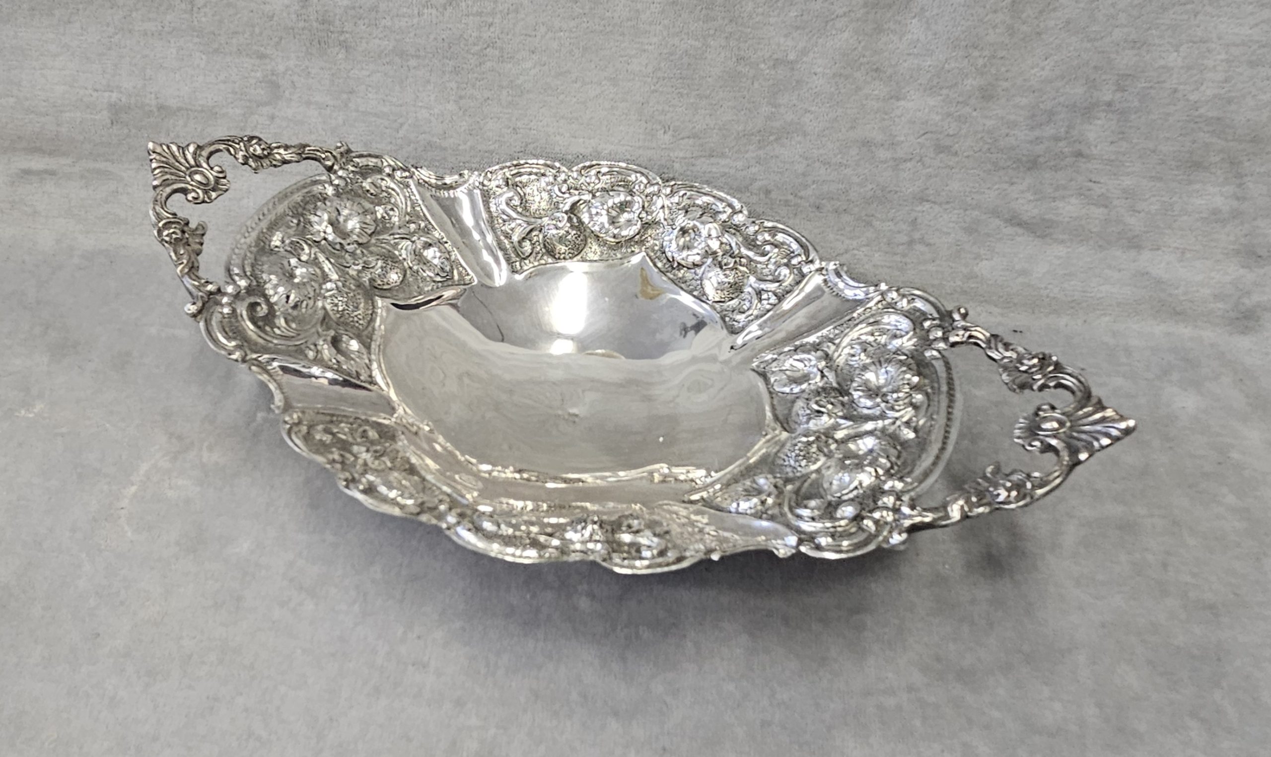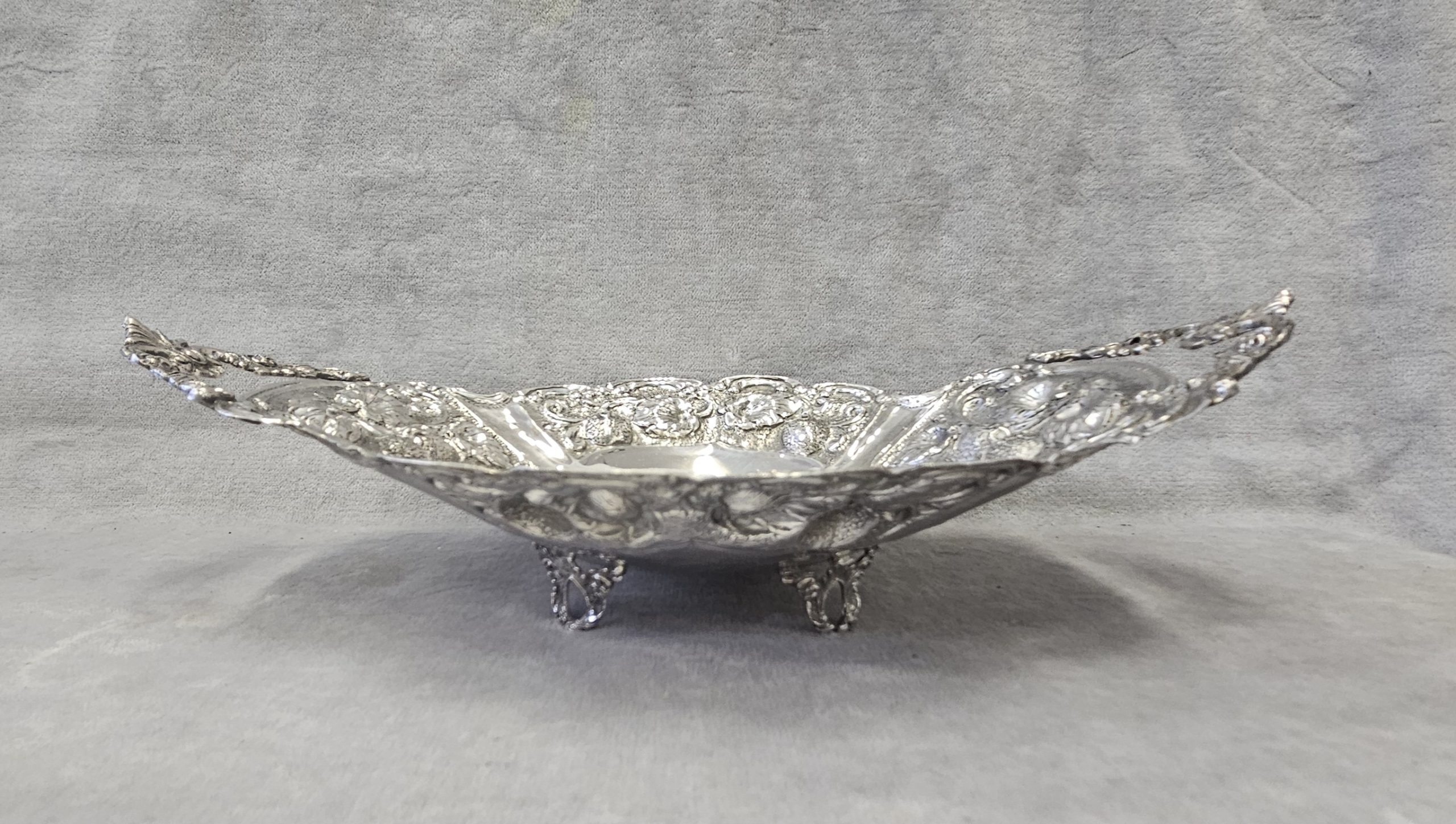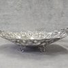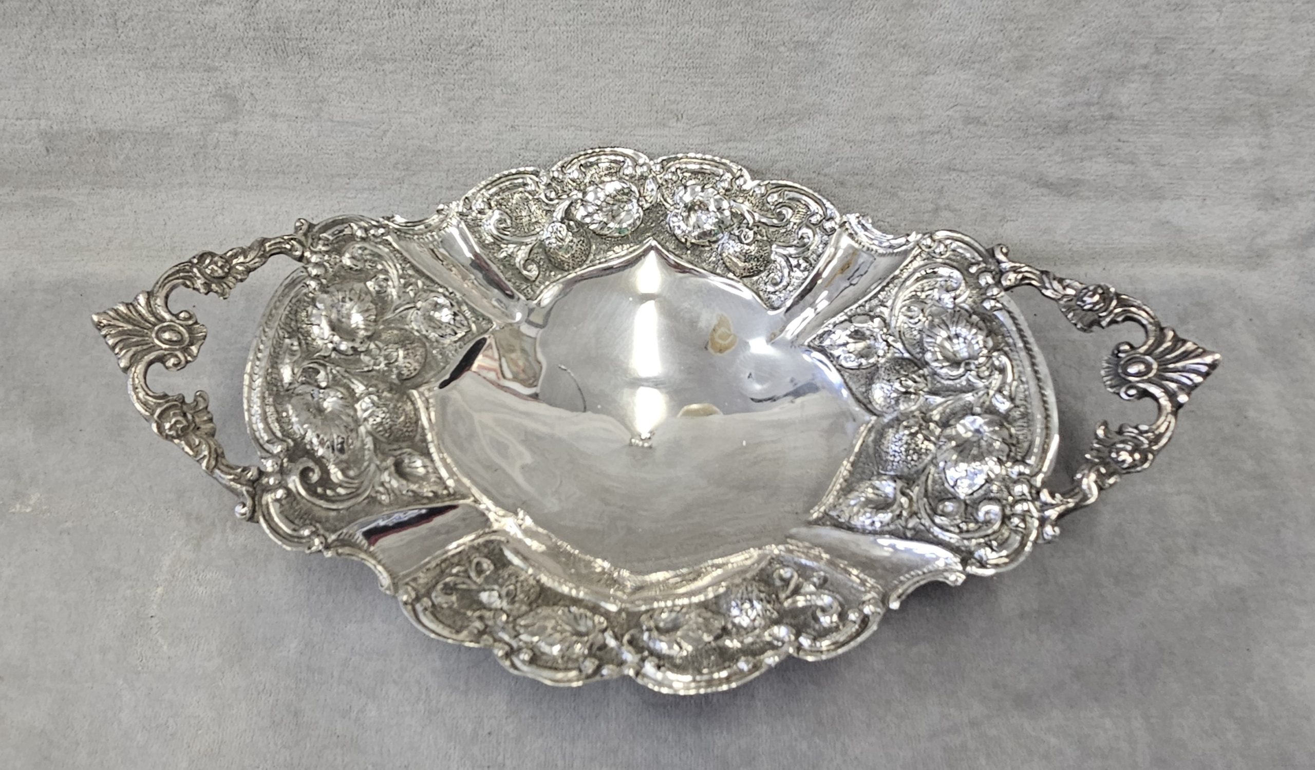 Paterka srebrna na czterech nogach z poziomkami. srebro pr 925 waga 208 g. wys. 7 cm. szer. 27,5 cm. gł. 16,5 cm. cechowana; 925, XEIPO