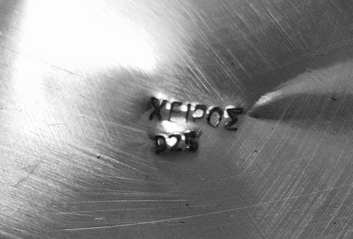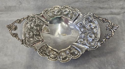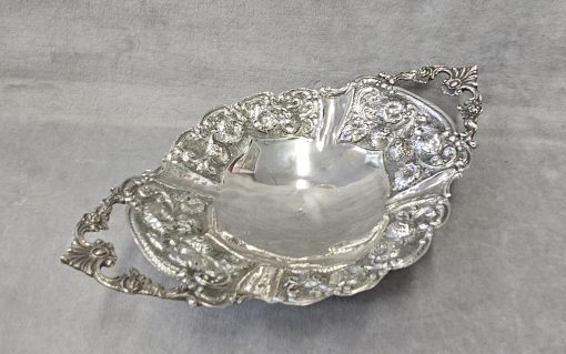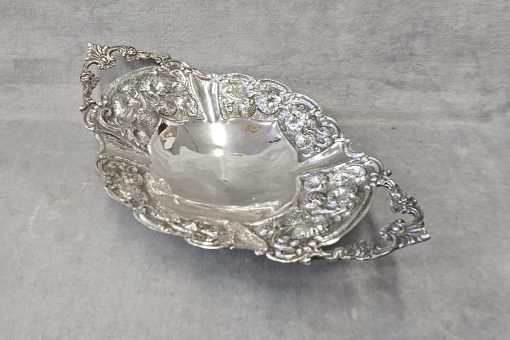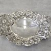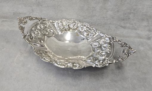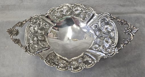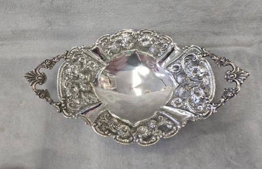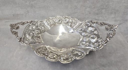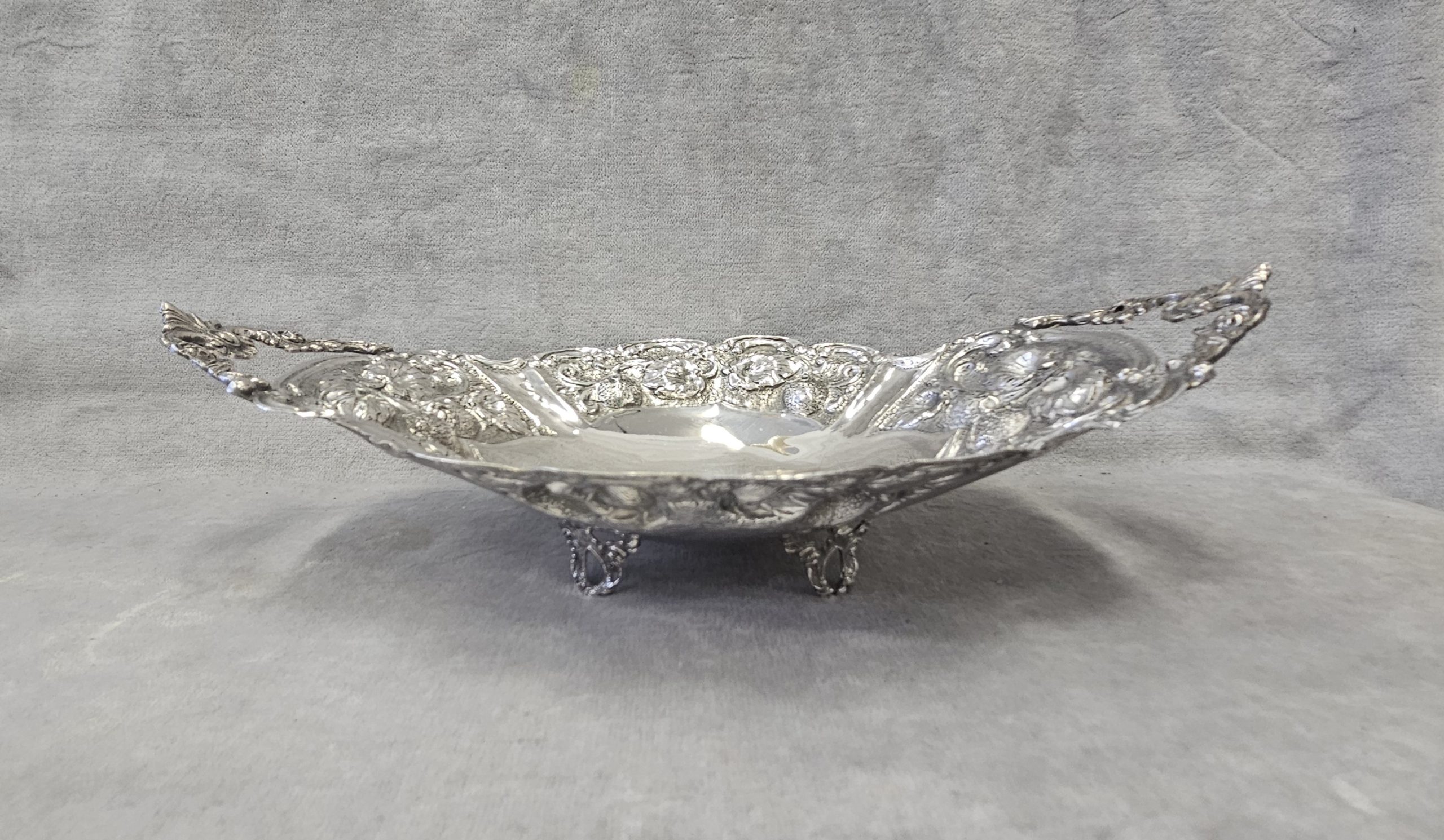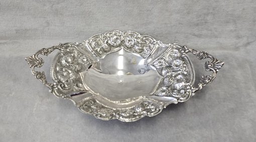 Paterka srebrna na czterech nogach z poziomkami. srebro pr 925 waga 208 g. wys. 7 cm. szer. 27,5 cm. gł. 16,5 cm. cechowana; 925, XEIPO