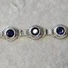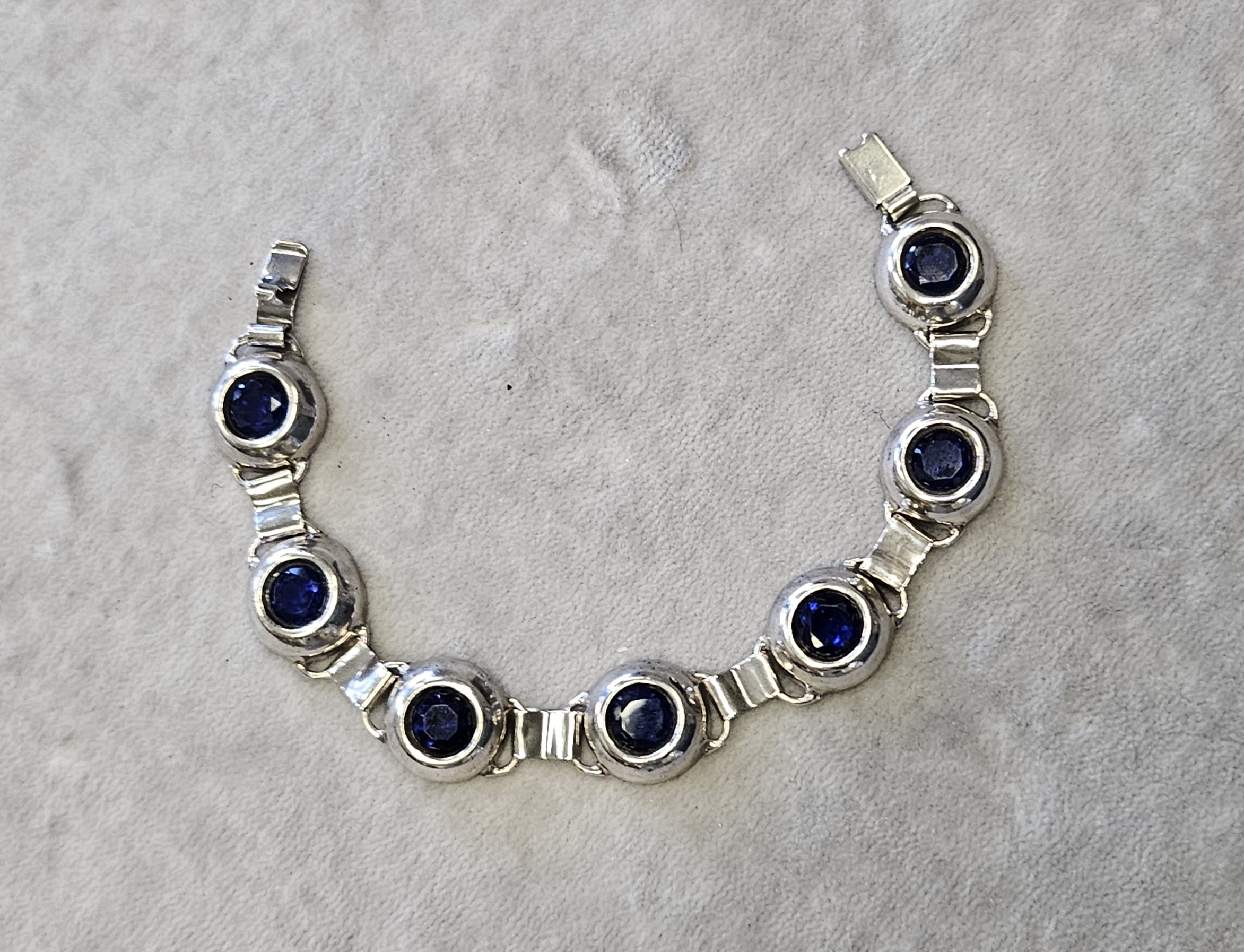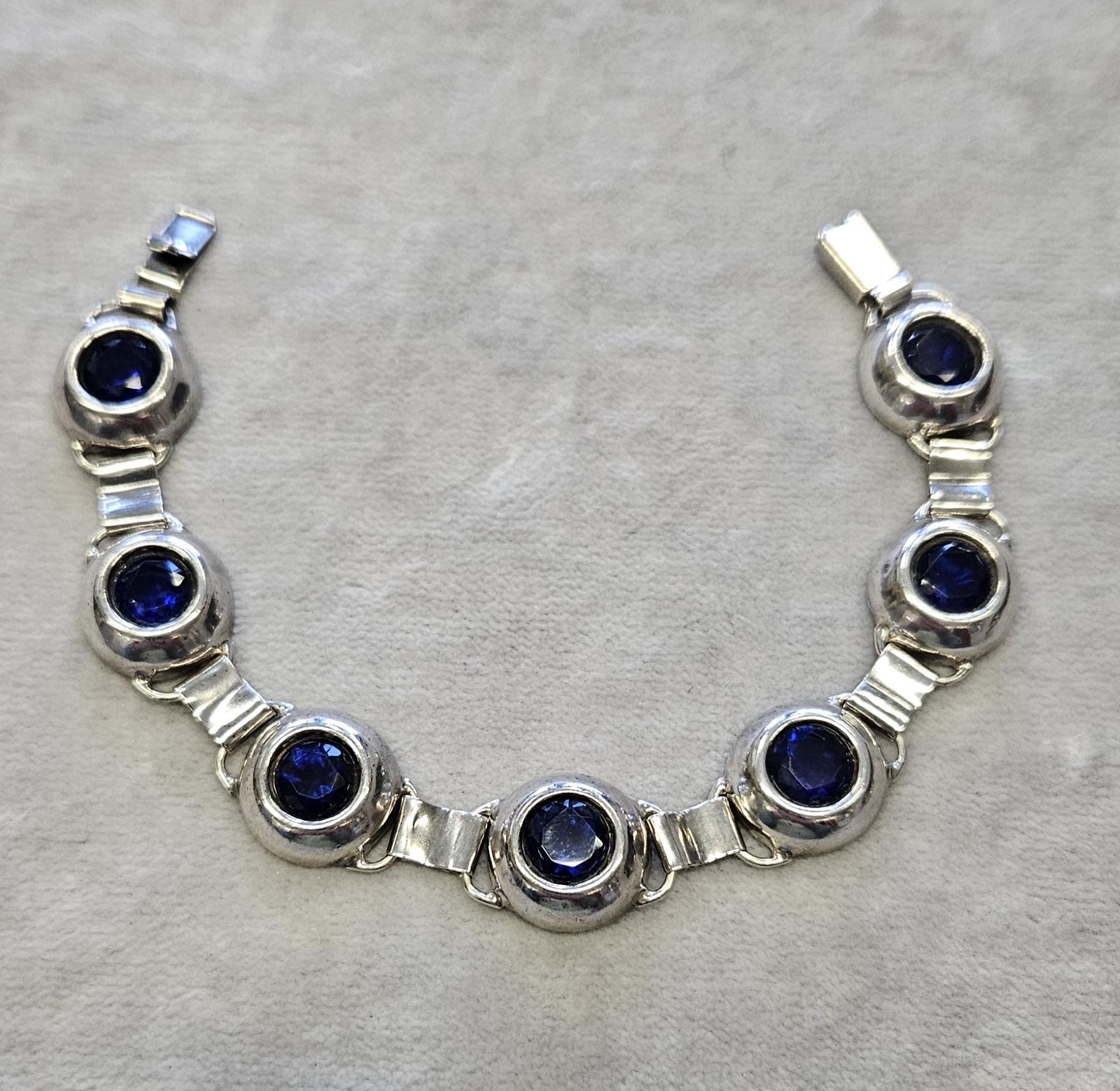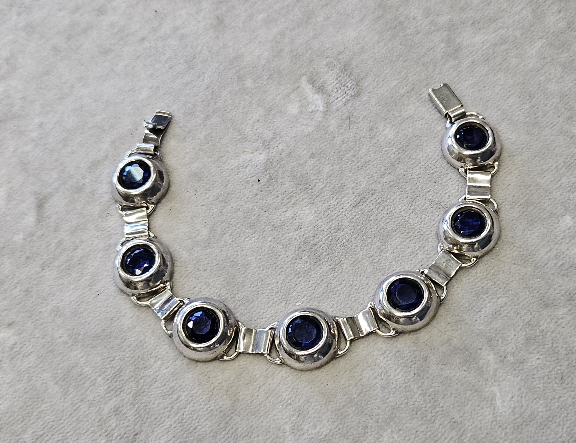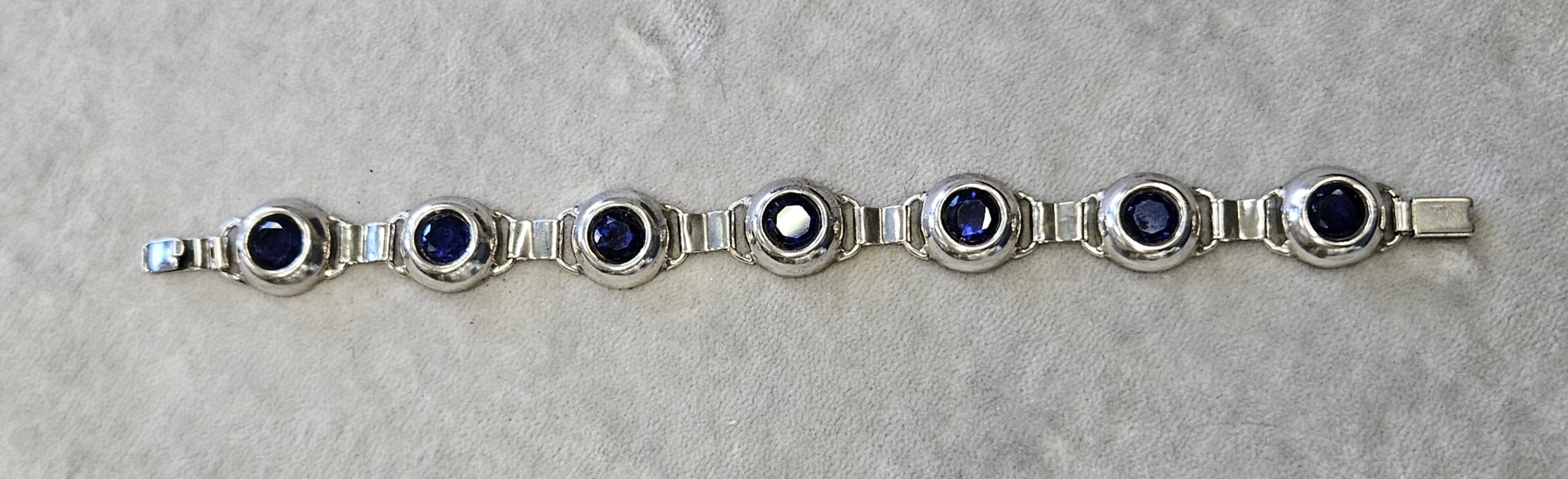 Bransoletka srebrna  srebro pr. 925. 16 g. bransoletka dł. 19 cm. szer. 16 mm. granatowe kamienie o śr.9 mm. cechowana w prostokącie 925, głowa kobiety, G, (cecha probierni gdańskiej) , 2 poł. XX w
