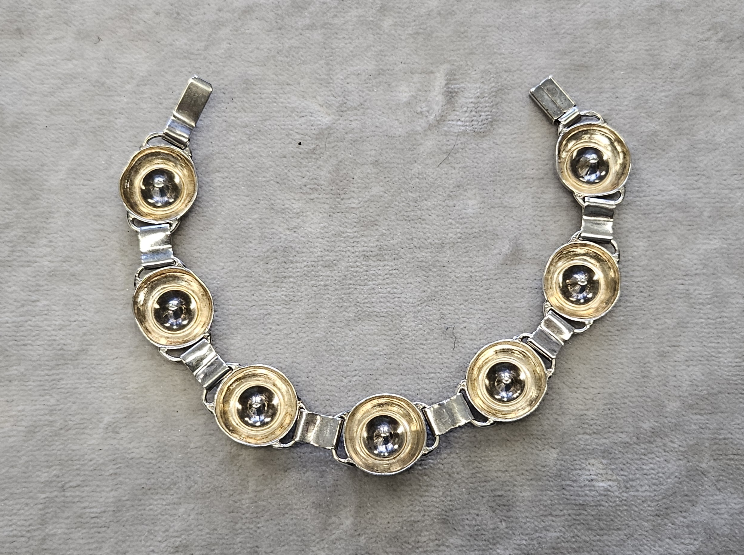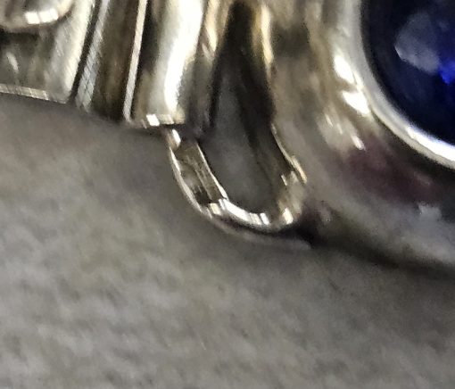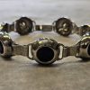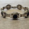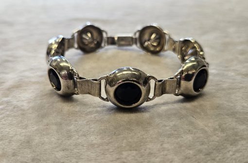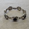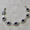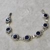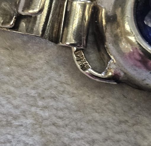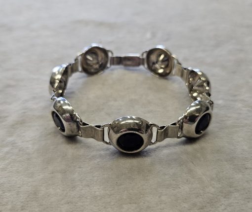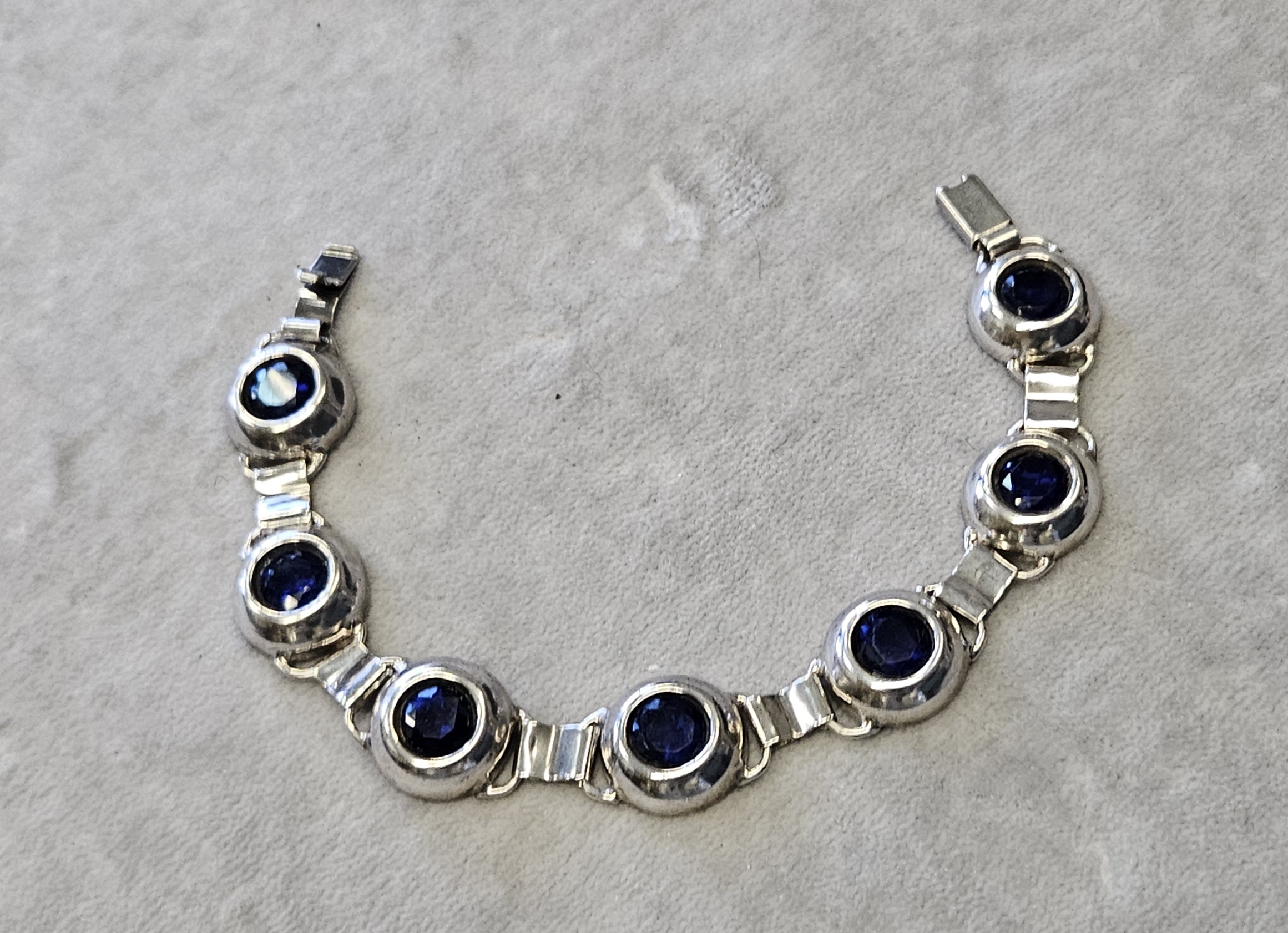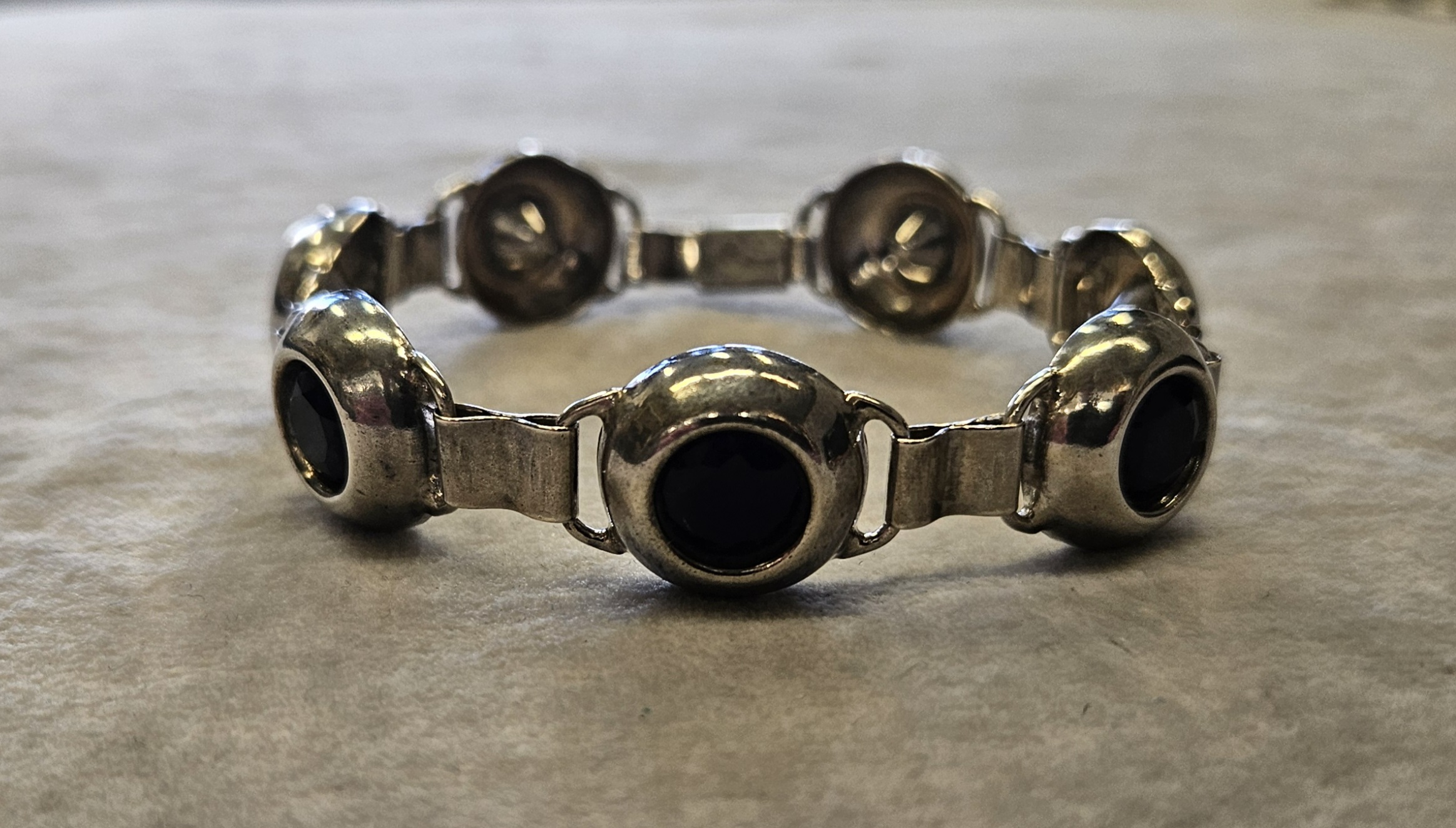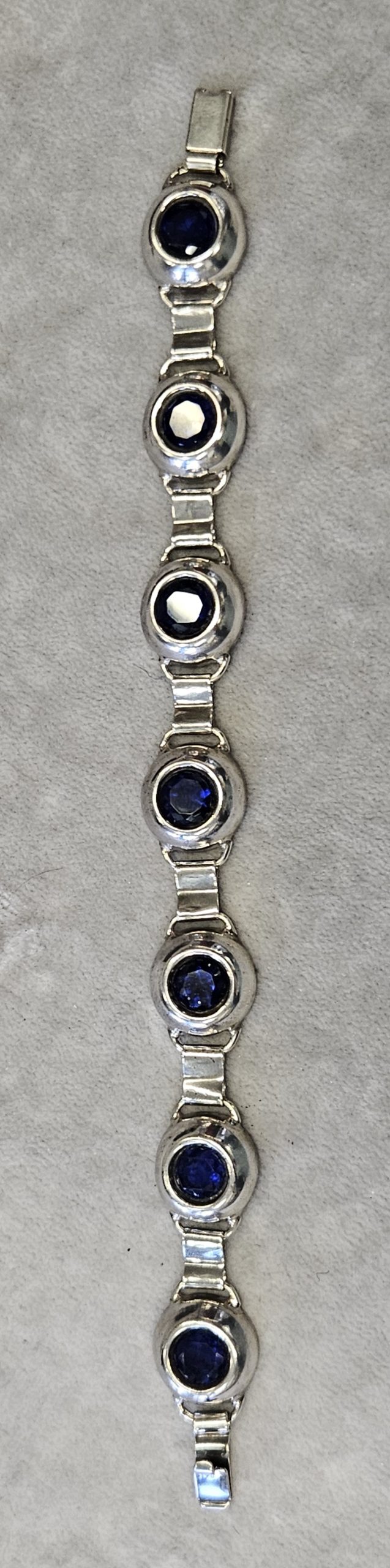 Bransoletka srebrna  srebro pr. 925. 16 g. bransoletka dł. 19 cm. szer. 16 mm. granatowe kamienie o śr.9 mm. cechowana w prostokącie 925, głowa kobiety, G, (cecha probierni gdańskiej) , 2 poł. XX w