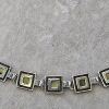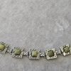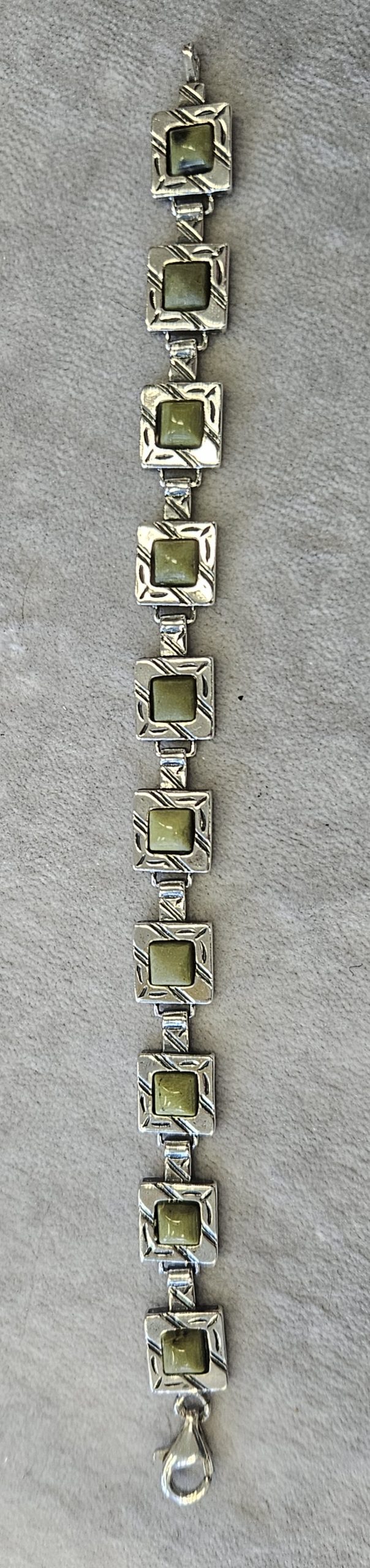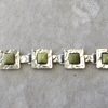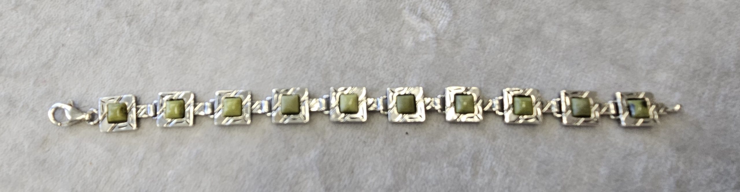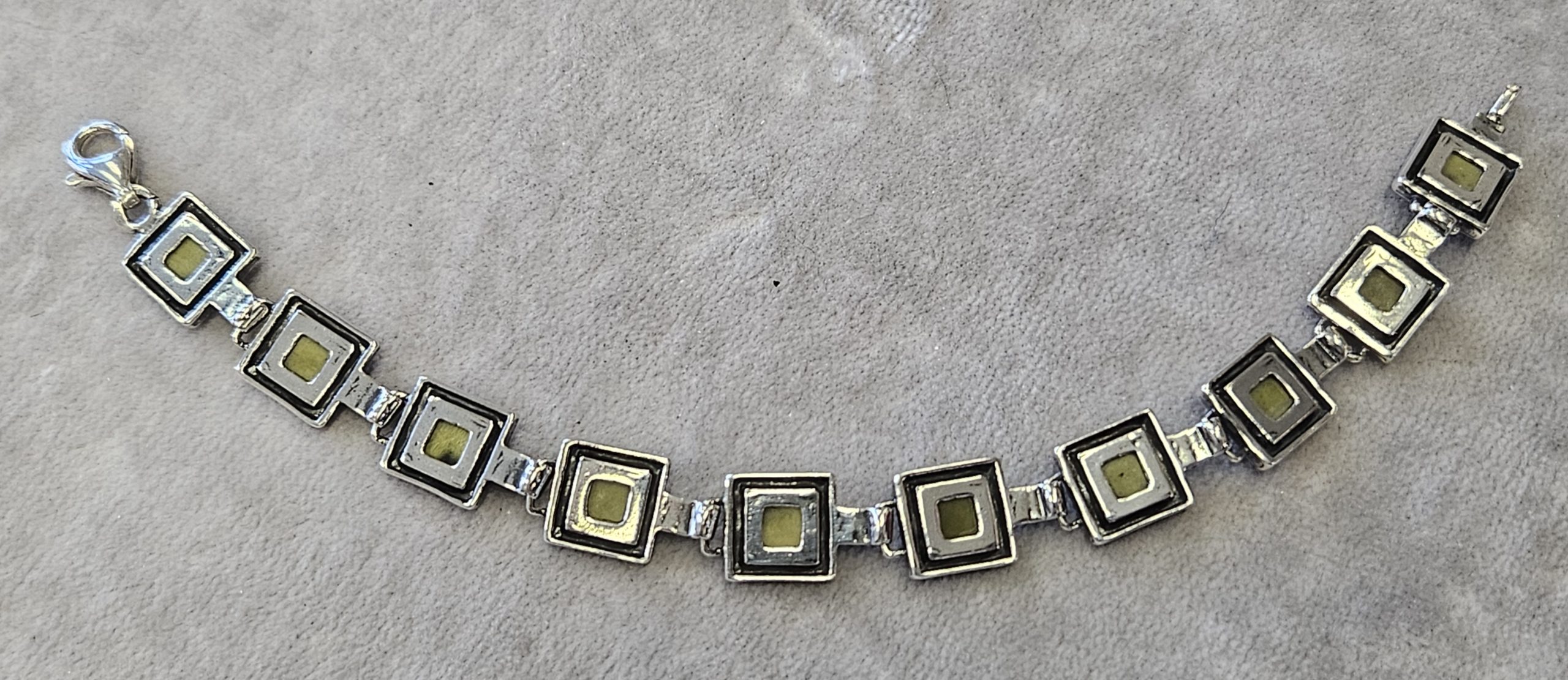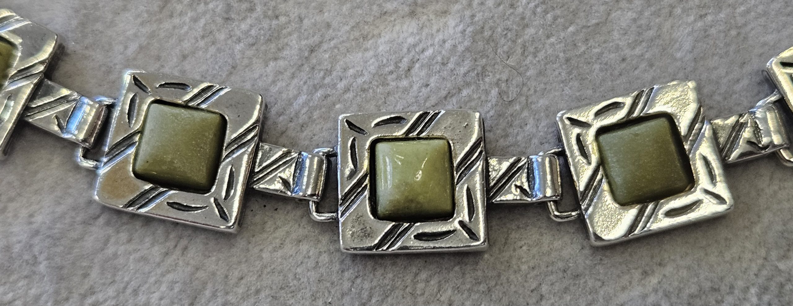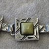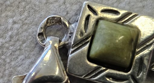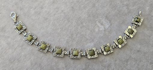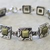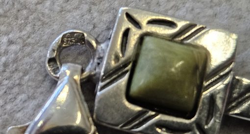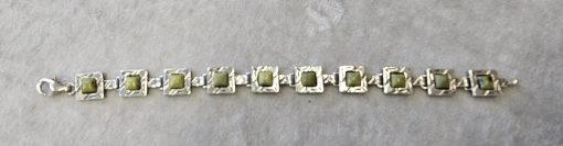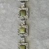 Bransoletka srebrna  20 g. srebro pr. 925. 20 g. bransoletka dł. 19,5 cm. szer. 11 mm. zielone kamienie kwadratowe 5,5×5,5 mm. cechowane w prostokącie 925, głowa kobiety, A, (Urząd Probierczy Białystok) oraz złotnik , 2 poł. XX w.