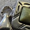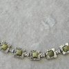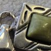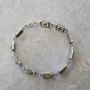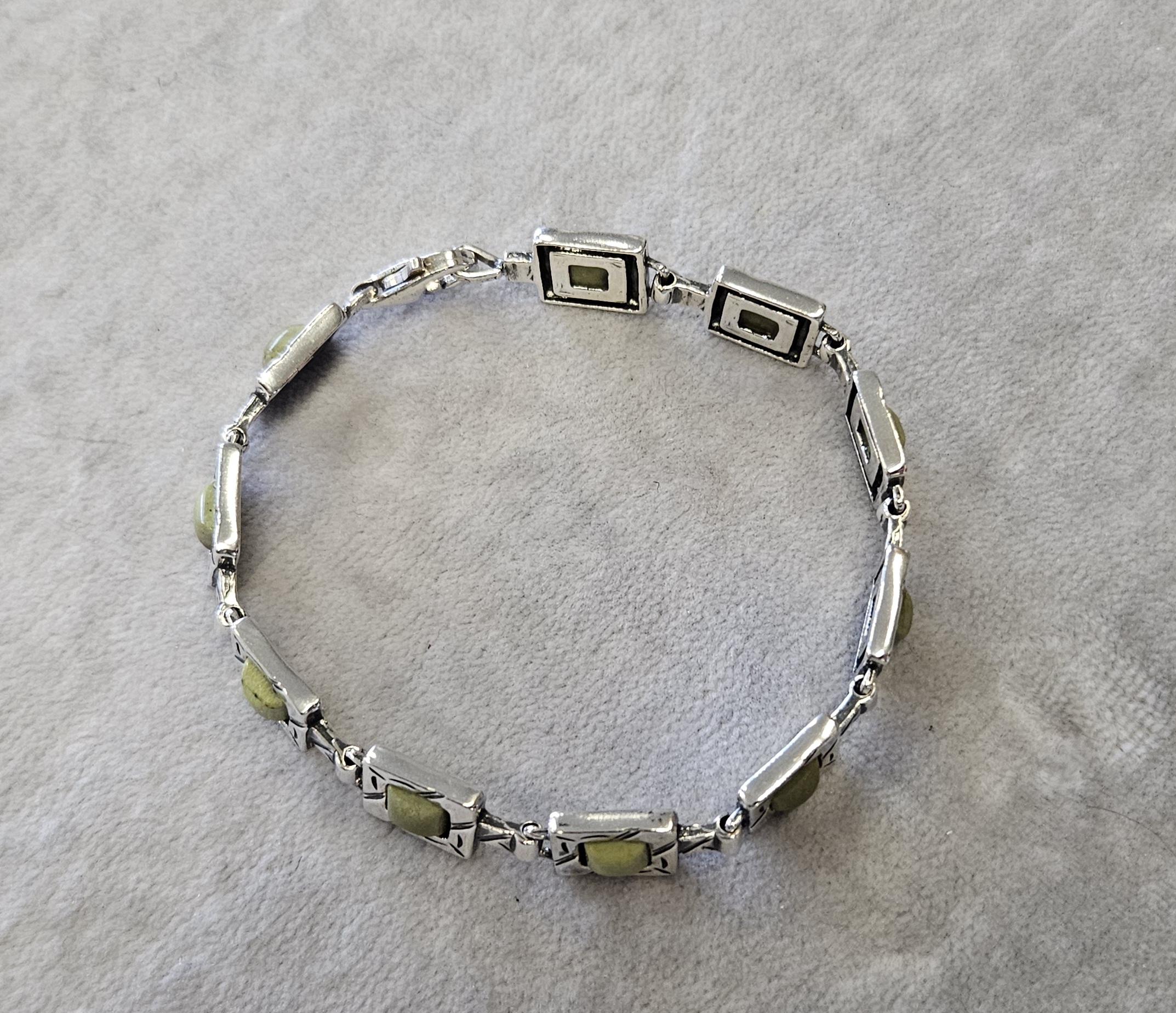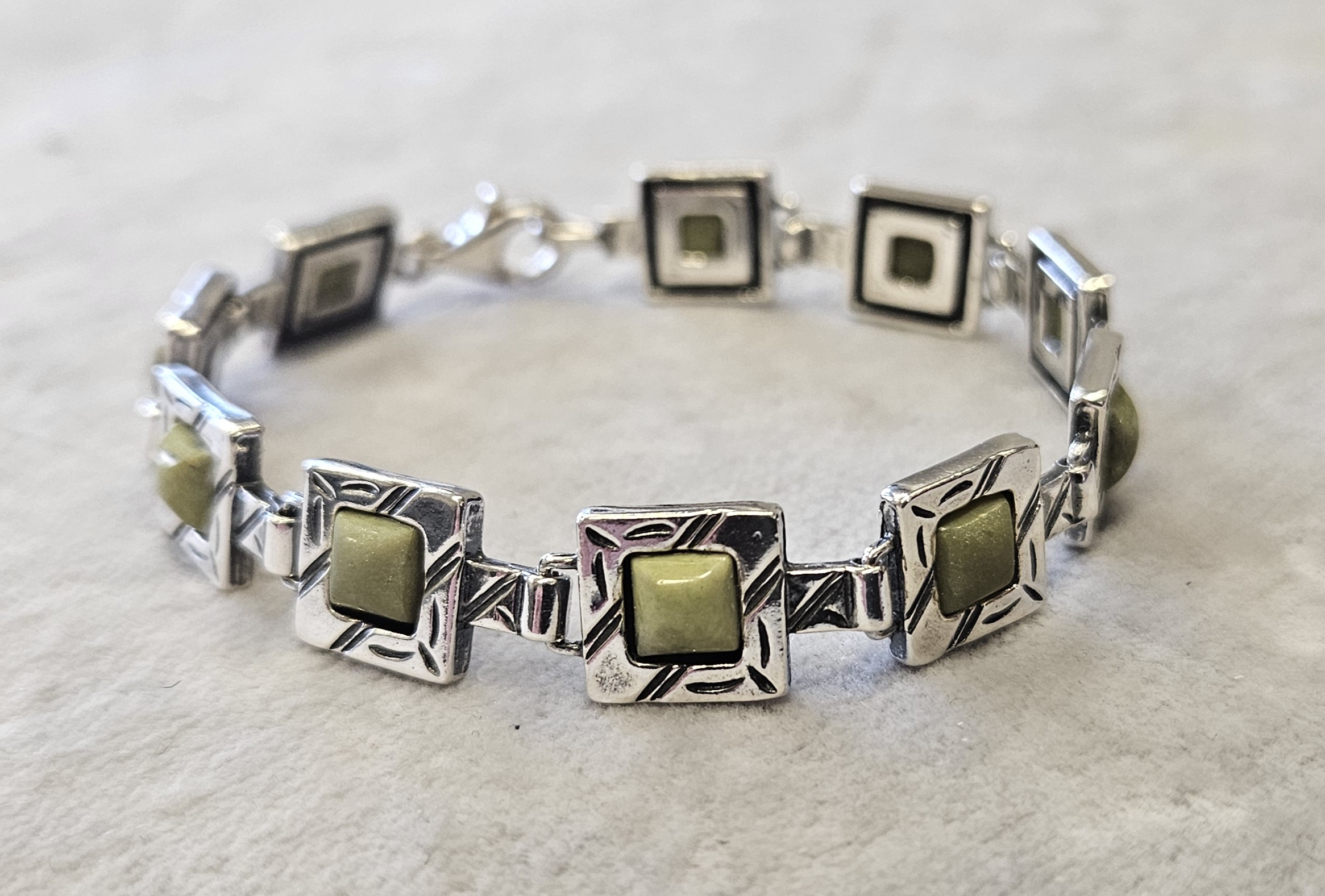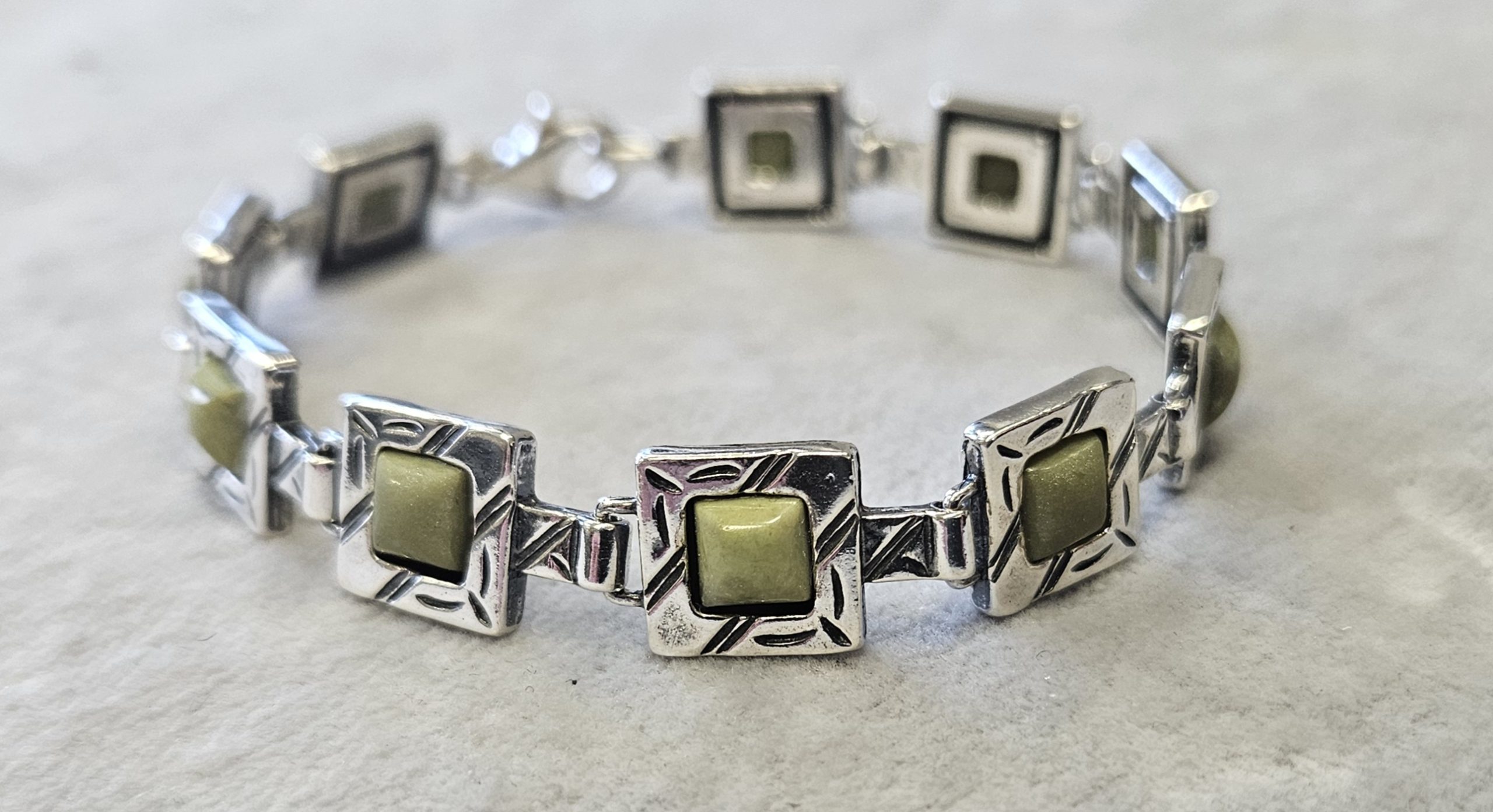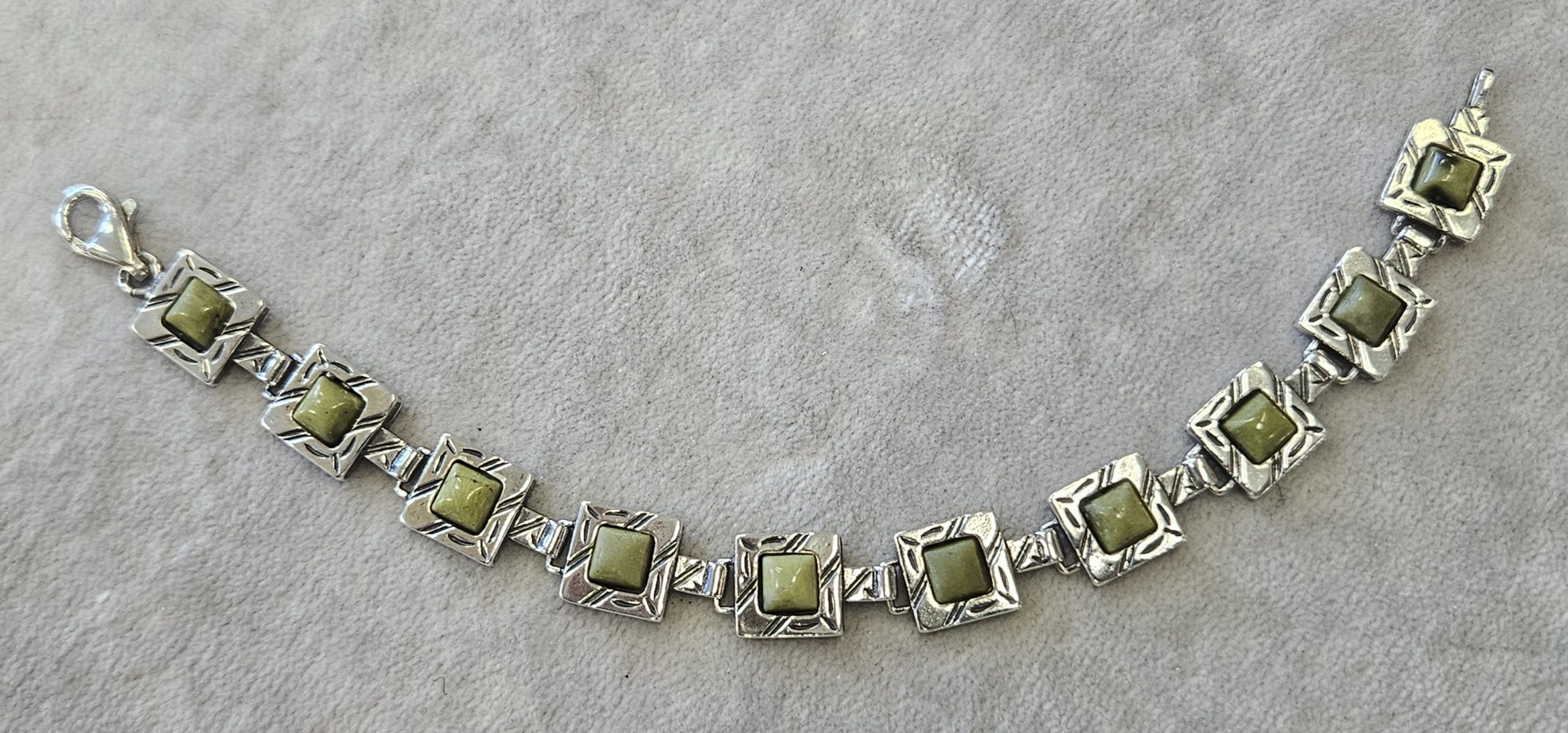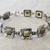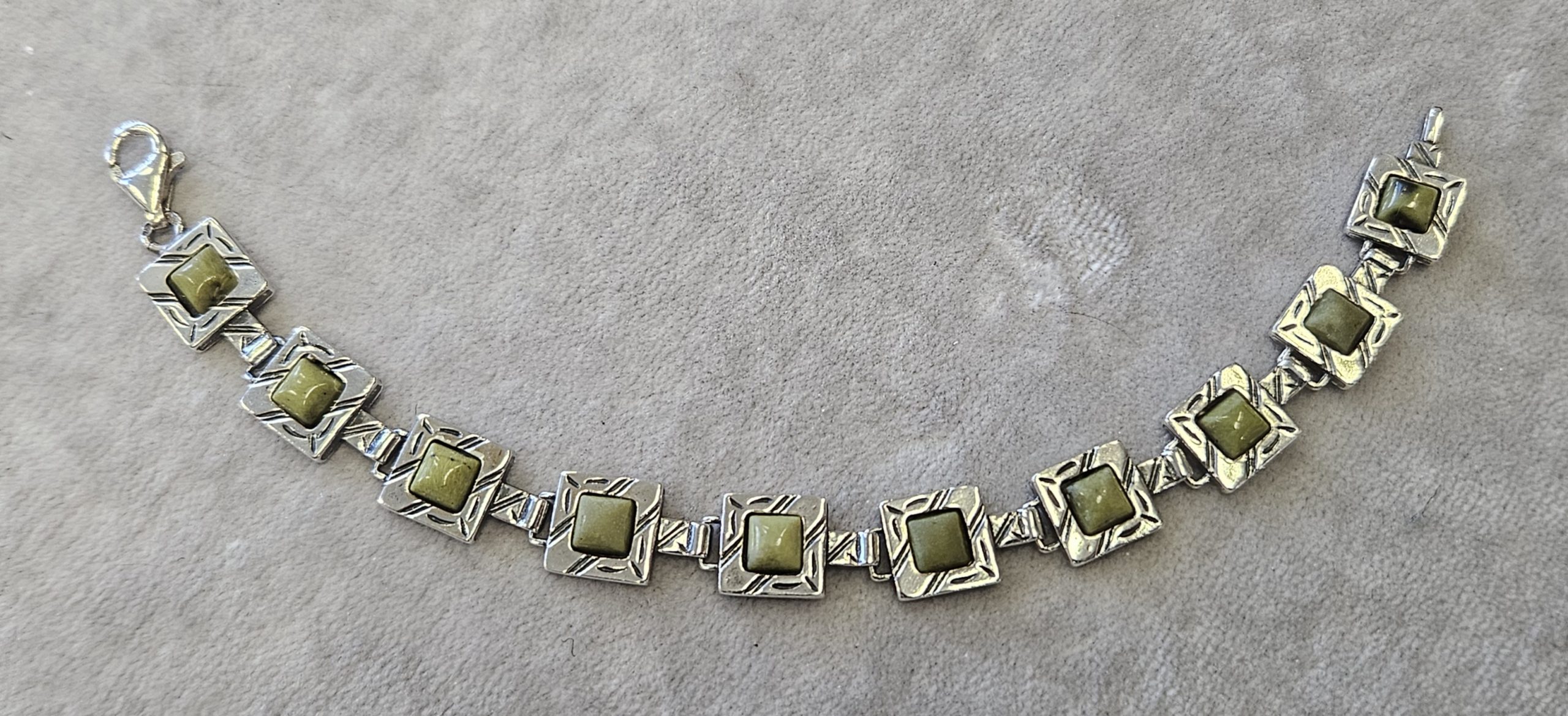 Bransoletka srebrna  20 g. srebro pr. 925. 20 g. bransoletka dł. 19,5 cm. szer. 11 mm. zielone kamienie kwadratowe 5,5×5,5 mm. cechowane w prostokącie 925, głowa kobiety, A, (Urząd Probierczy Białystok) oraz złotnik , 2 poł. XX w.