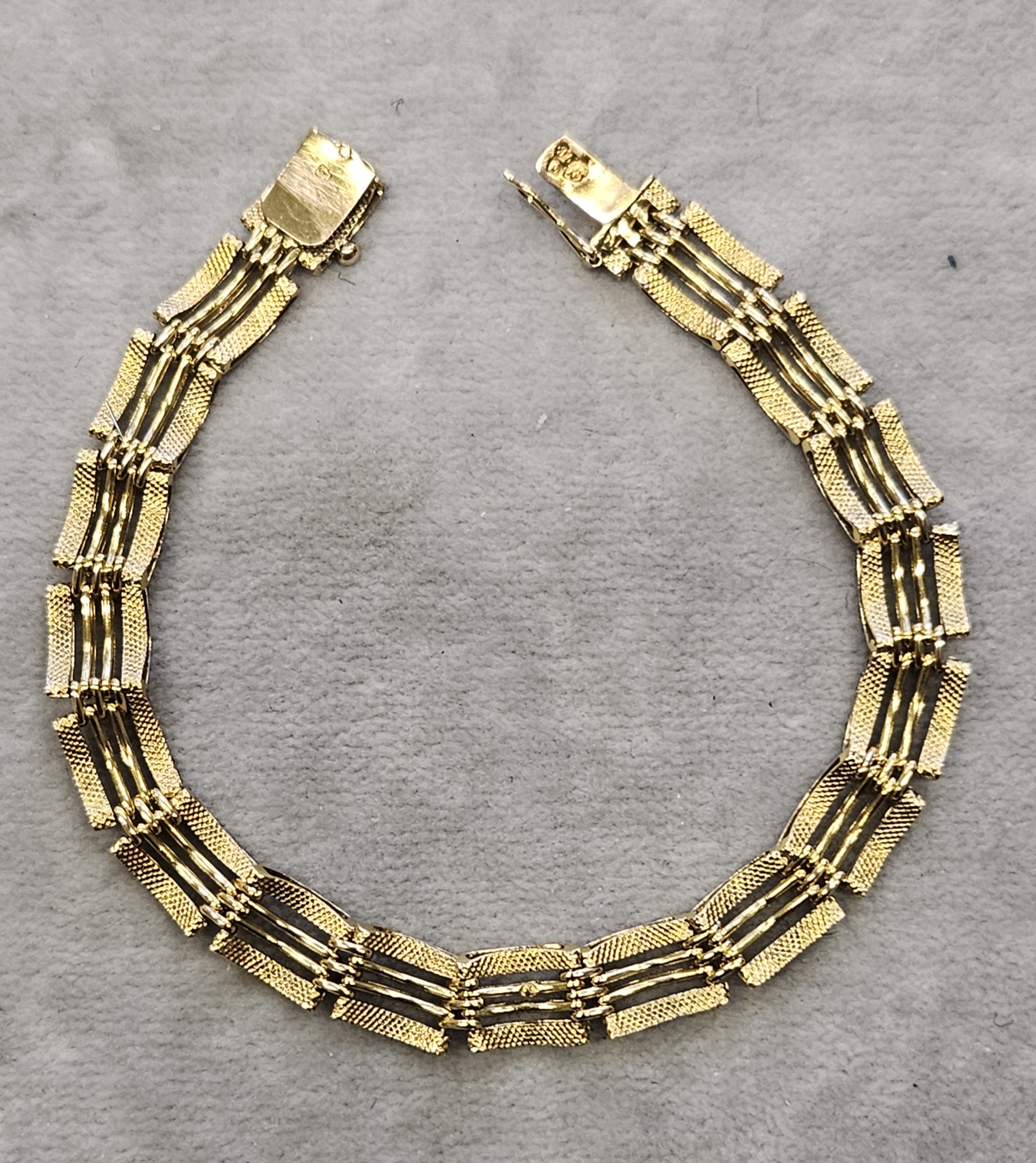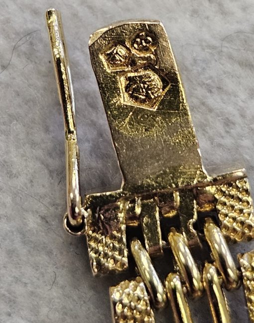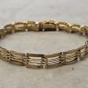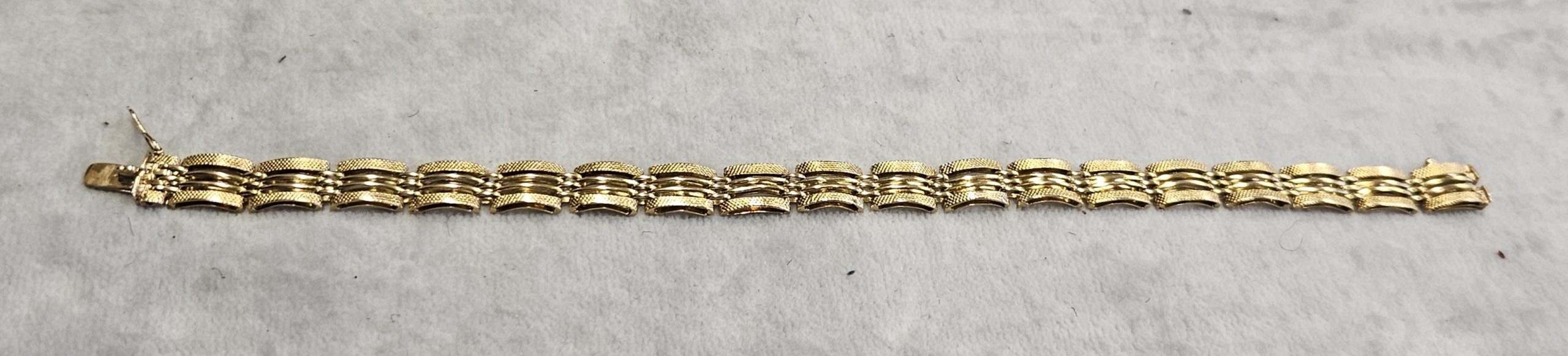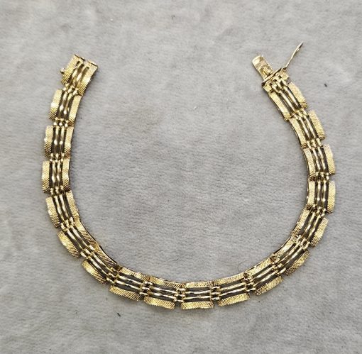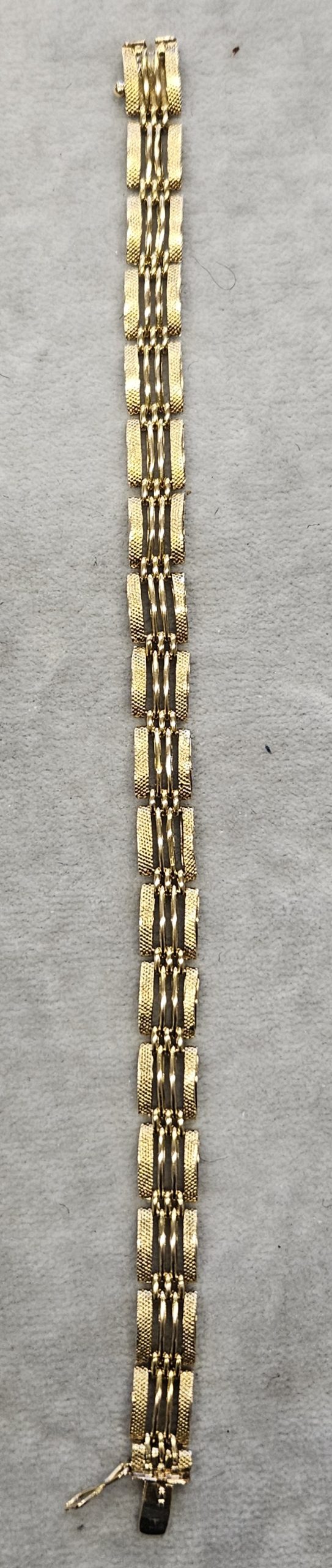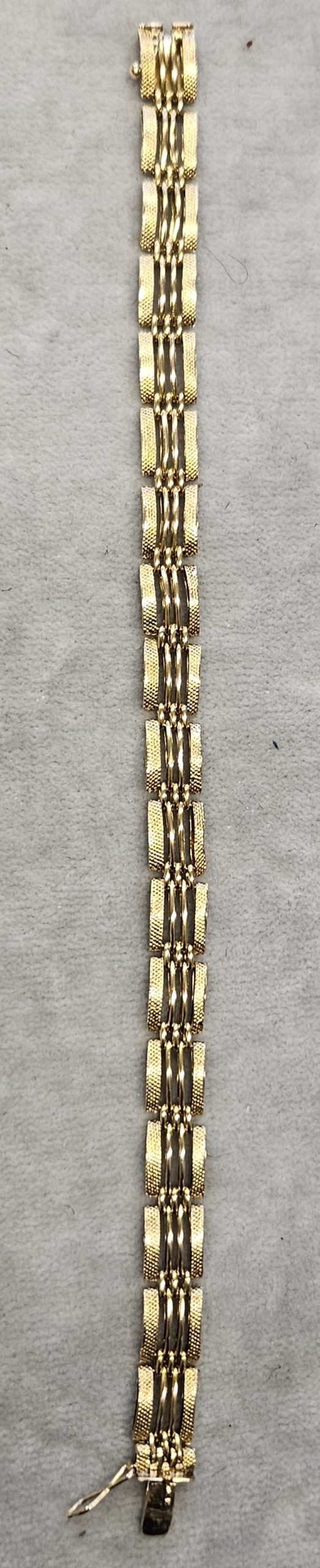 Bransoletka złota złoto pr. 3 (585) waga 10,55 g. długość 19,5 cm. szerokość 7,8 mm. cechowana głowa rycerza i 3 oraz monogram złotnika stara bransoletka Warszawa lata 20-30 ste XX w.