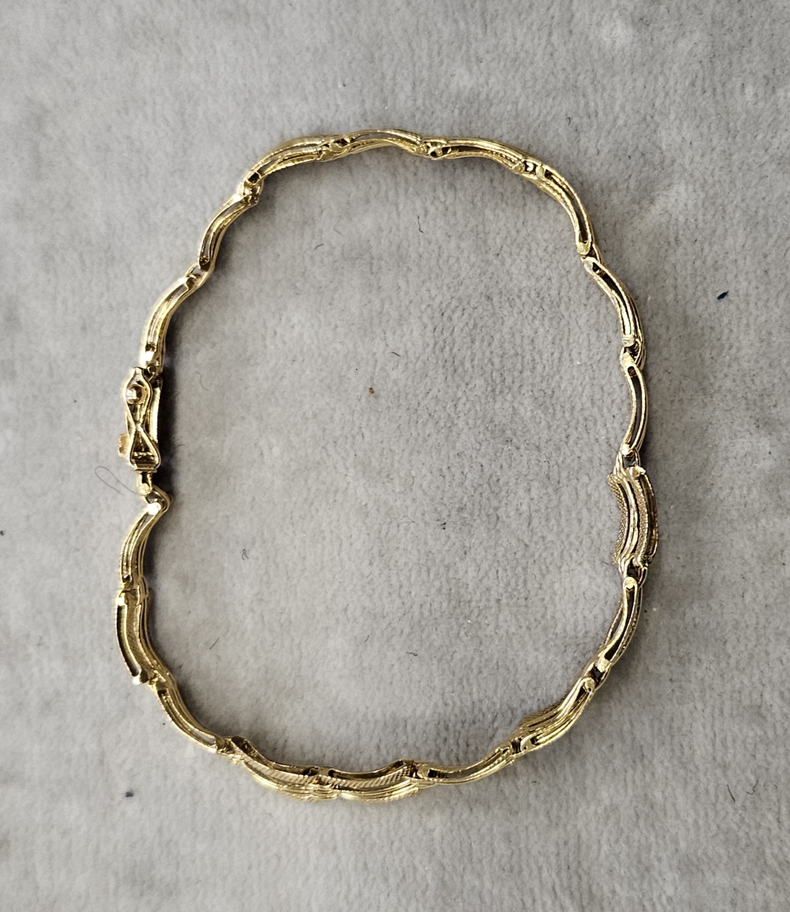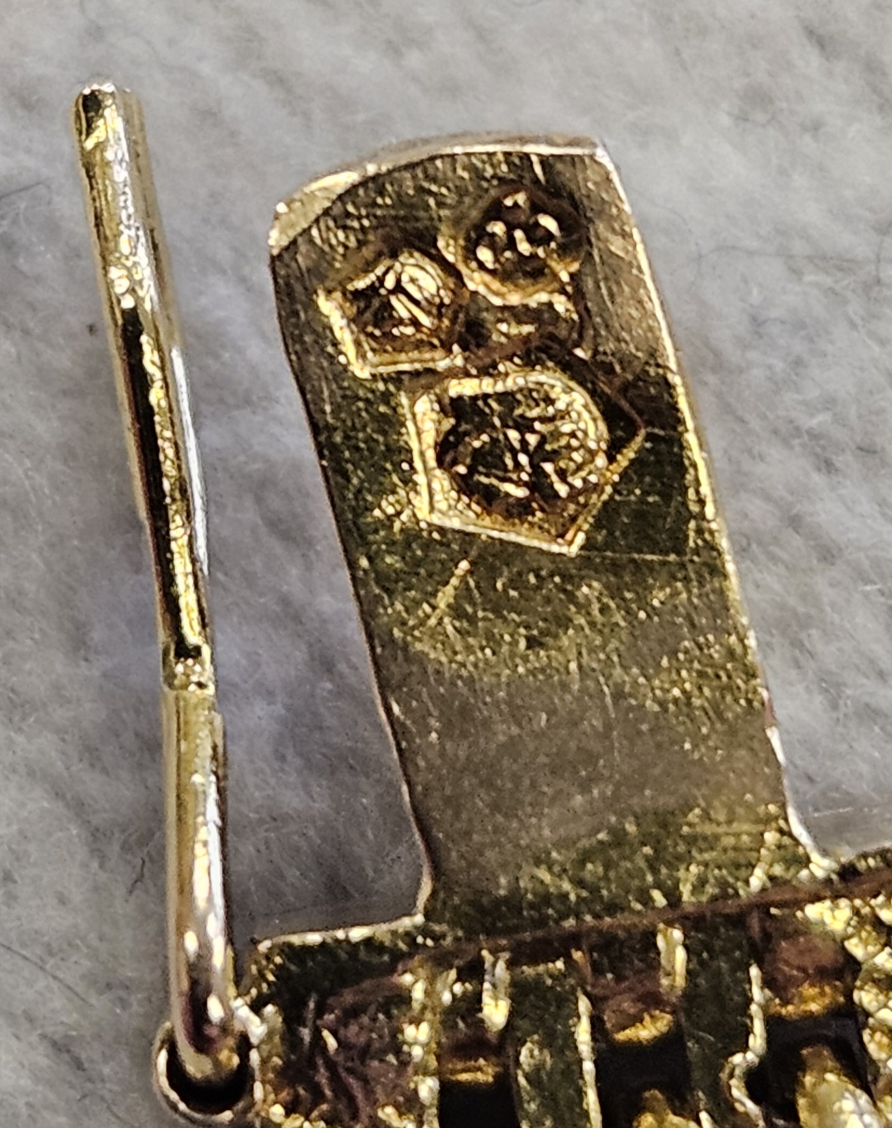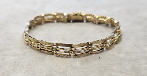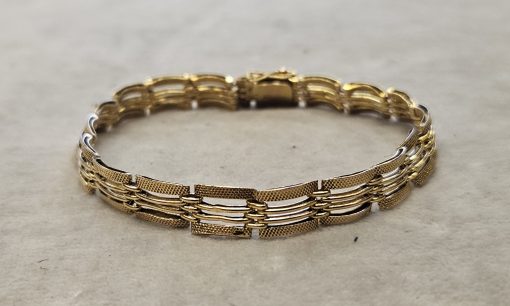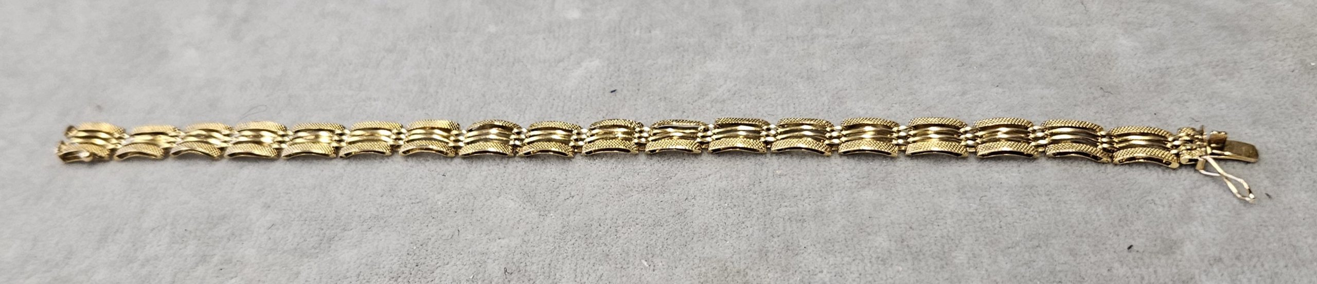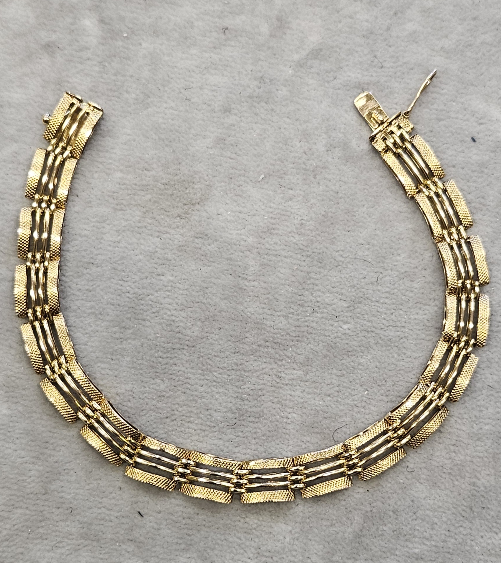 Bransoletka złota złoto pr. 3 (585) waga 10,55 g. długość 19,5 cm. szerokość 7,8 mm. cechowana głowa rycerza i 3 oraz monogram złotnika stara bransoletka Warszawa lata 20-30 ste XX w.