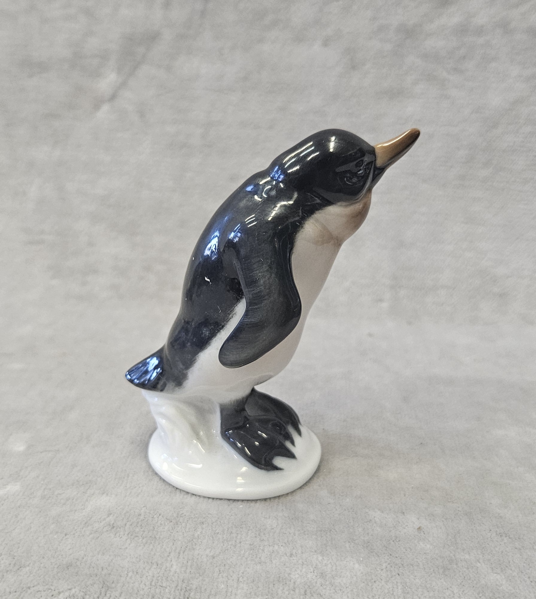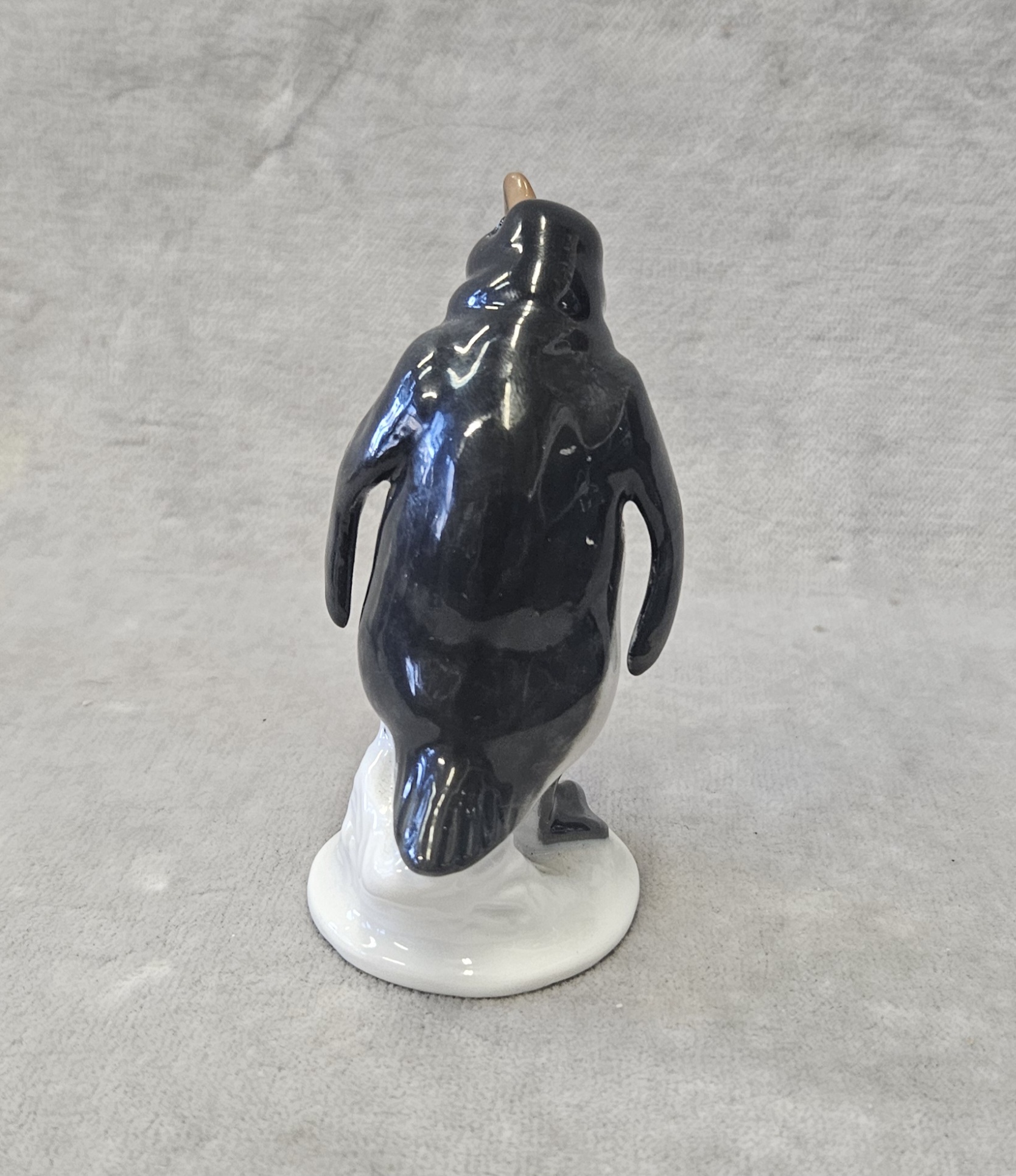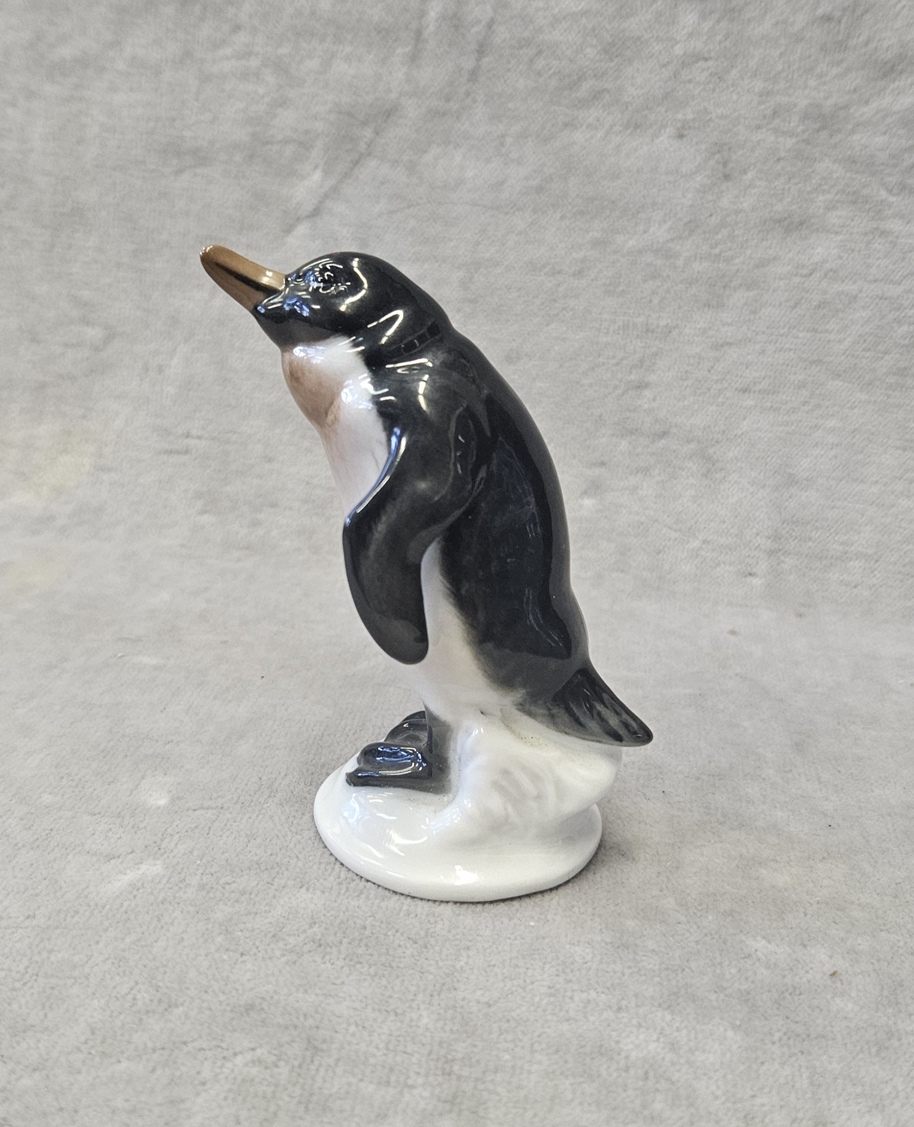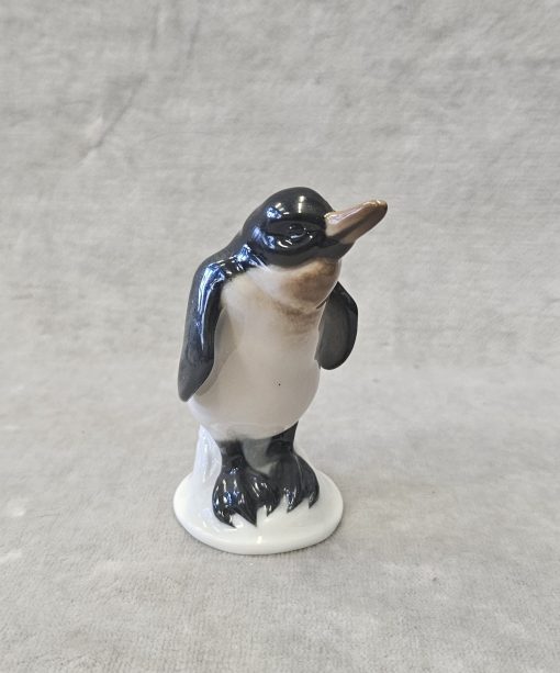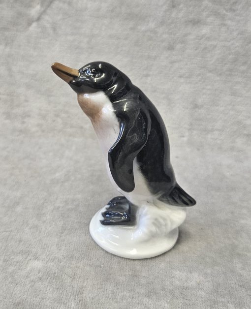 Figurka pingwina Rosenthal proj. Karl HIMMELSTOSS (1878 Wrocław – 1967 Monachium) , porcelana szkliwiona, malatury podszkliwne, wys. 8 cm. znak wytwórni na spodzie: Korona/Róże/Clasic Rose/ Rosenthal-group/Germany . sygn. w masie;396/1. Rosenthal proj. Karl HIMMELSTOSS (1878 Wrocław – 1967 Monachium) z 1934 r. lata 70 te. XX w.