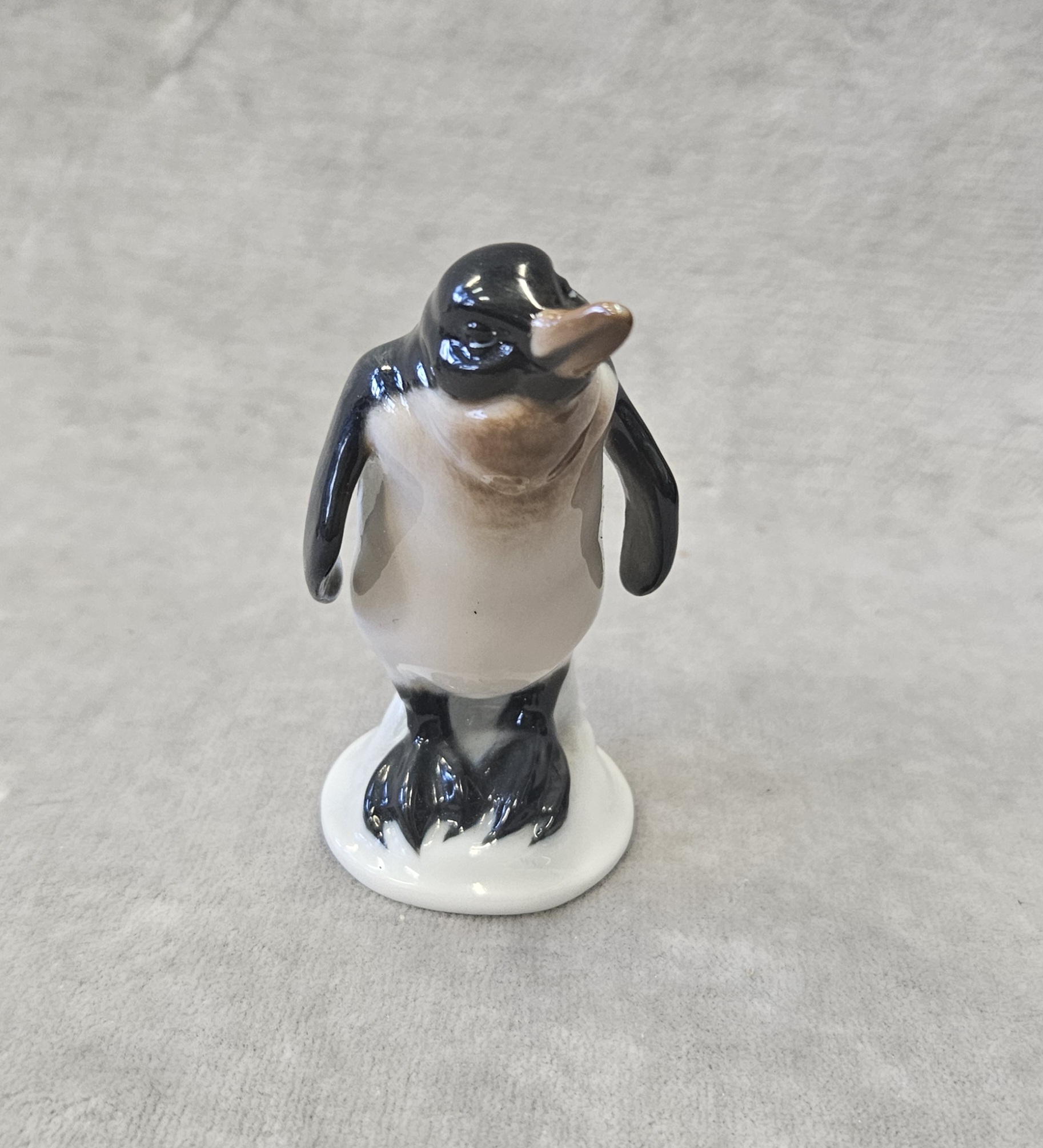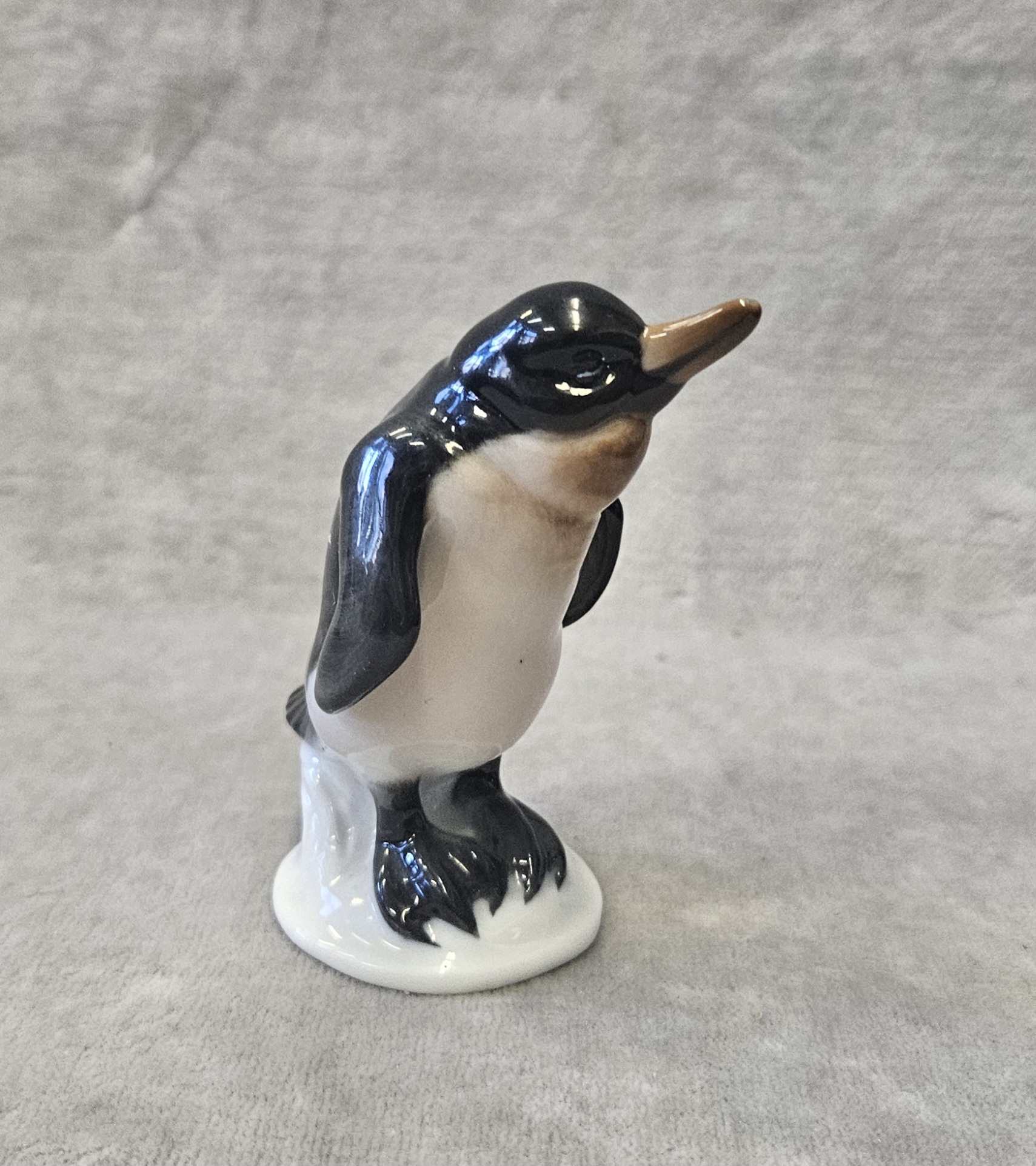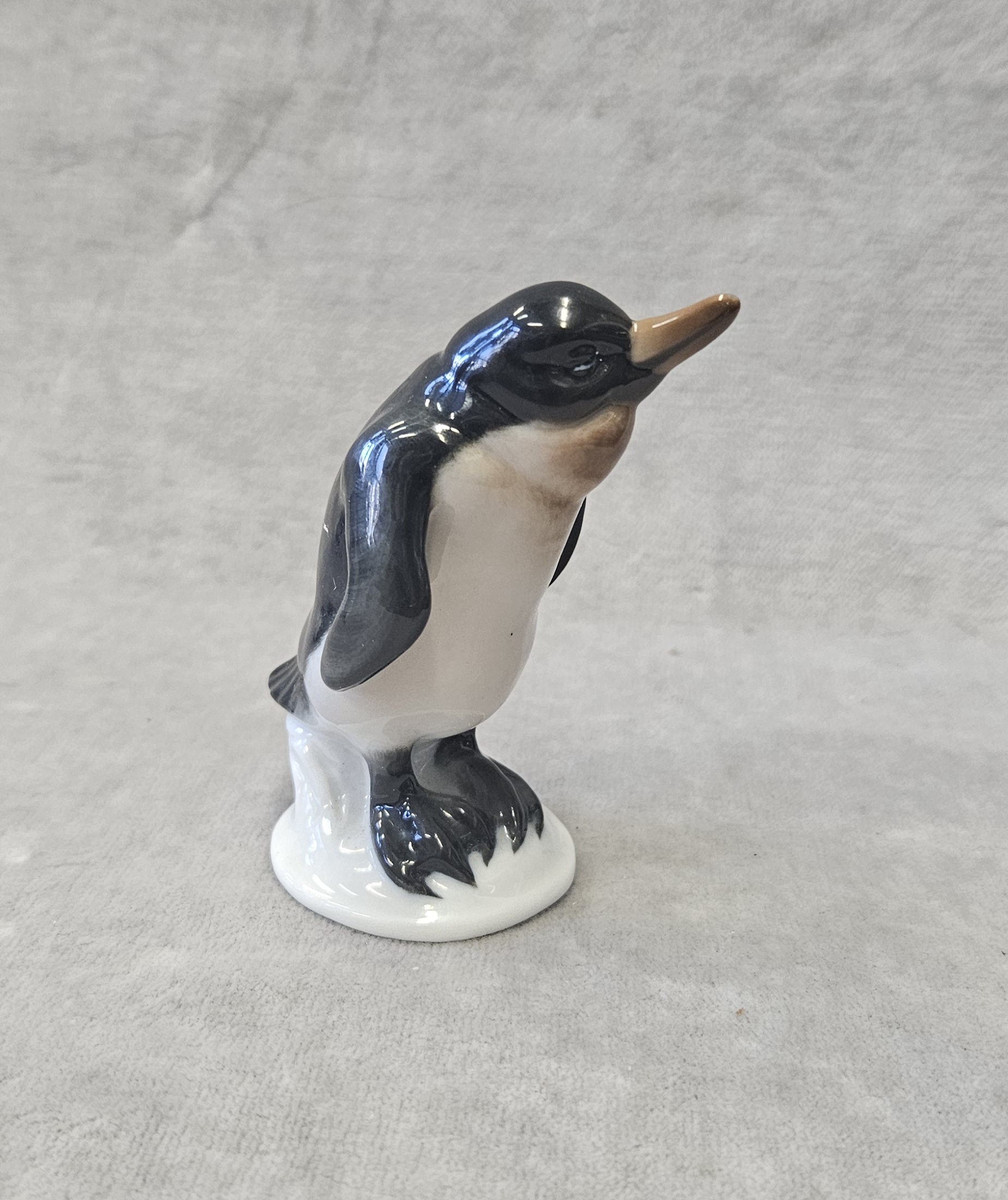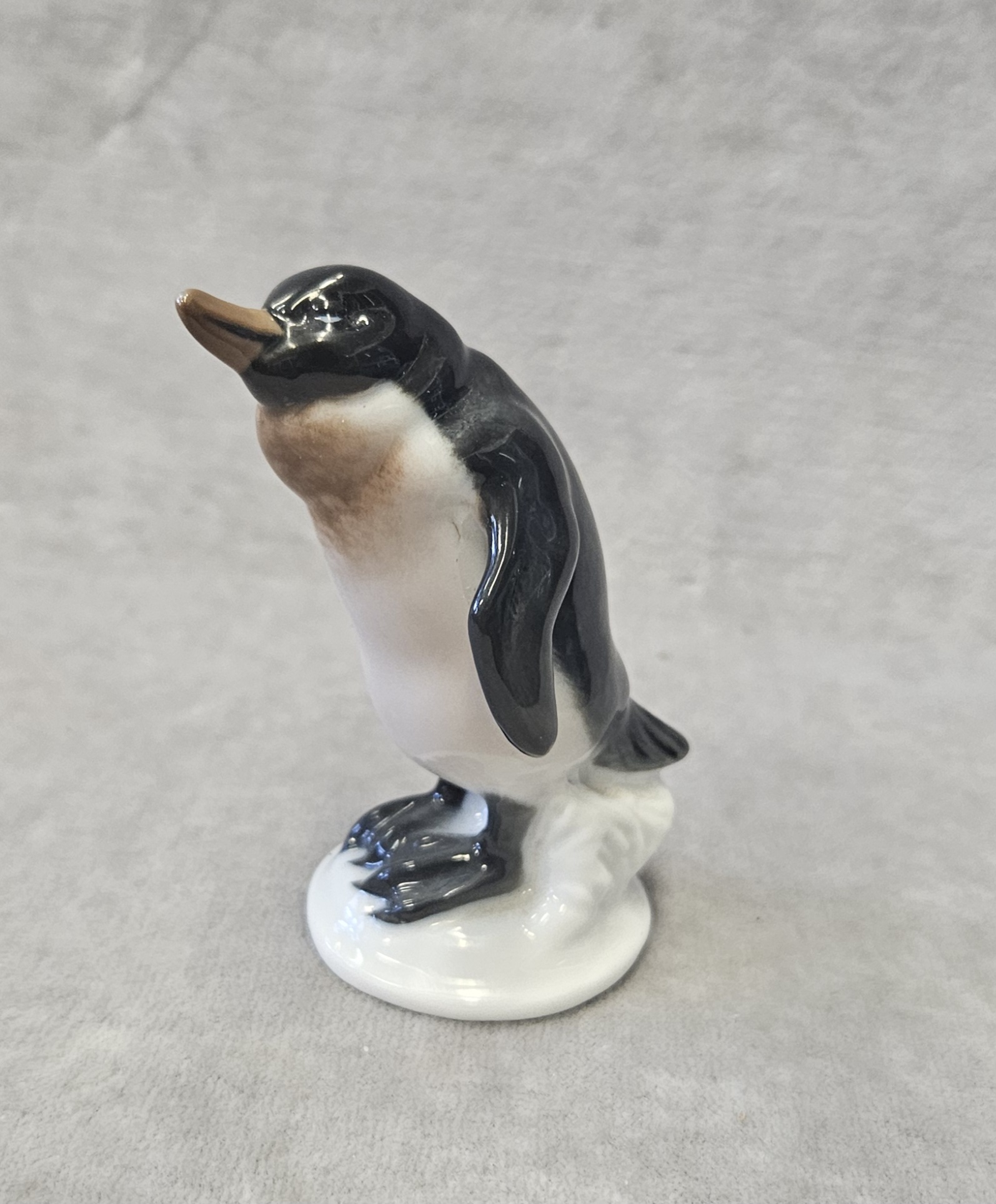 Figurka pingwina Rosenthal proj. Karl HIMMELSTOSS (1878 Wrocław – 1967 Monachium) , porcelana szkliwiona, malatury podszkliwne, wys. 8 cm. znak wytwórni na spodzie: Korona/Róże/Clasic Rose/ Rosenthal-group/Germany . sygn. w masie;396/1. Rosenthal proj. Karl HIMMELSTOSS (1878 Wrocław – 1967 Monachium) z 1934 r. lata 70 te. XX w.