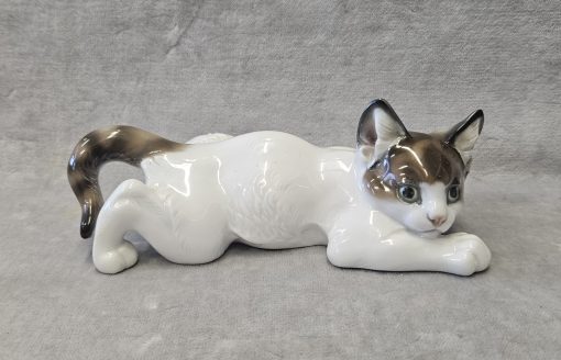 Kot porcelanowy Rosenthal, Th.Karner Kotek porcelanowy Rosenthal, Th.Karner . Figura porcelanowa, malowana podszkliwnie, wym. 6,5x16x8,5  cm. Sygnowany zielenią chromu, druk podszkliwny: korona /Rosenthal/Germany/ handgemalt wycisk w masie Th.KÄRNER oraz 60 , Bawaria, Rosenthal, lata 50-te XX w.