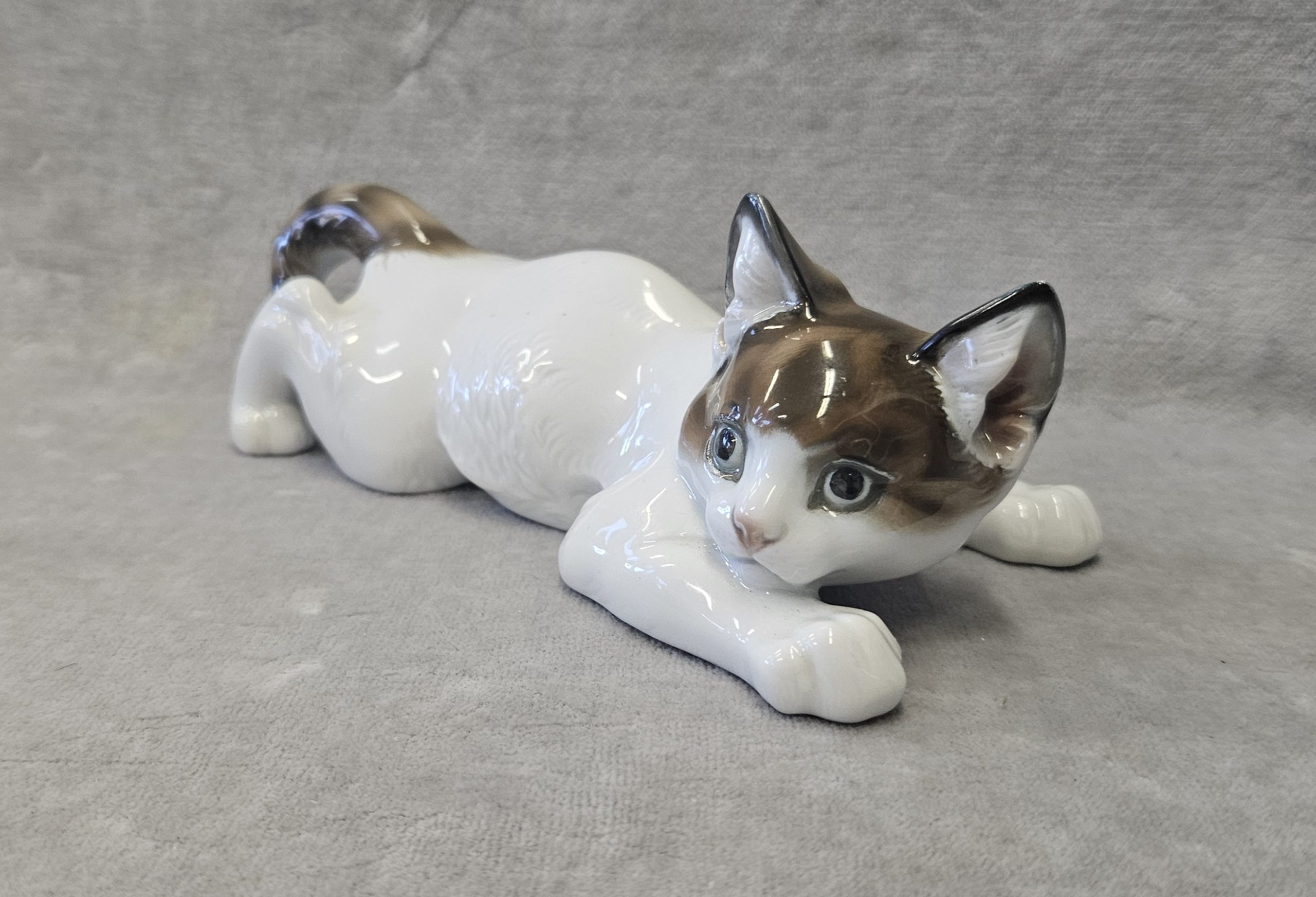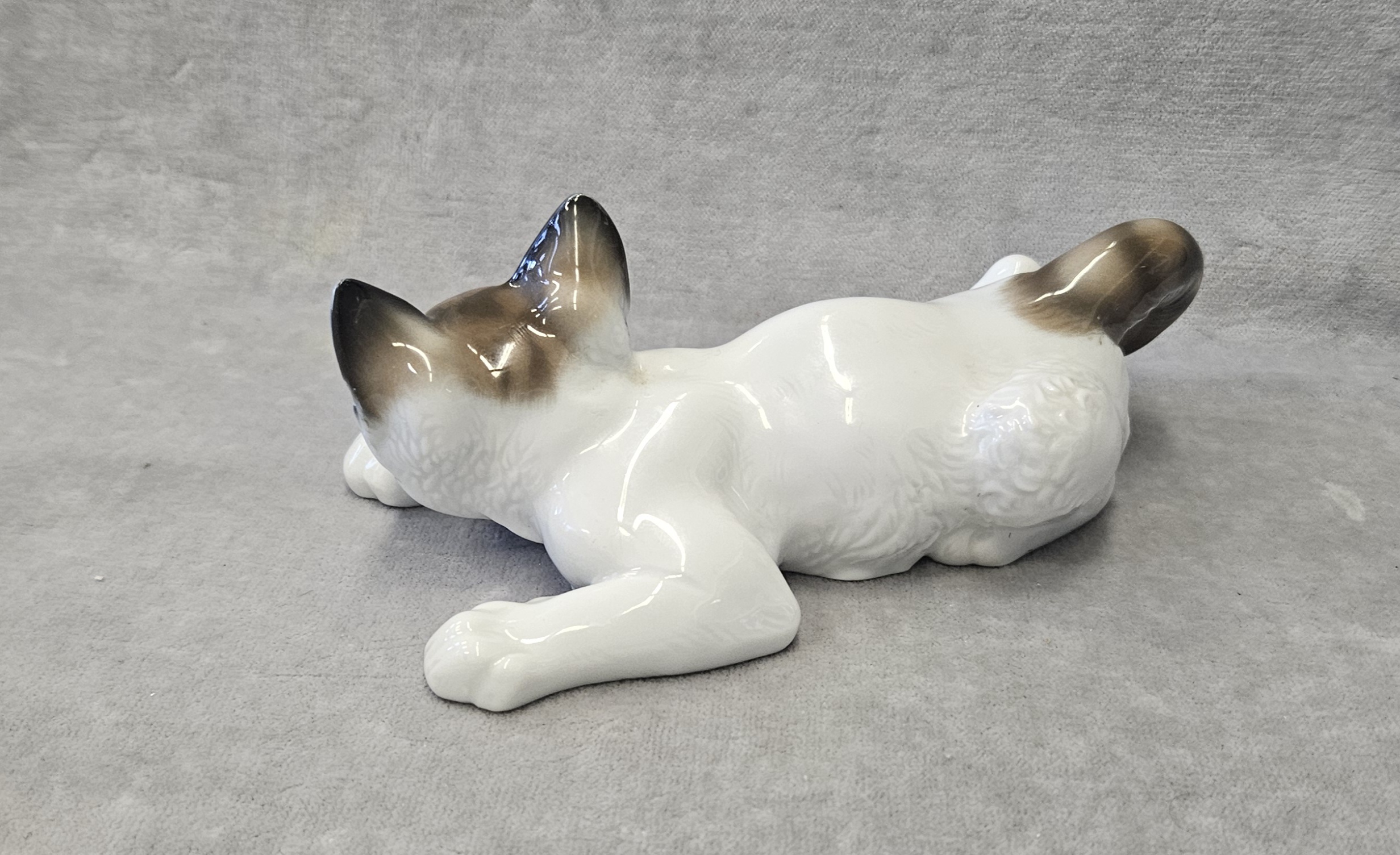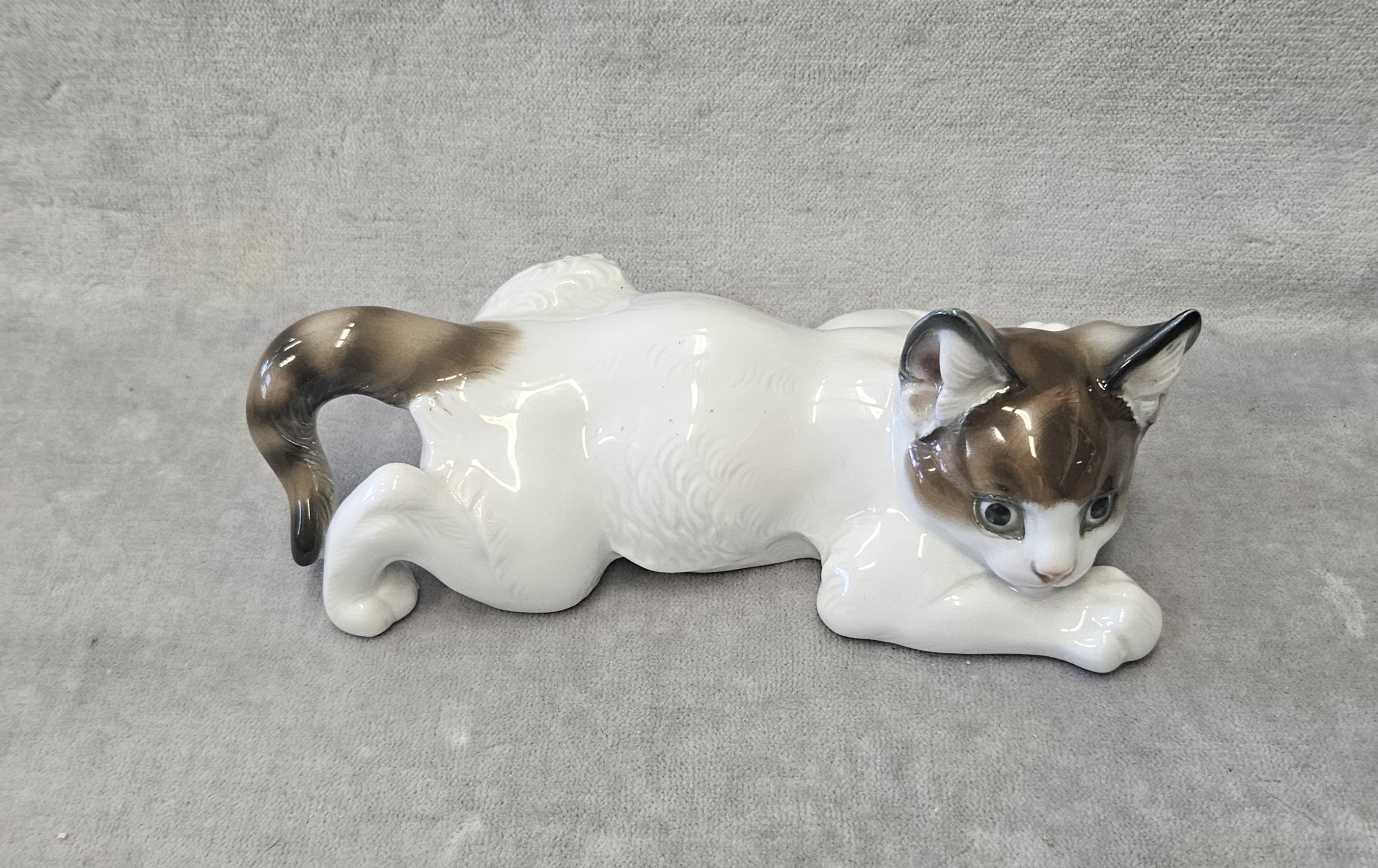 Kot porcelanowy Rosenthal, Th.Karner Kotek porcelanowy Rosenthal, Th.Karner . Figura porcelanowa, malowana podszkliwnie, wym. 6,5x16x8,5  cm. Sygnowany zielenią chromu, druk podszkliwny: korona /Rosenthal/Germany/ handgemalt wycisk w masie Th.KÄRNER oraz 60 , Bawaria, Rosenthal, lata 50-te XX w.