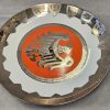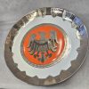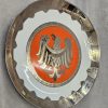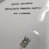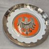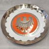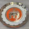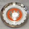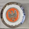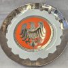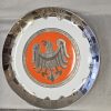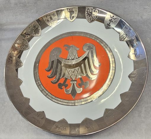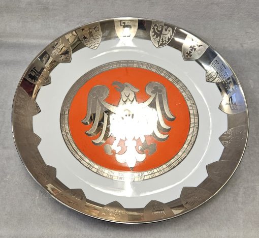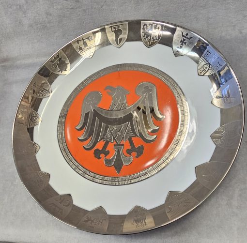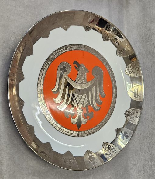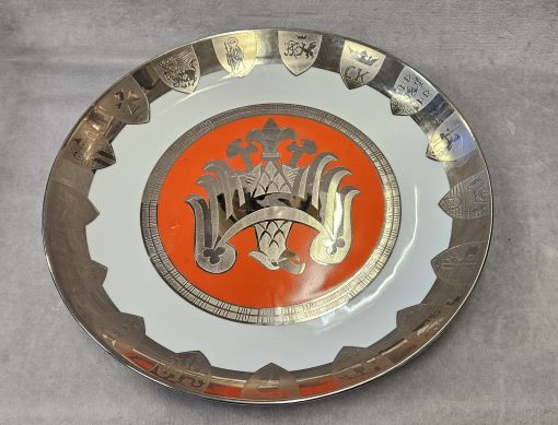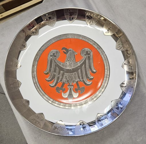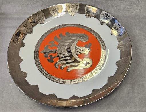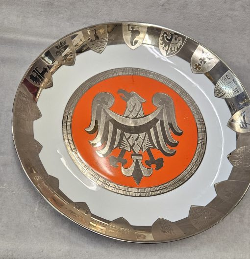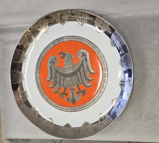 Talerz dekoracyjny z herbami miast porcelana, farby naszkliwne, inkrustacja błyszcząca i matowa – pokryta platyną, dekoracja wykonana ręcznie; w obręczy dennej otwory do zawieszania; wys. 3,8 cm, średn. 32 cm;