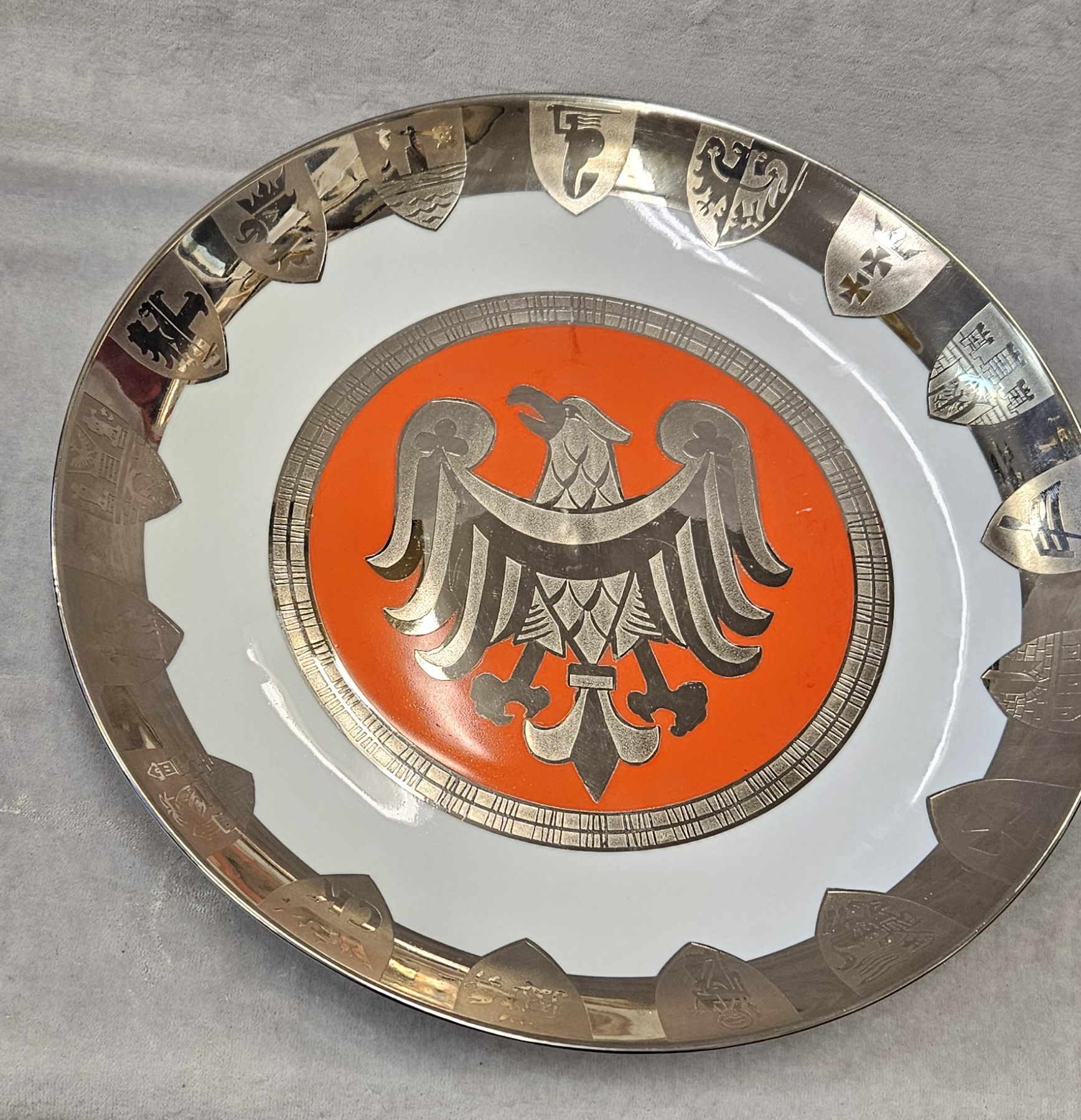 Talerz dekoracyjny z herbami miast porcelana, farby naszkliwne, inkrustacja błyszcząca i matowa – pokryta platyną, dekoracja wykonana ręcznie; w obręczy dennej otwory do zawieszania; wys. 3,8 cm, średn. 32 cm;