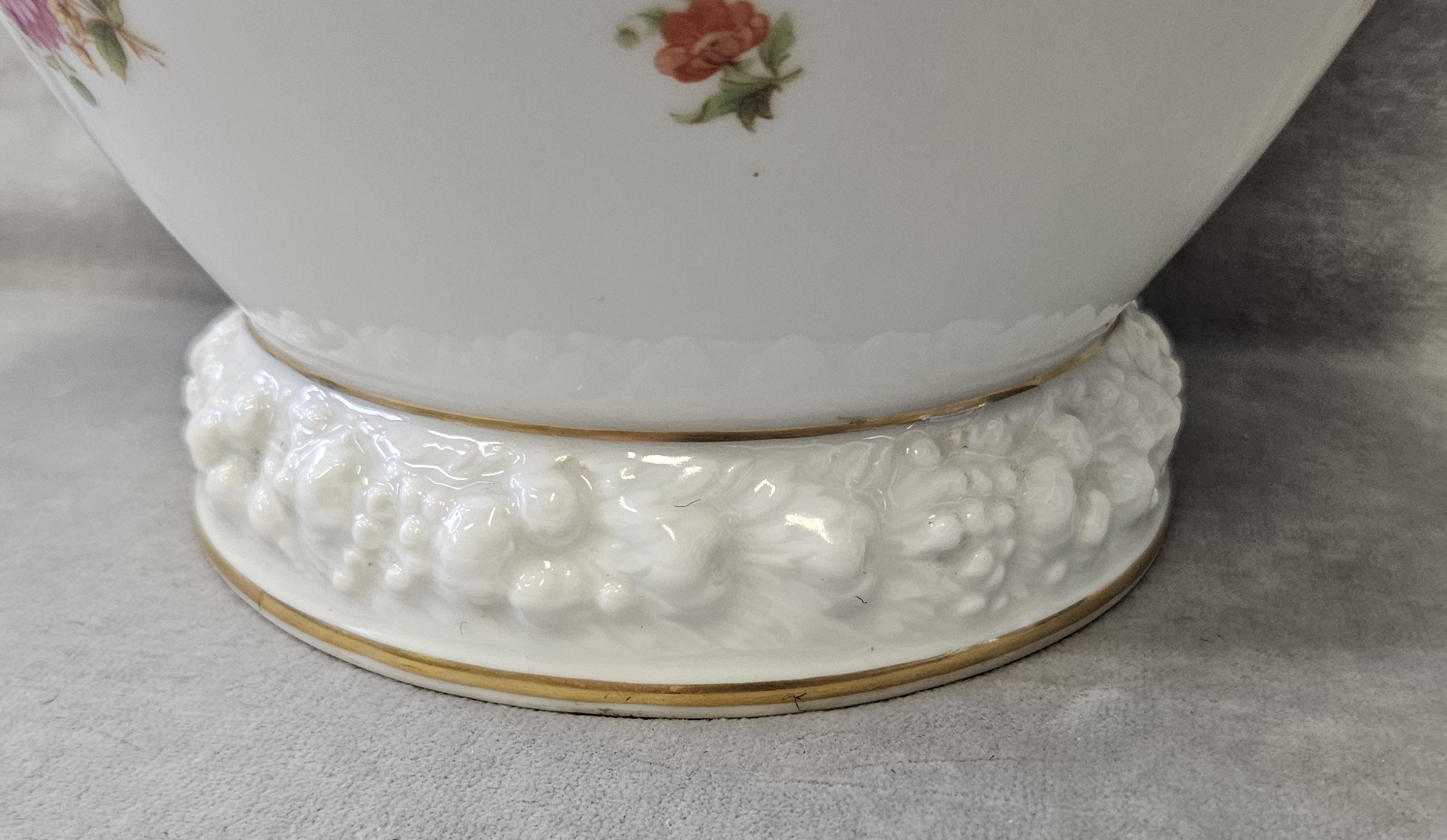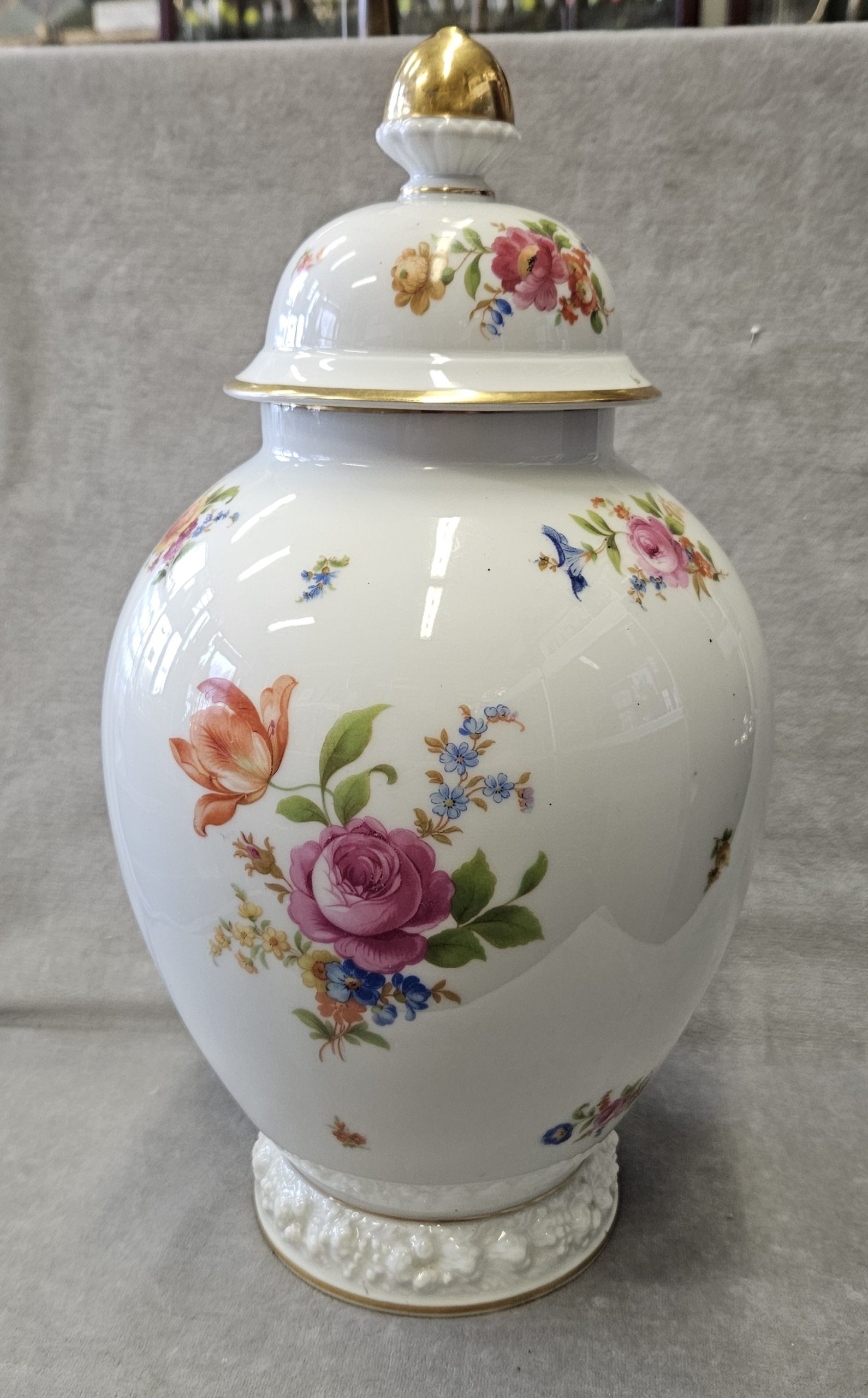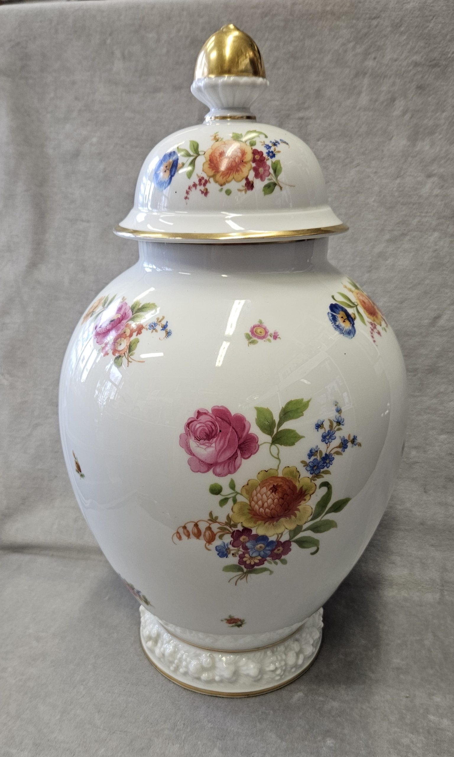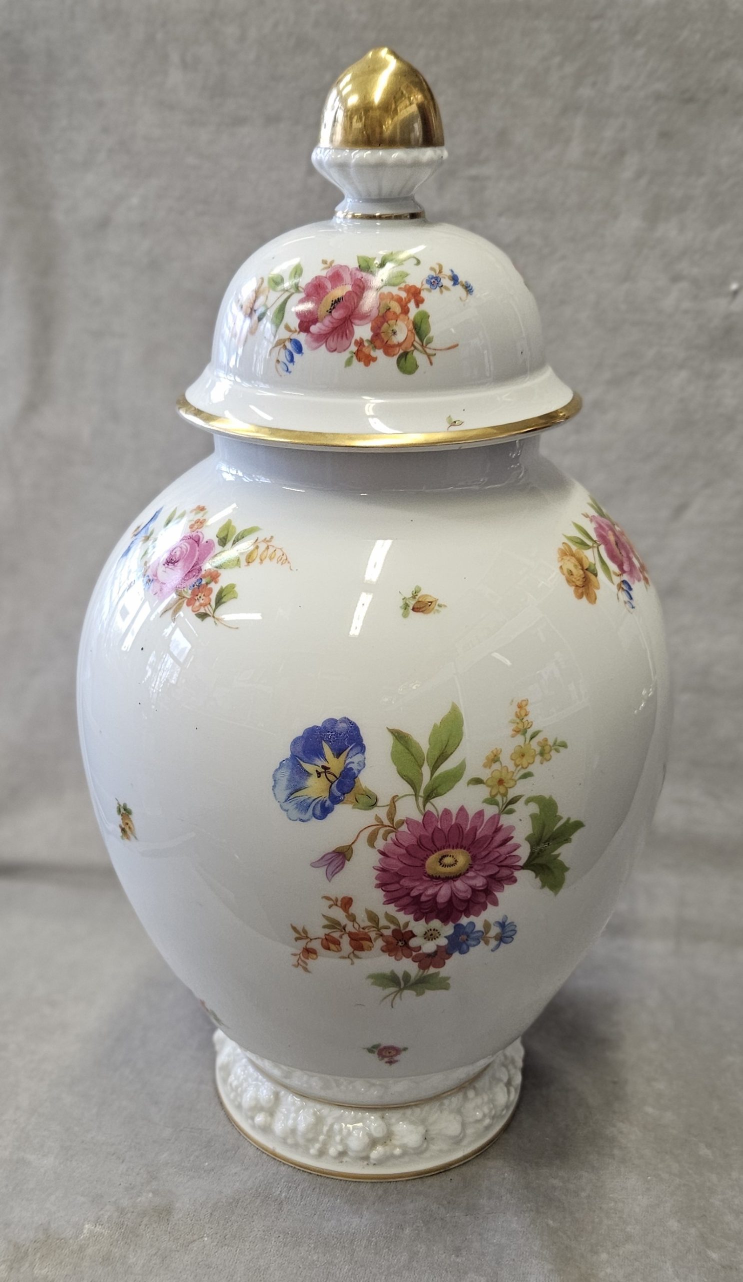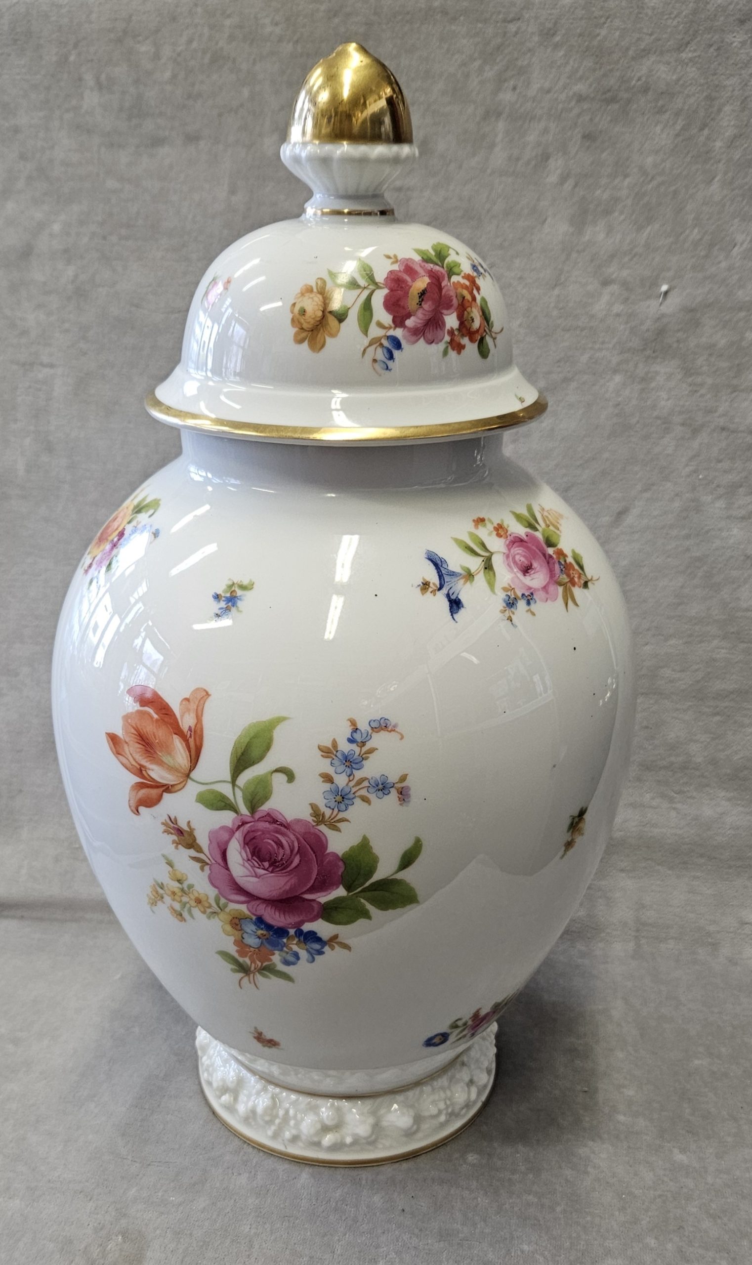 Wazon z pokrywką Rosenthal Maria 1936 r. amfora Wazon potiche z pokrywą, porcelana, farby naszkliwne – druk barwny, złocenia; wys. 41cm, średn .podstawy 13,4 cm; sygn. zielenią chromu druk: korona 2-dzielna / Rosenthal / SELB – GERMANY / dwie kropki. Niemcy, Selb (Bawaria), Rosenthal model Maria 1936 r. Zainteresowanych Proszę o kontakt w sprawie kosztów przesyłki