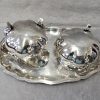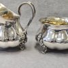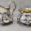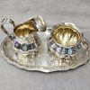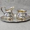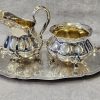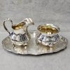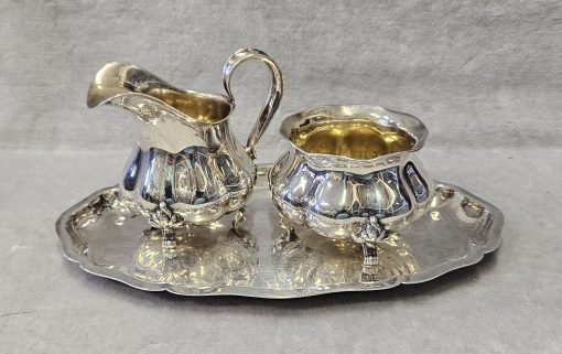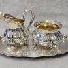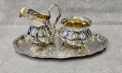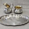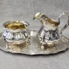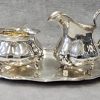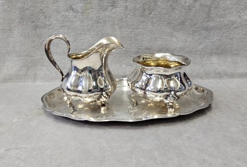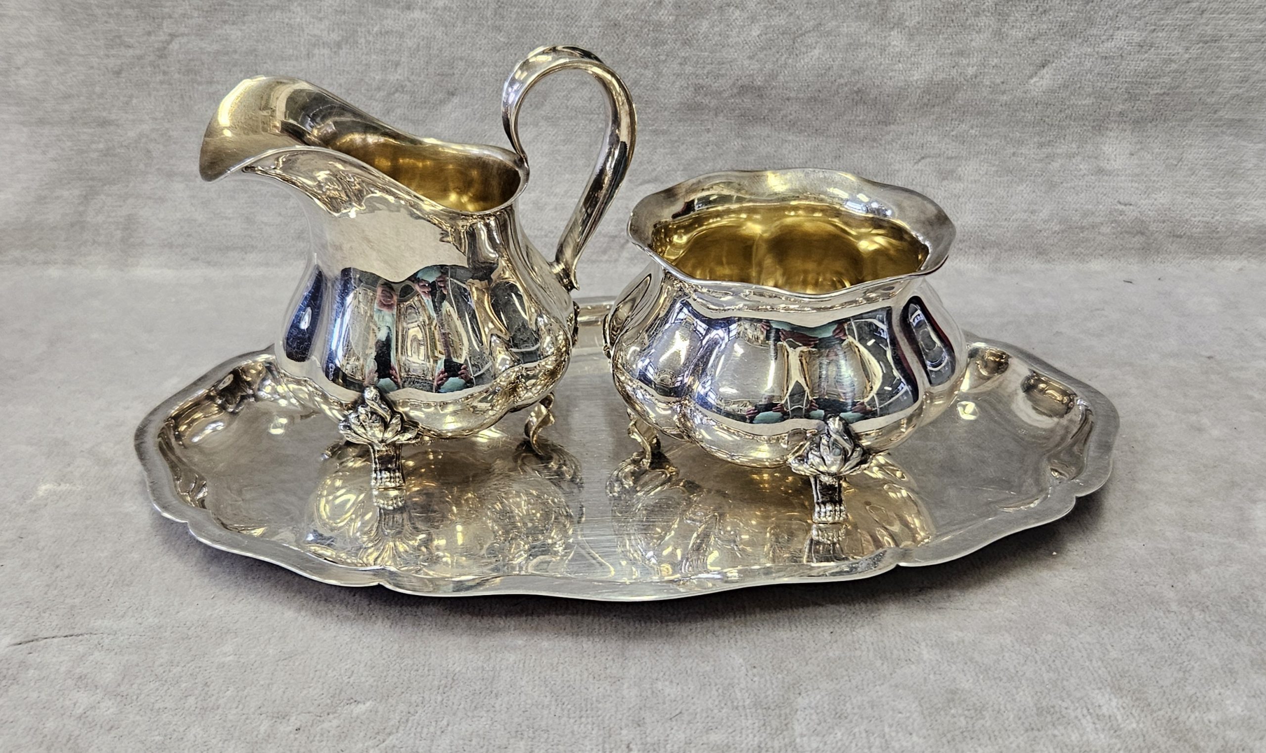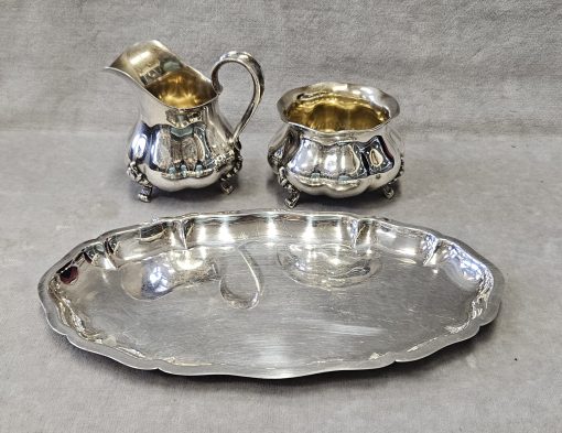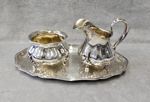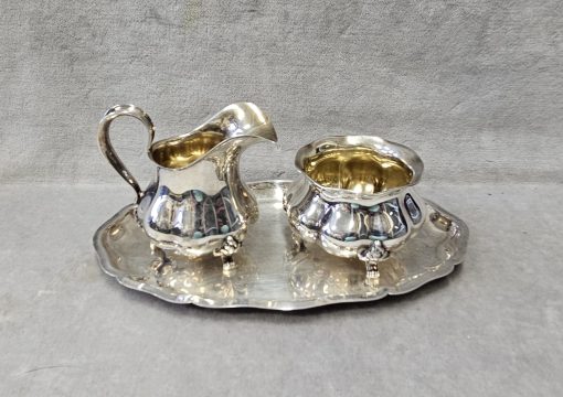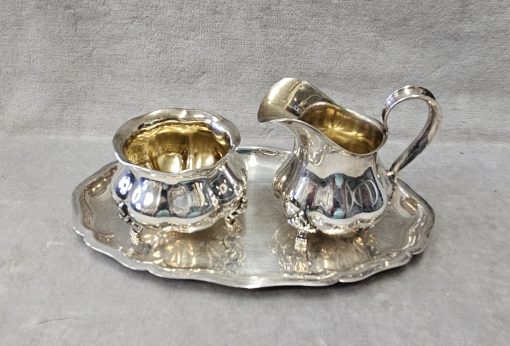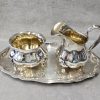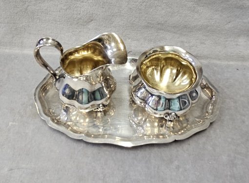 Komplet srebrny cukiernica mlecznik tacka Sterling srebro pr. 925, waga 272 g. cukierniczka 5,5×7,5 cm., mlecznik 8c8,5 cm., taca 20,5×12,5 cm., zestaw srebrny złocony cechowany’ 925 STERLING , Lew.