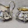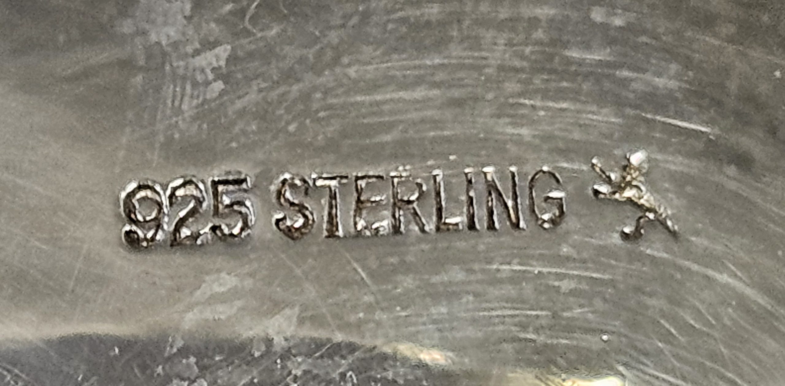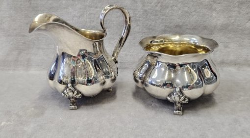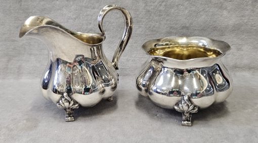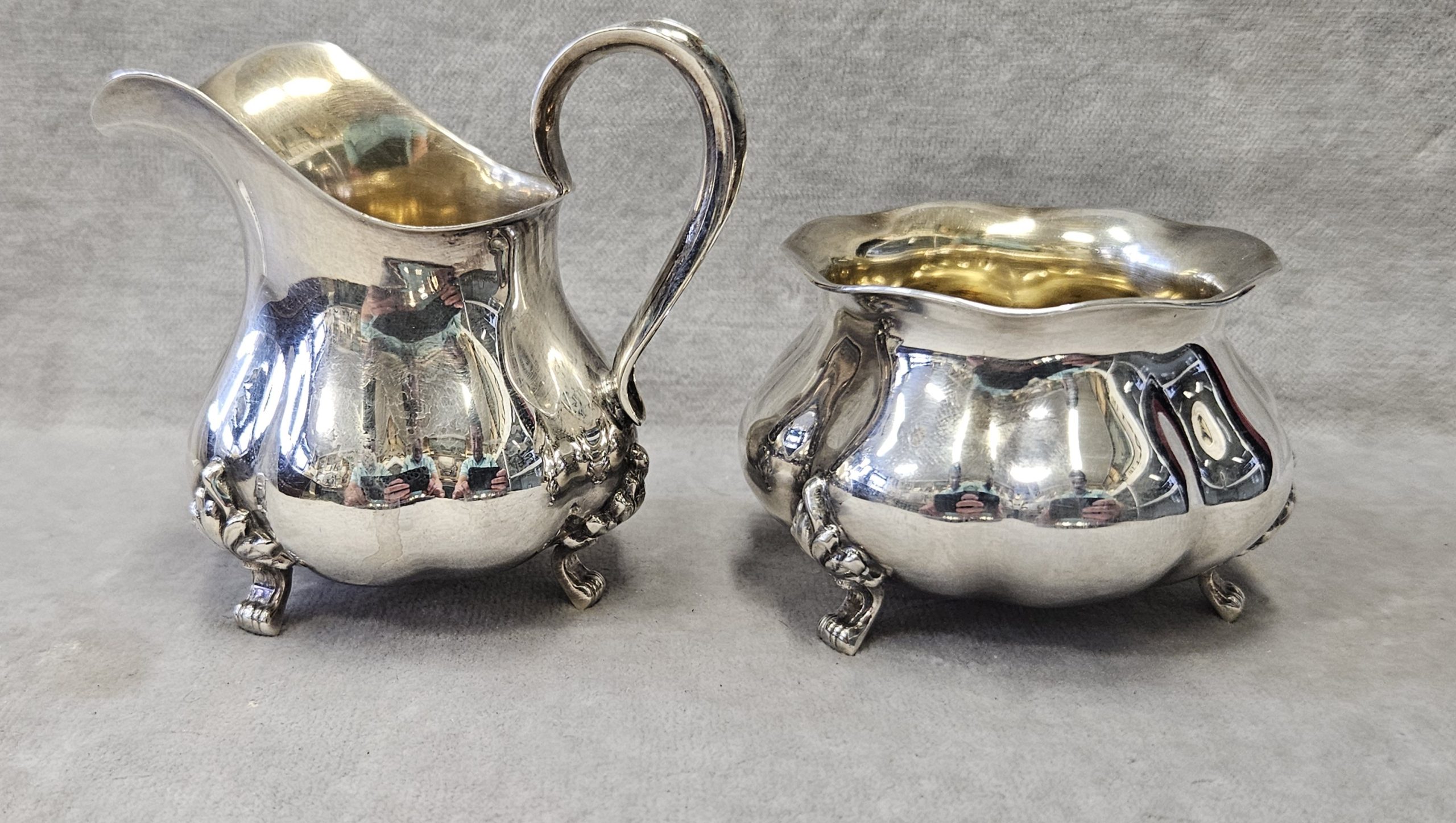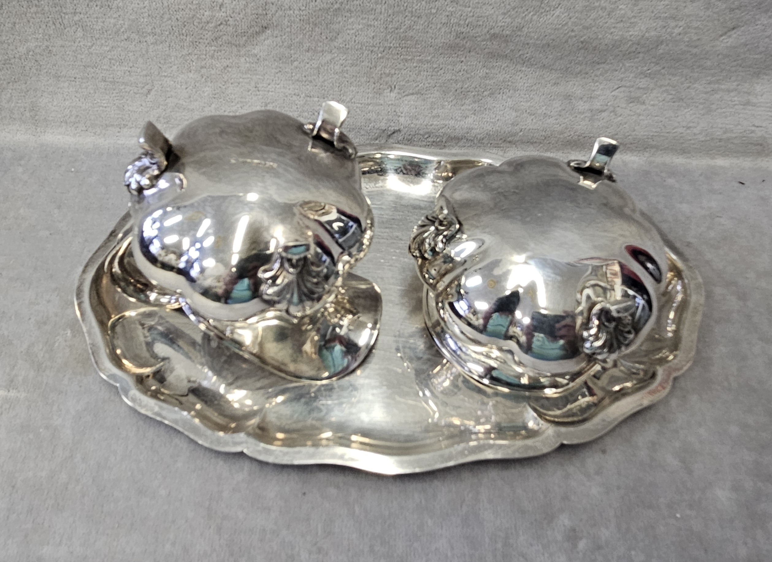 Komplet srebrny cukiernica mlecznik tacka Sterling srebro pr. 925, waga 272 g. cukierniczka 5,5×7,5 cm., mlecznik 8c8,5 cm., taca 20,5×12,5 cm., zestaw srebrny złocony cechowany’ 925 STERLING , Lew.