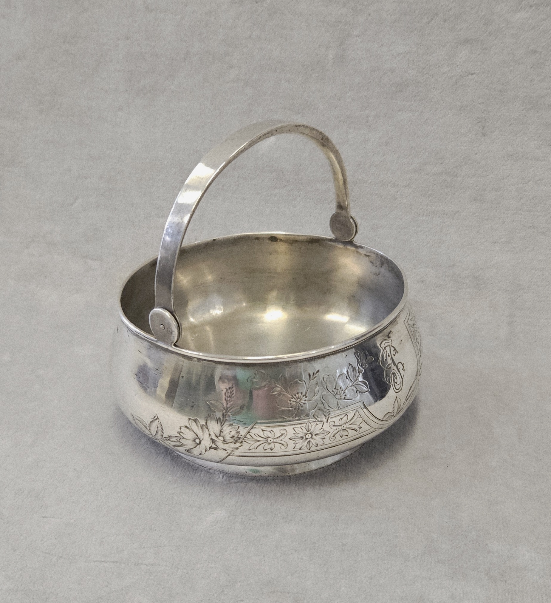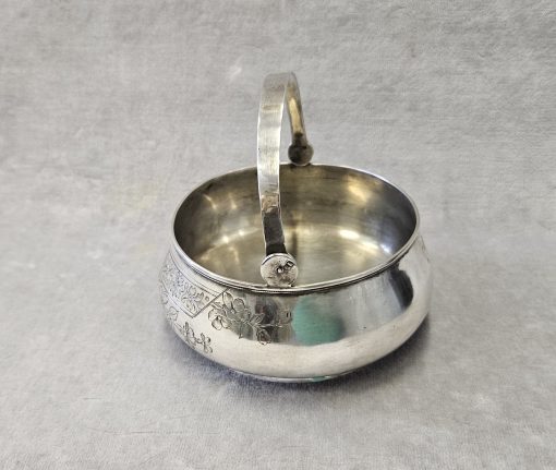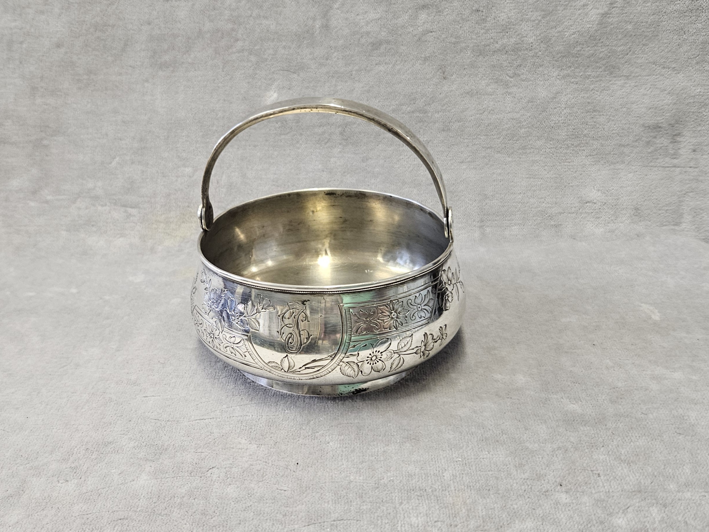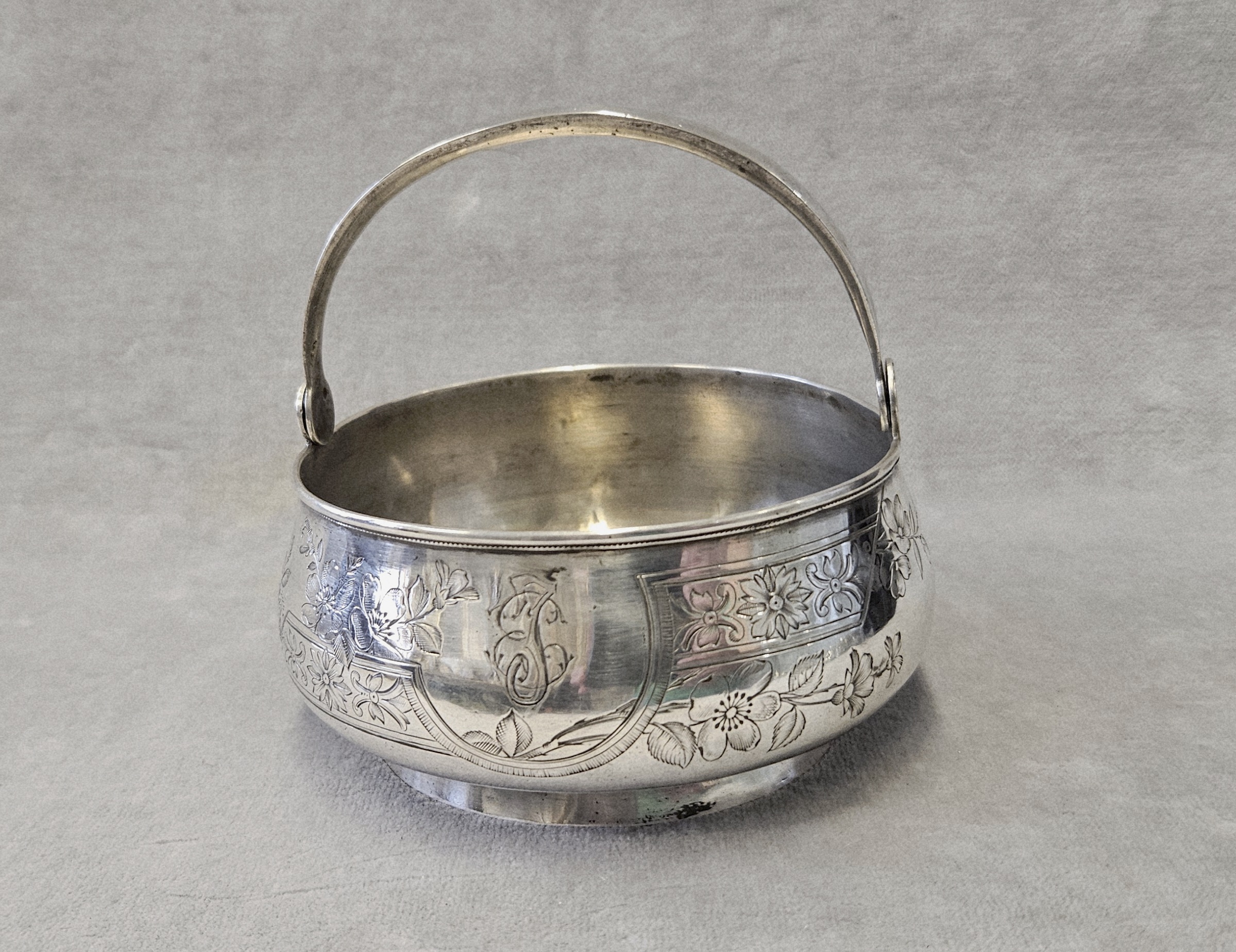 Cukierniczka w formie koszyczka srebro, złocone, pr. 84, wys. 5 cm. (z uchwytem 10,5 cm) śr. 10,5 cm.; waga 145 gr; cech. w owalu: 84, głowa w kokoszniku, ИЛ; CA złotnik, ИЛ probierz Iwan Siergiejewicz Liebiedkin; CA Sergiej Iwanowicz Agafonow Rosja, Moskwa lata 1899-1908