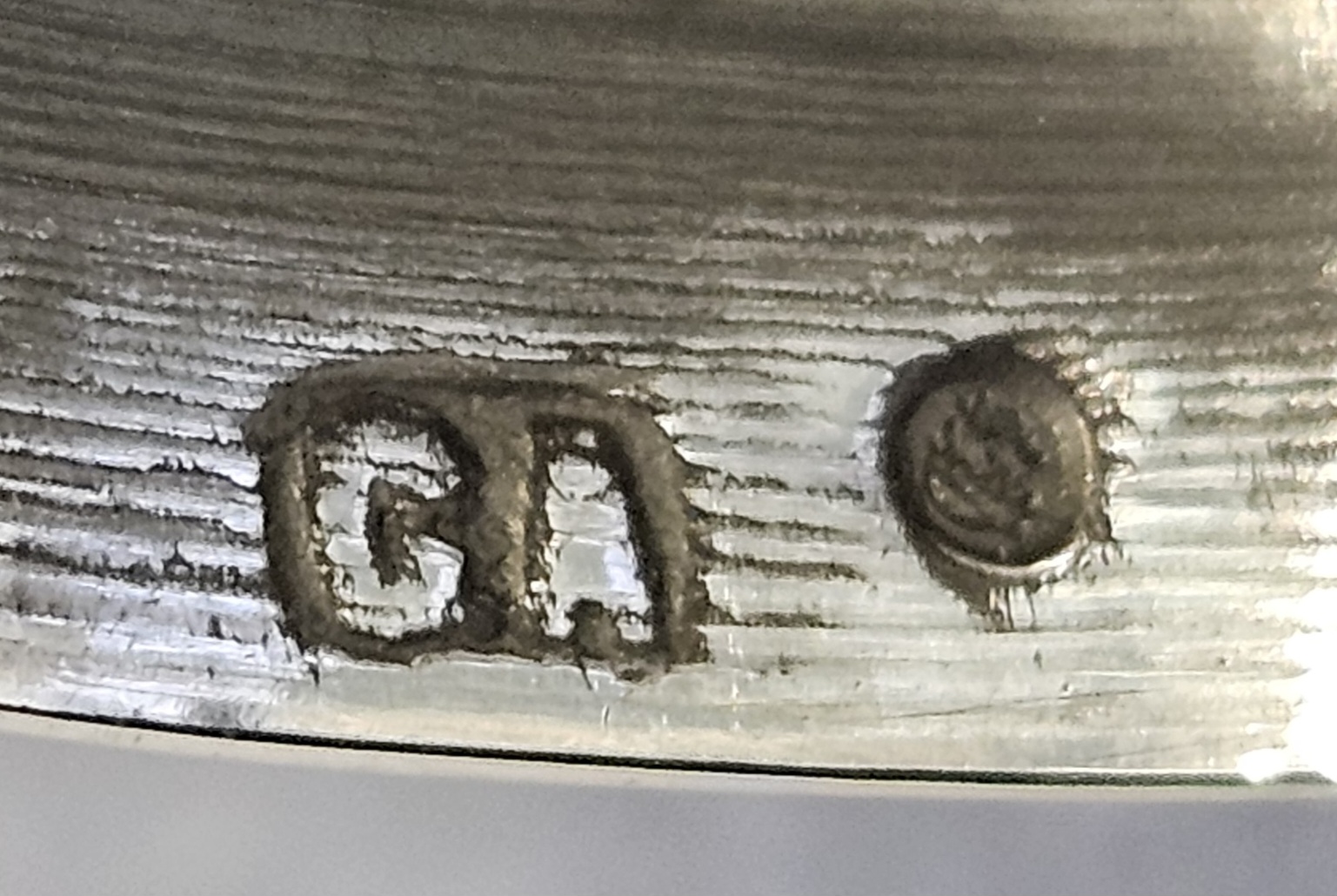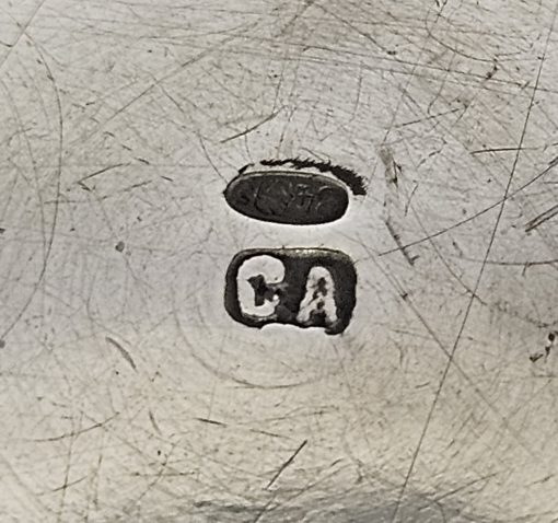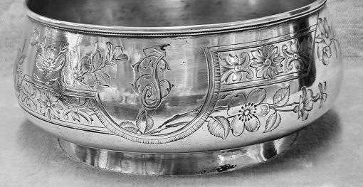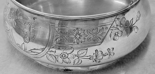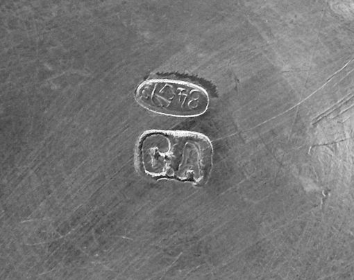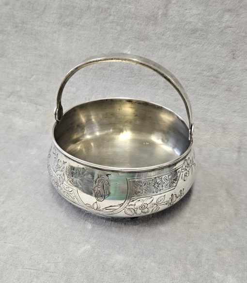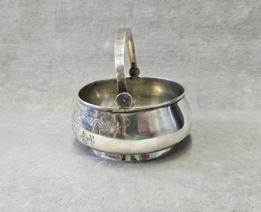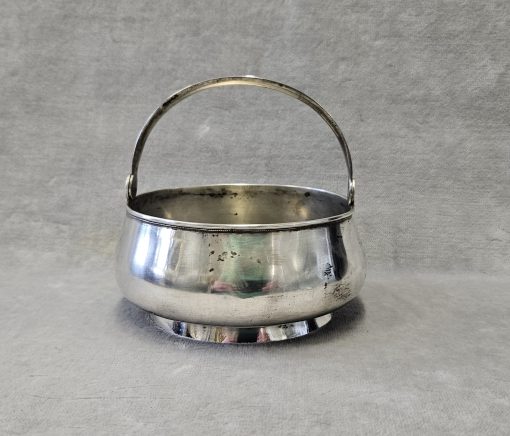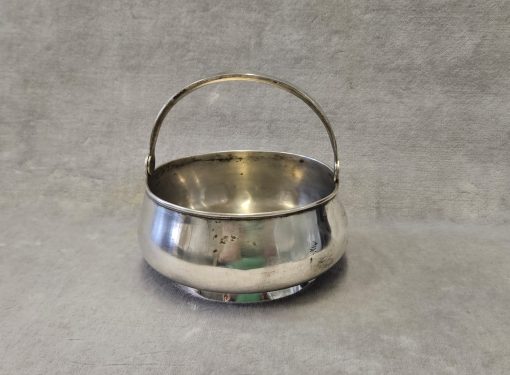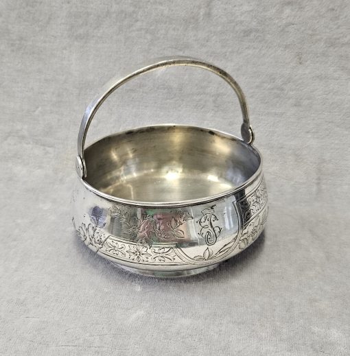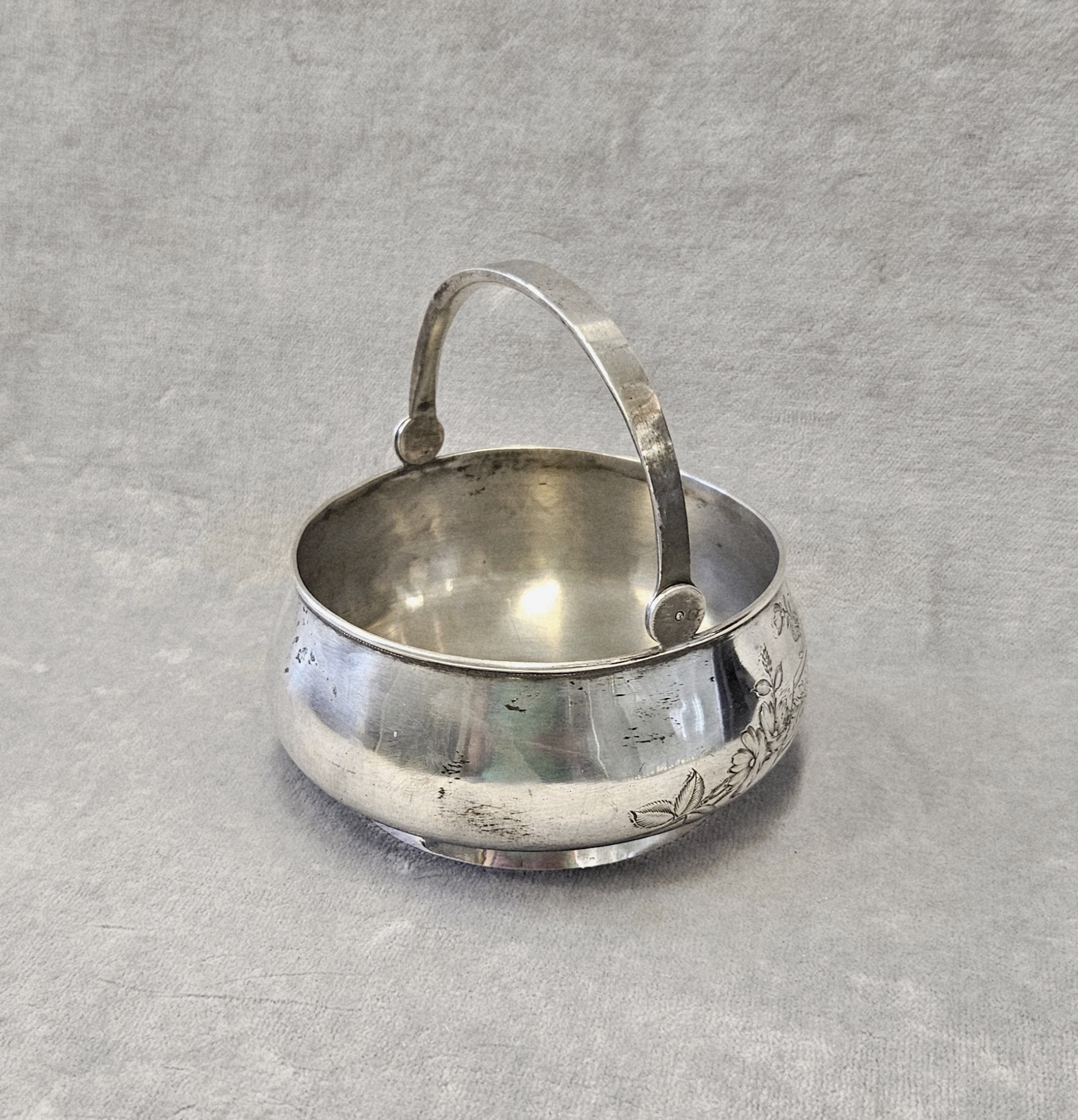 Cukierniczka w formie koszyczka srebro, złocone, pr. 84, wys. 5 cm. (z uchwytem 10,5 cm) śr. 10,5 cm.; waga 145 gr; cech. w owalu: 84, głowa w kokoszniku, ИЛ; CA złotnik, ИЛ probierz Iwan Siergiejewicz Liebiedkin; CA Sergiej Iwanowicz Agafonow Rosja, Moskwa lata 1899-1908