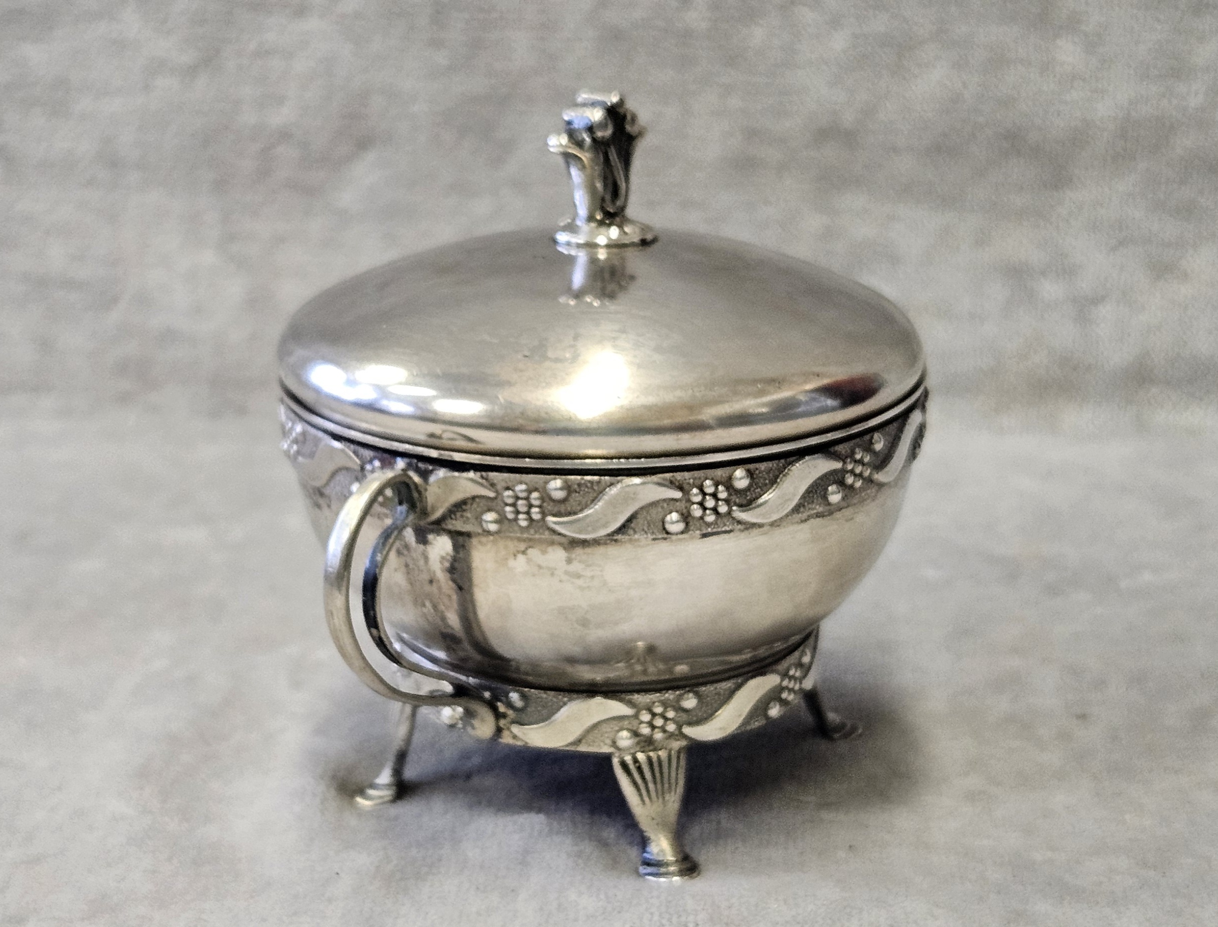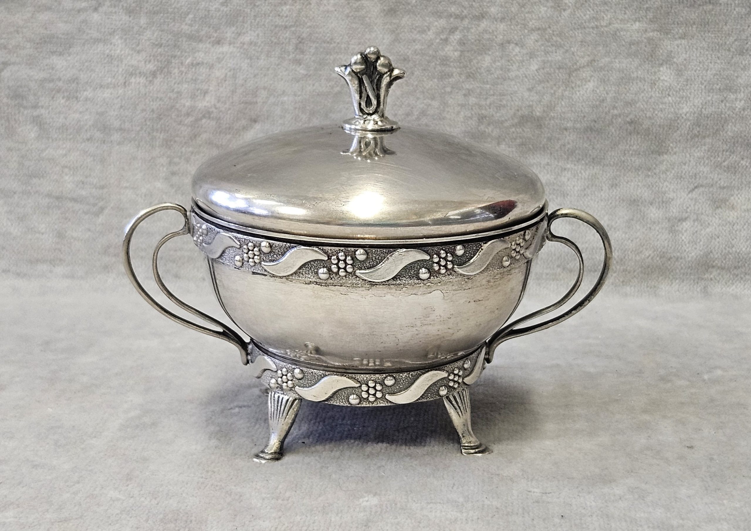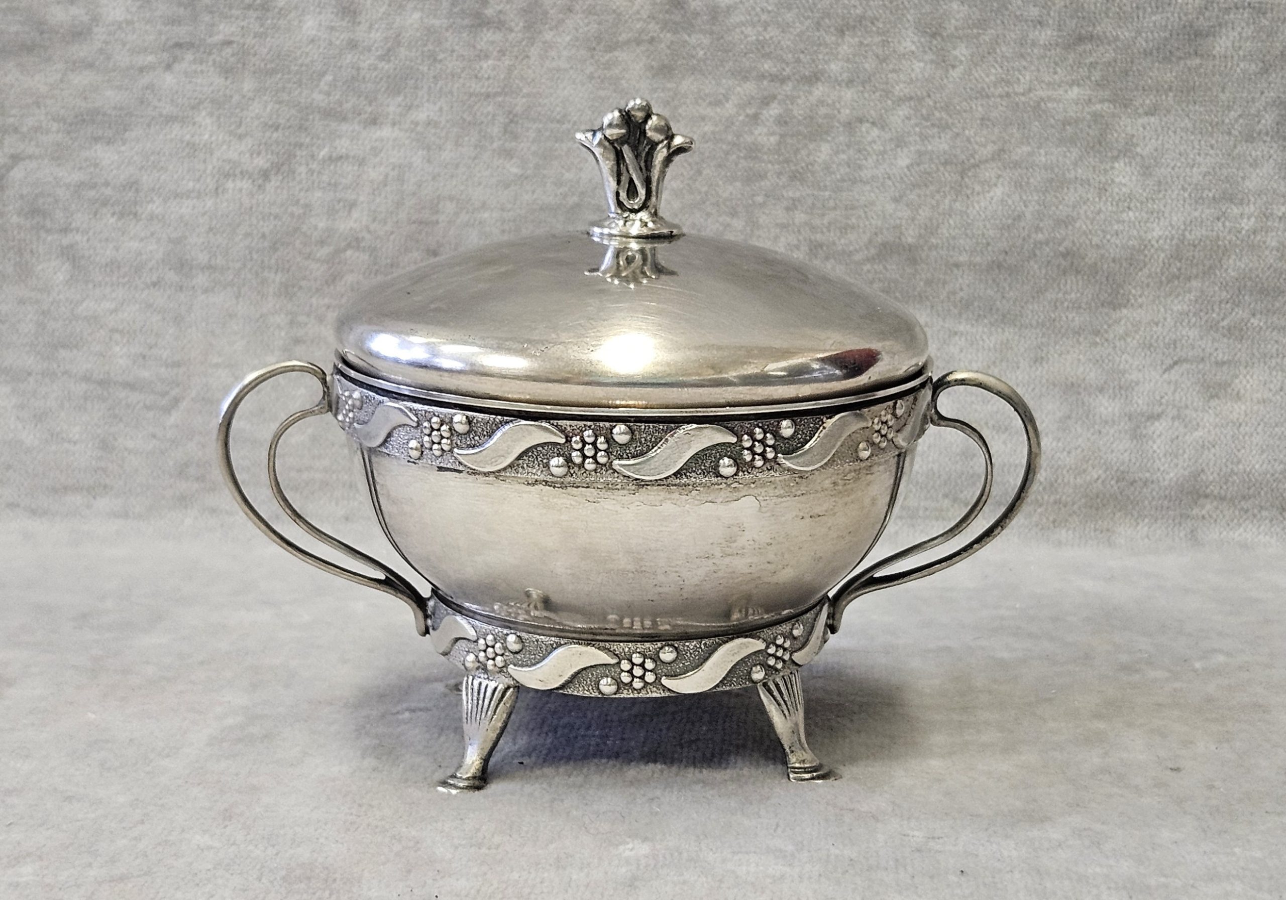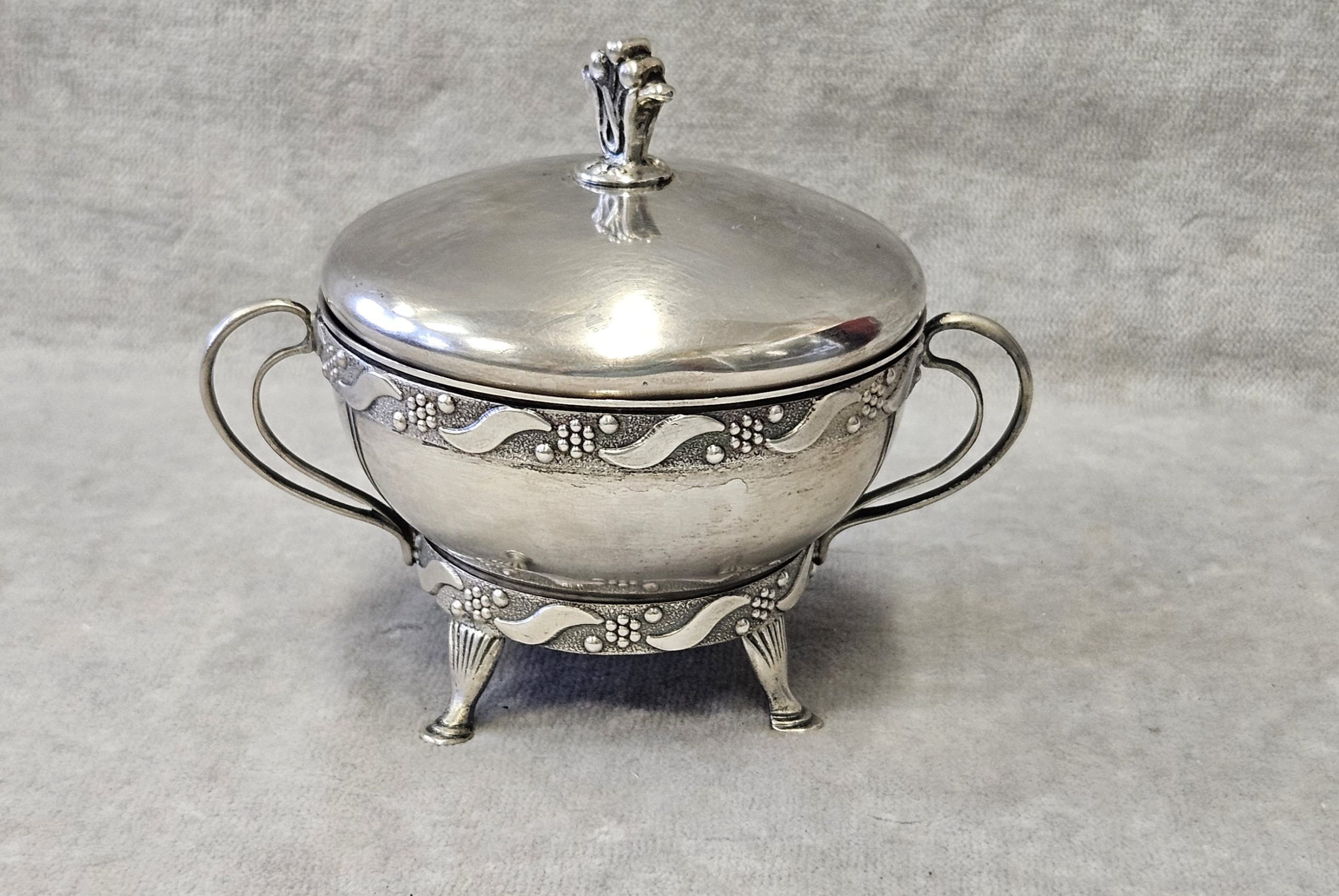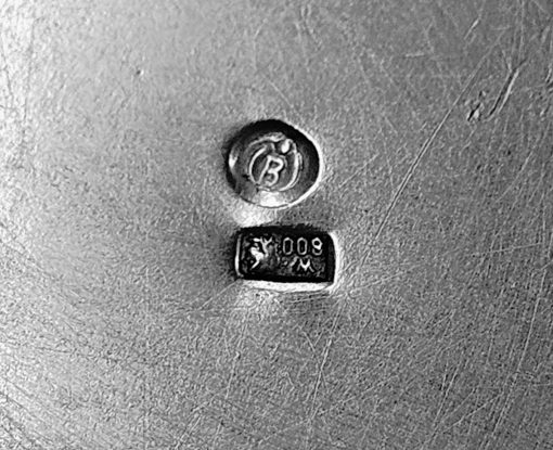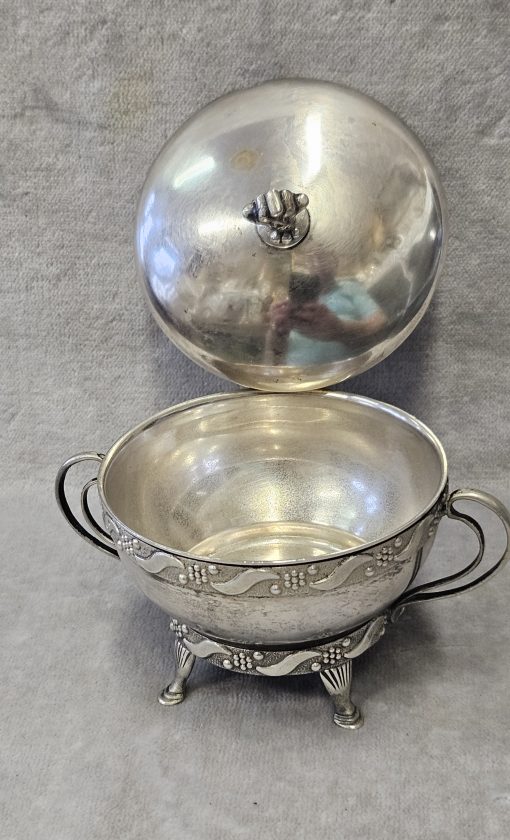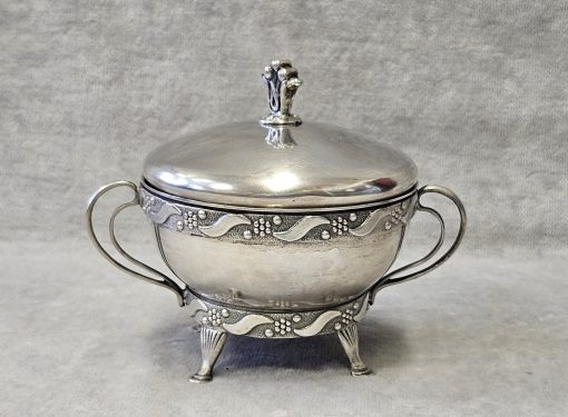 Cukiernica srebrna Warmet Biamet 156 g. srebro pr. 800 , waga 156 g. wym;9×10,5×7,5 cm. Puncowana; w prostokącie W głowa kobiety w chuście i 800 oraz B Warmet oddział Biamet Białystok lata 80 te. XX w.
