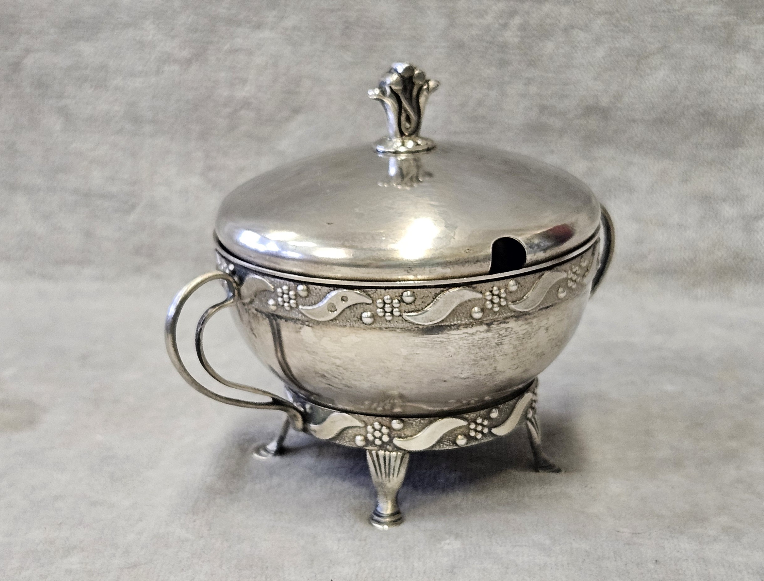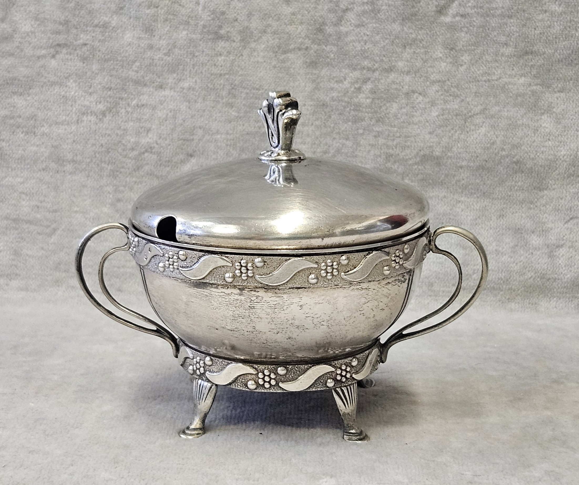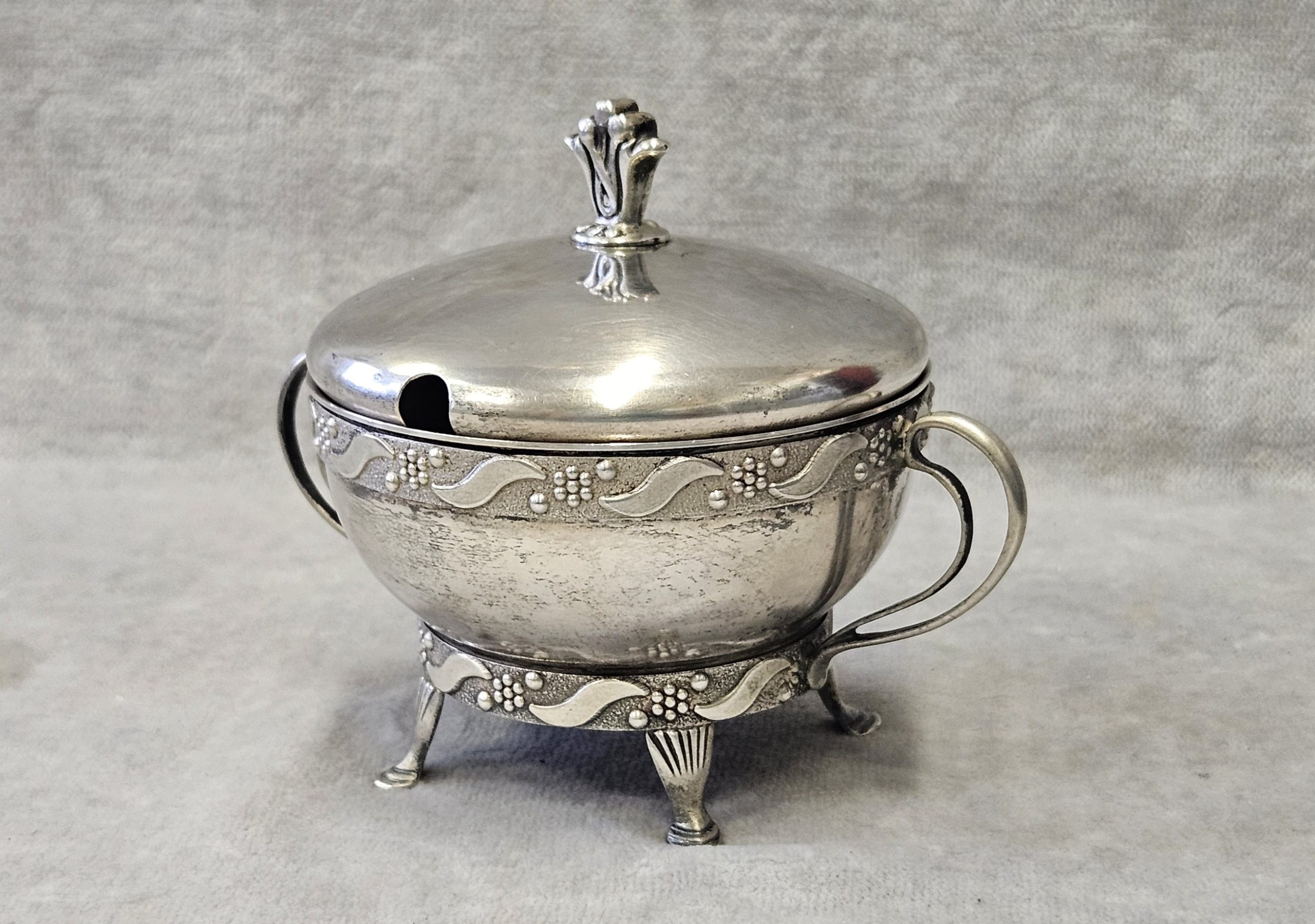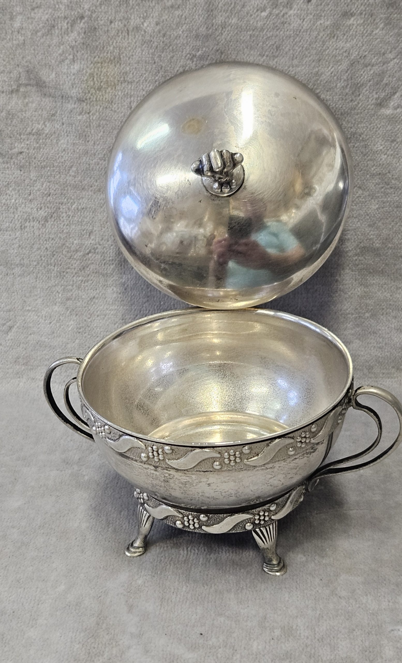 Cukiernica srebrna Warmet Biamet 156 g. srebro pr. 800 , waga 156 g. wym;9×10,5×7,5 cm. Puncowana; w prostokącie W głowa kobiety w chuście i 800 oraz B Warmet oddział Biamet Białystok lata 80 te. XX w.