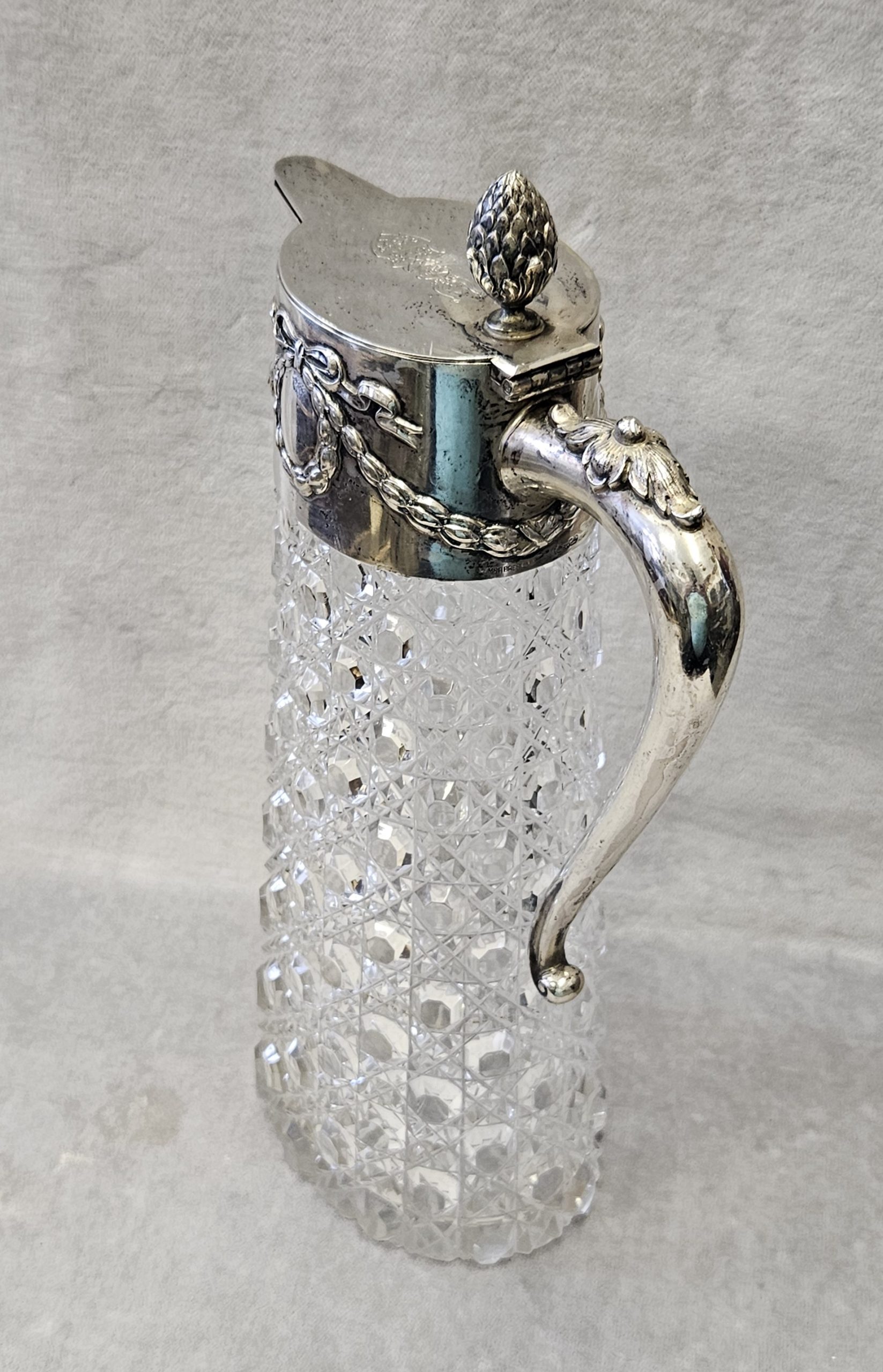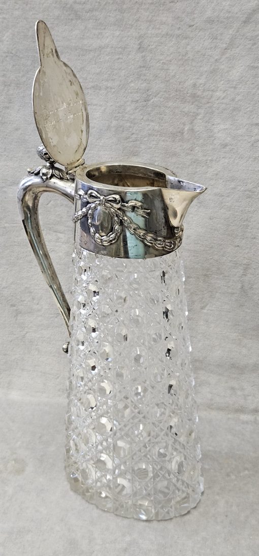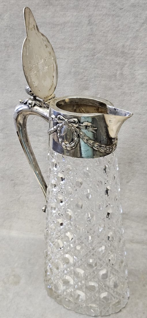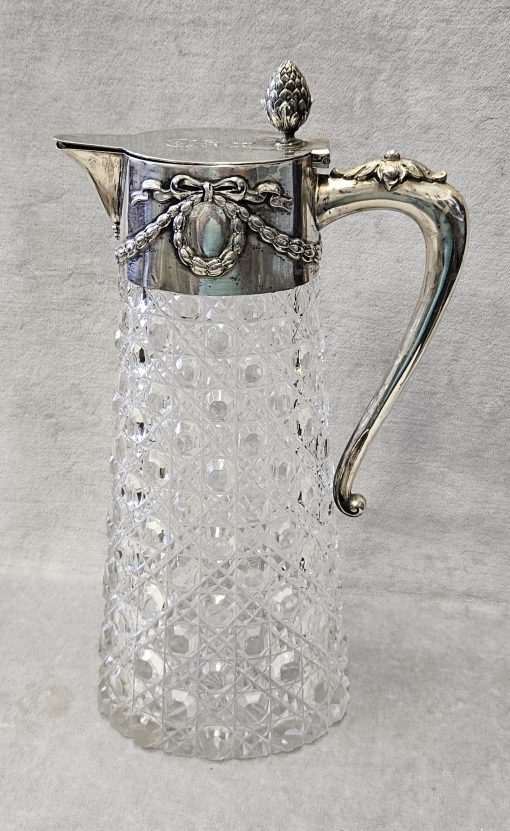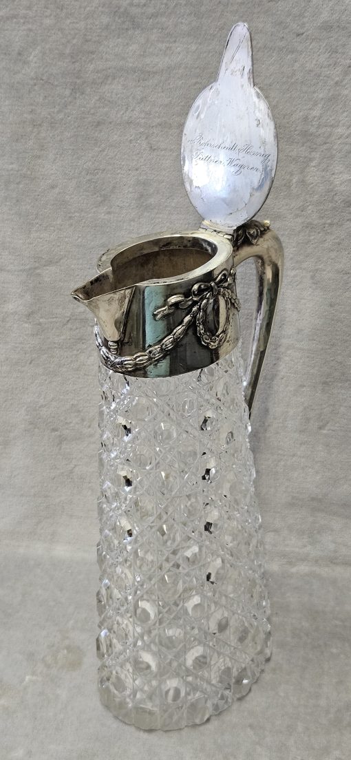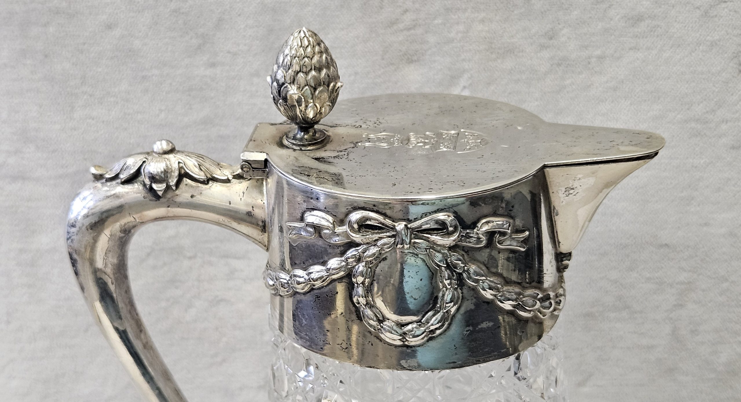 Dzban do wina, Wrocław, Julius Lemor, Dzban do wina z herbem srebro próby800, szkło kryształowe; wys. 27,5 cm, szer. 15 cm, podstawa. 11×8,5 cm. Puncowanie: półskiężyc, korona, 800 JAL Lemor Breslau Śląsk, Wrocław, Julius Lemor ok.1894 r