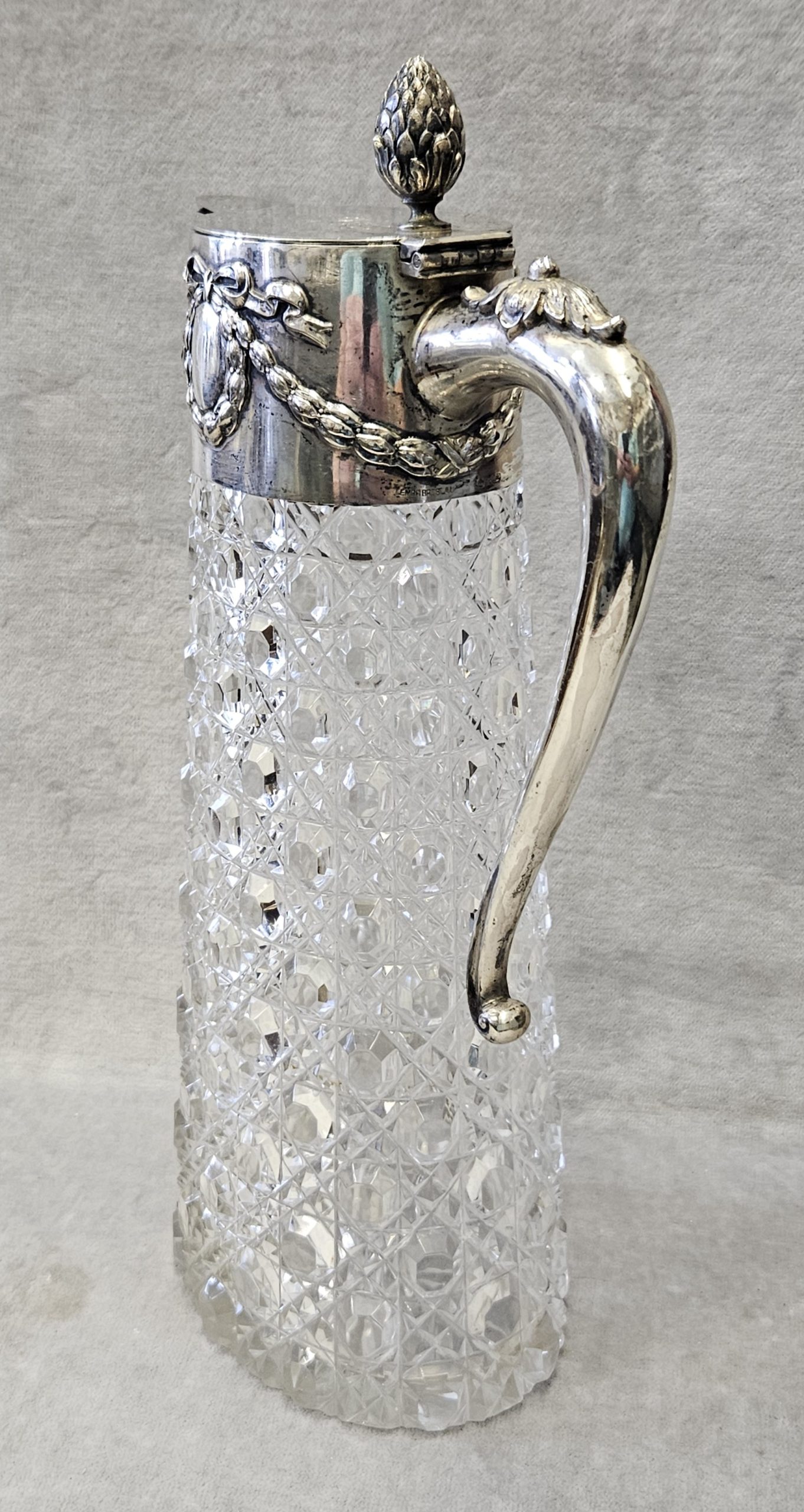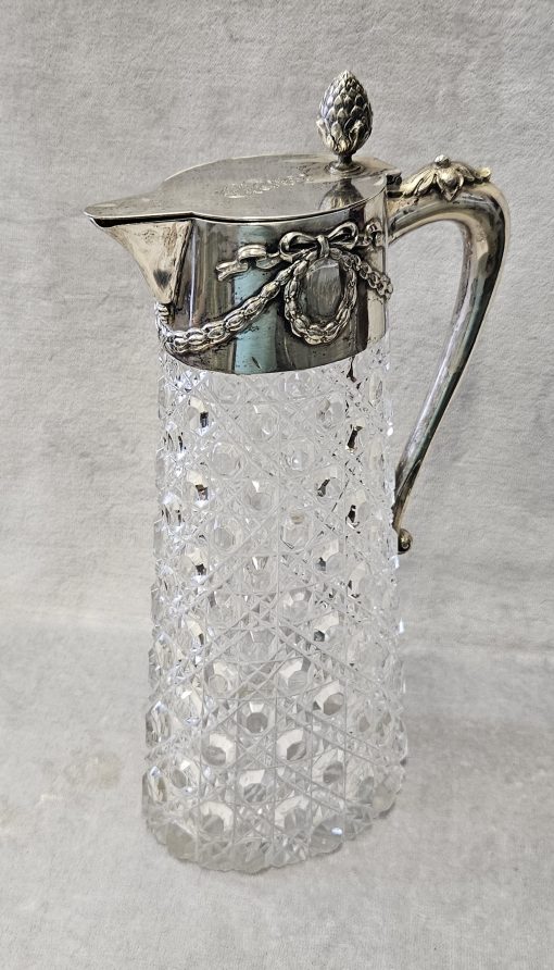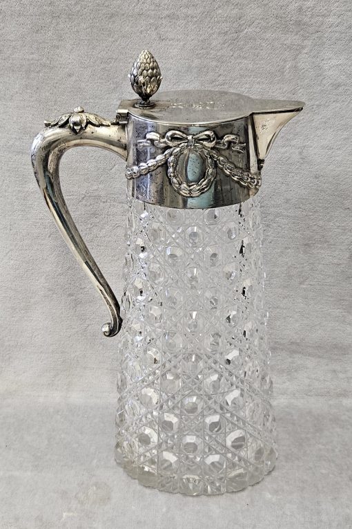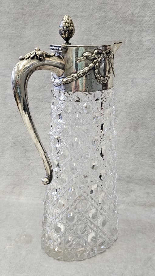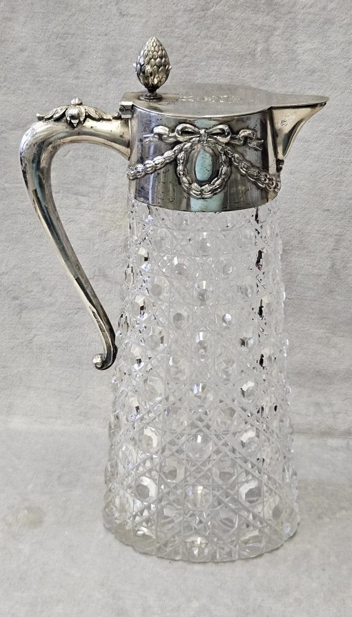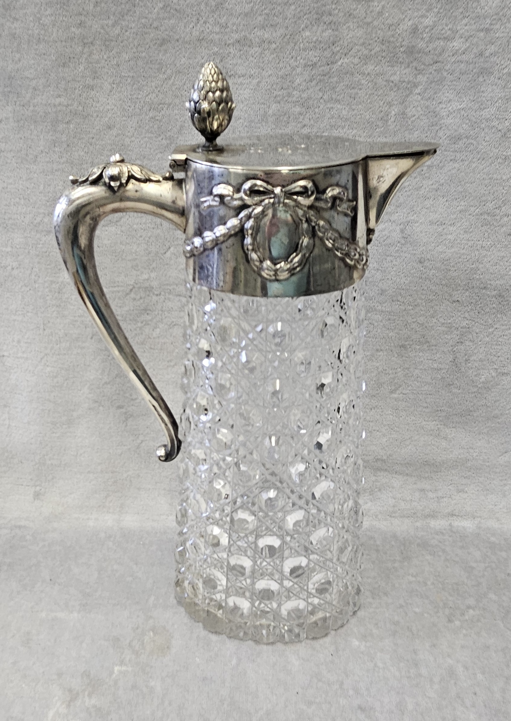 Dzban do wina, Wrocław, Julius Lemor, Dzban do wina z herbem srebro próby800, szkło kryształowe; wys. 27,5 cm, szer. 15 cm, podstawa. 11×8,5 cm. Puncowanie: półskiężyc, korona, 800 JAL Lemor Breslau Śląsk, Wrocław, Julius Lemor ok.1894 r