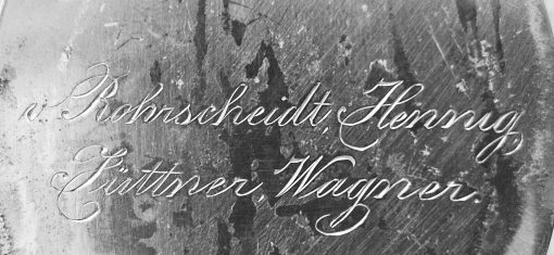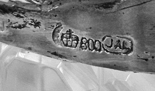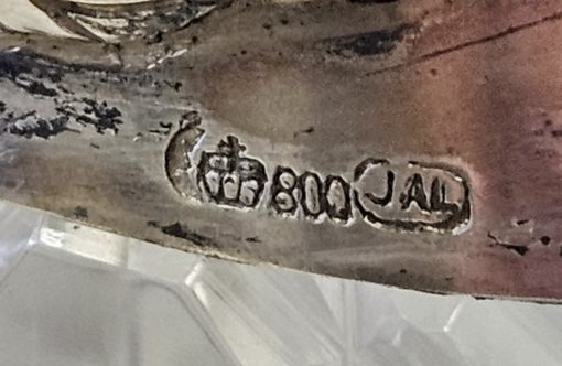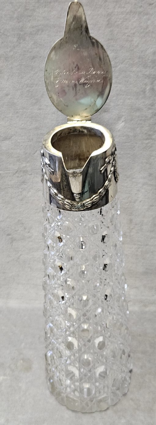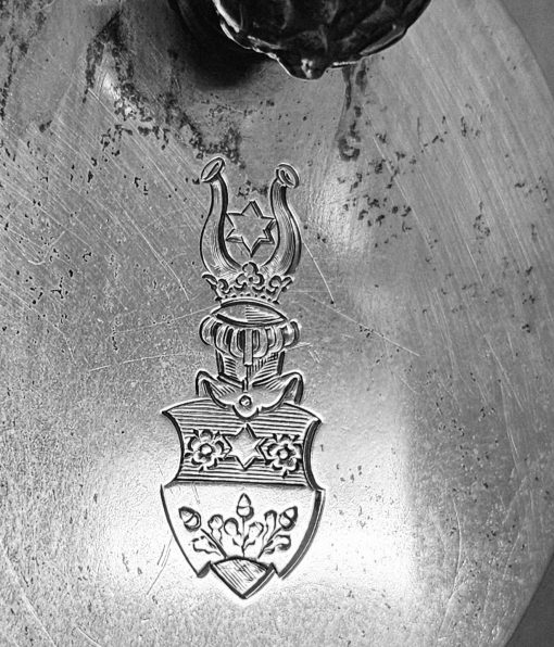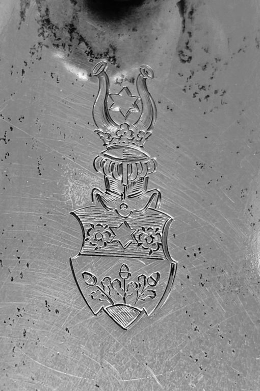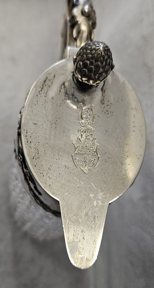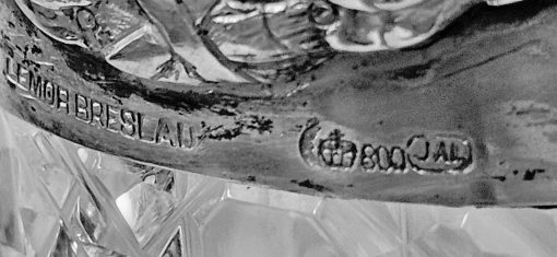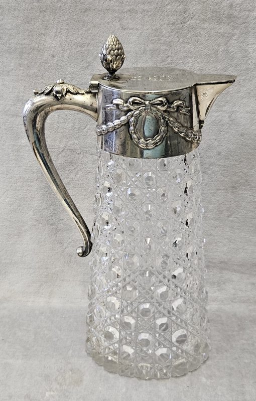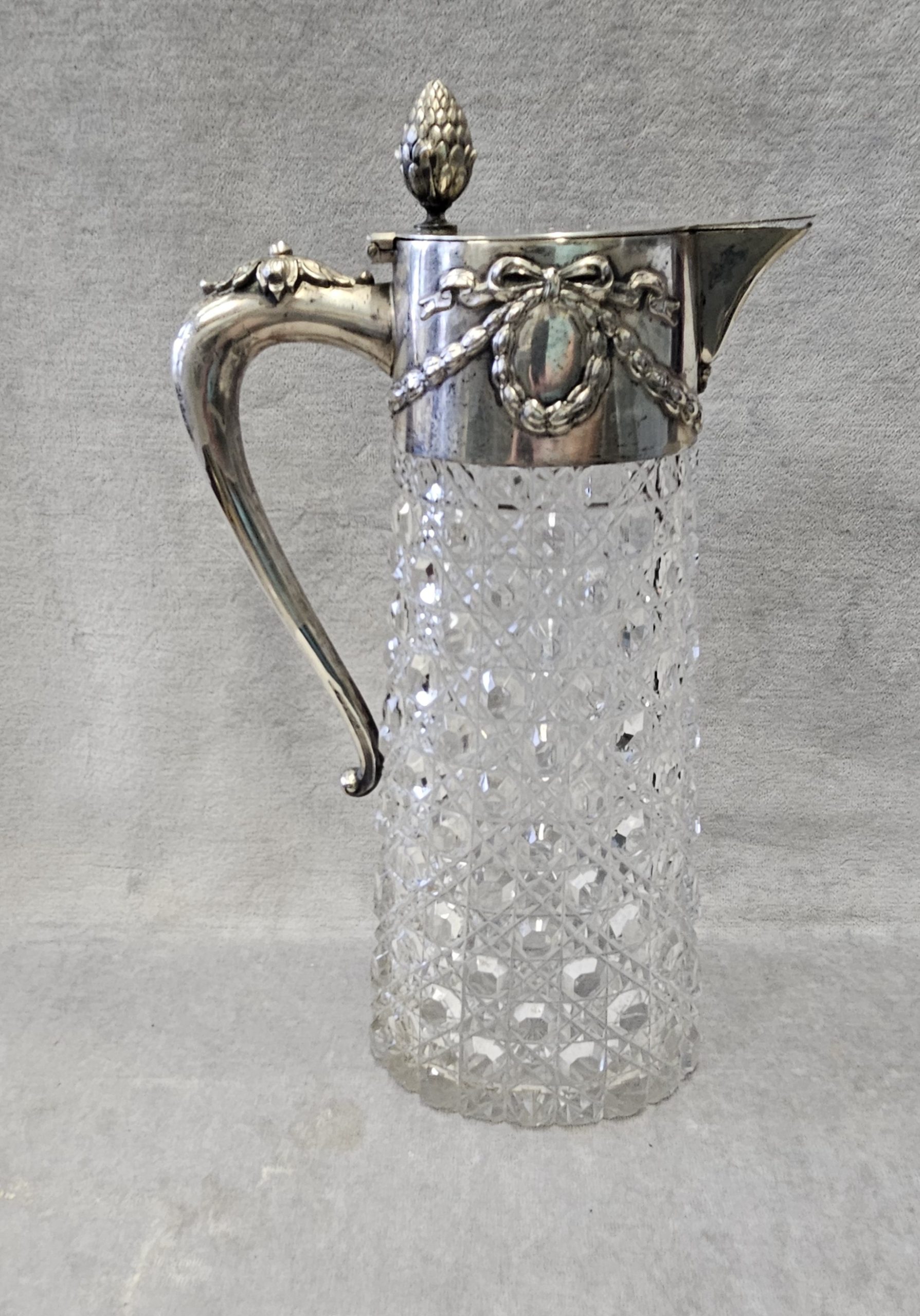 Dzban do wina, Wrocław, Julius Lemor, Dzban do wina z herbem srebro próby800, szkło kryształowe; wys. 27,5 cm, szer. 15 cm, podstawa. 11×8,5 cm. Puncowanie: półskiężyc, korona, 800 JAL Lemor Breslau Śląsk, Wrocław, Julius Lemor ok.1894 r