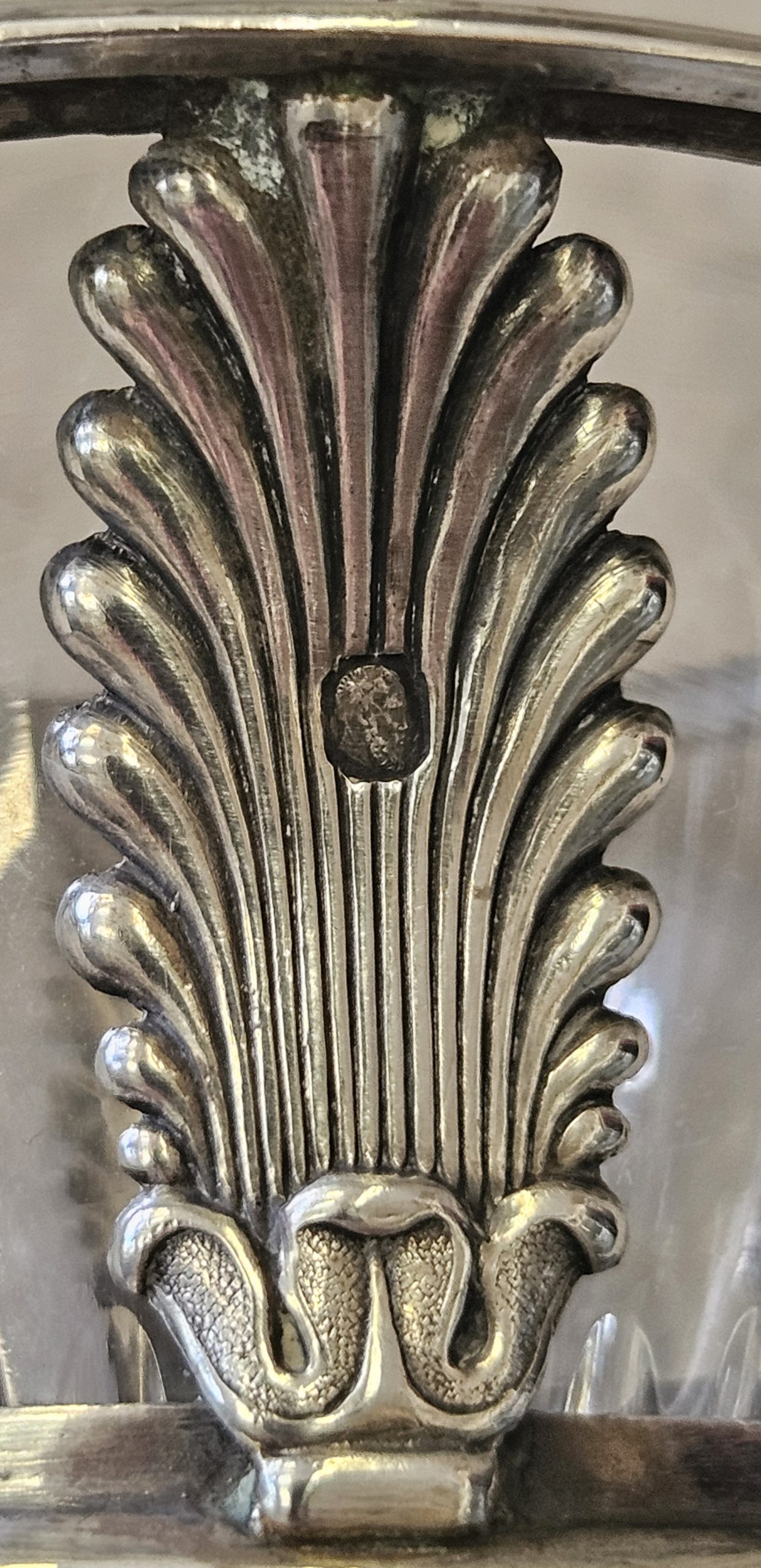 Para pucharków srebrnych Francja 1 poł. XIX w. srebro pr. 1. Waga 304g. (srebra 147g.) wys. 8 cm. śr. 8 cm. cechowane w ośmiokącie brodata głowa w prawo z cyfrą 1 próba państwowa z lat 1818-1838 próby gwarancyjne Głowa kobiety D.G. solniczki Francja lata 1818-1838