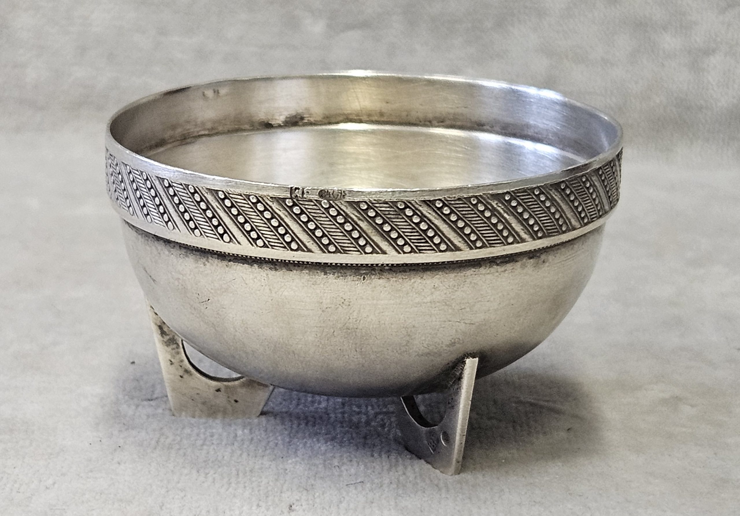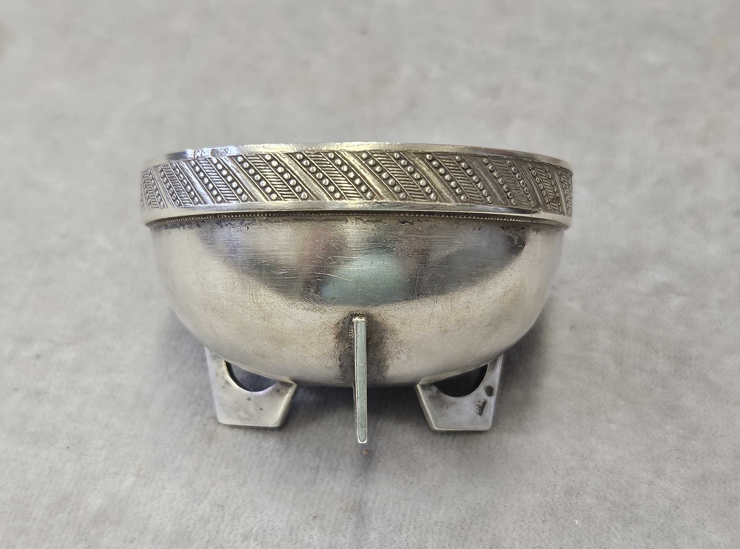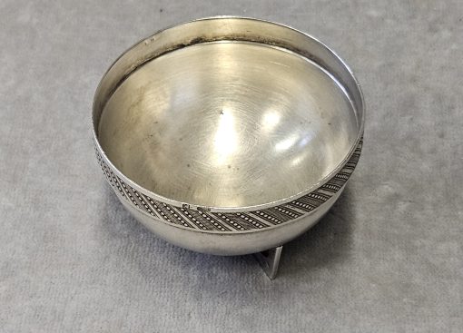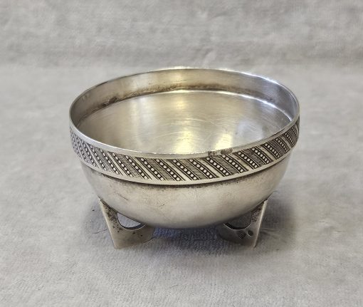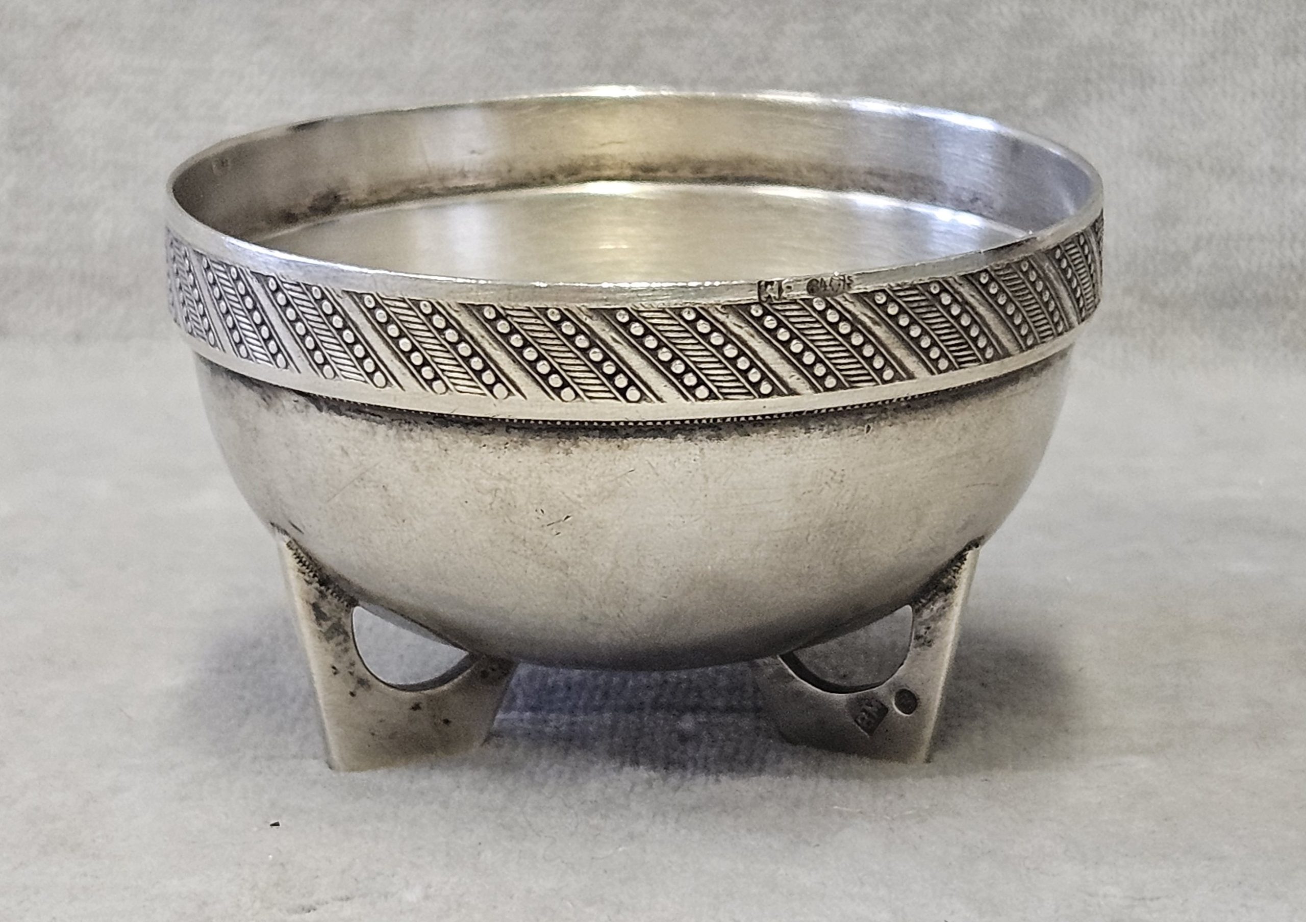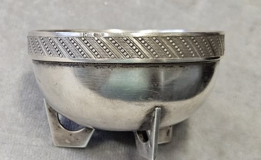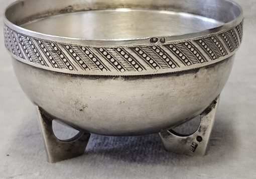 Solniczka srebrna Moskwa lata 1899-1908 . 53 g. Miseczka srebrna , Solniczka srebrna srebro próby 84 wys. cm; śr. cm. waga 53 g., cechowane; . w owalu: 84, głowa w kokoszniku, ИЛ oraz złotnik BM (Machałow B.C.). oraz wtórne w owalu 2 głowa kobiety w chuście i literka W cecha probierni warszawskiej. probierz Iwan Siergiejewicz Liebiedkin; Rosja, Moskwa lata 1899-1908 Machałow B.C.