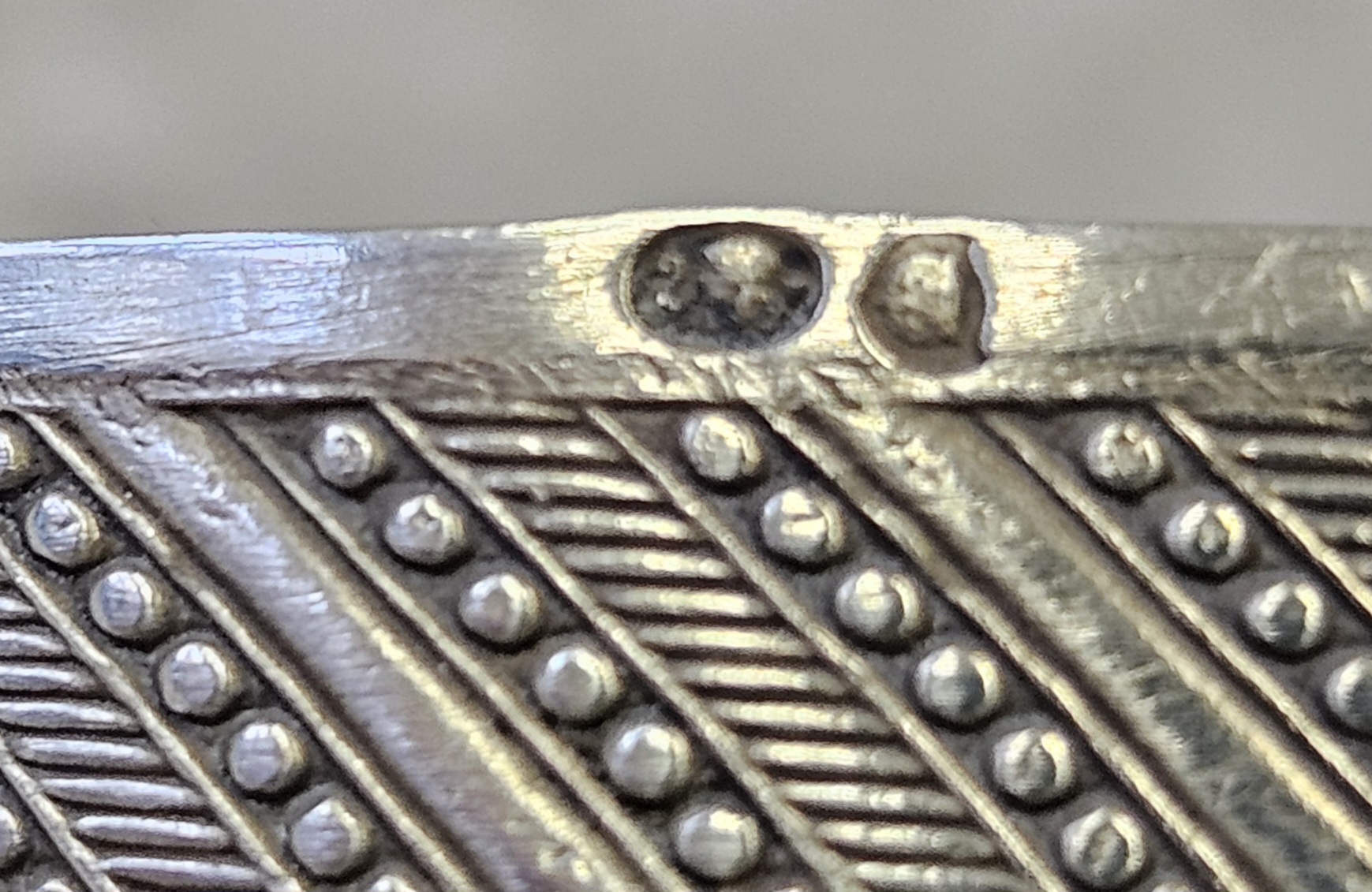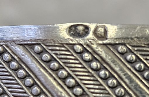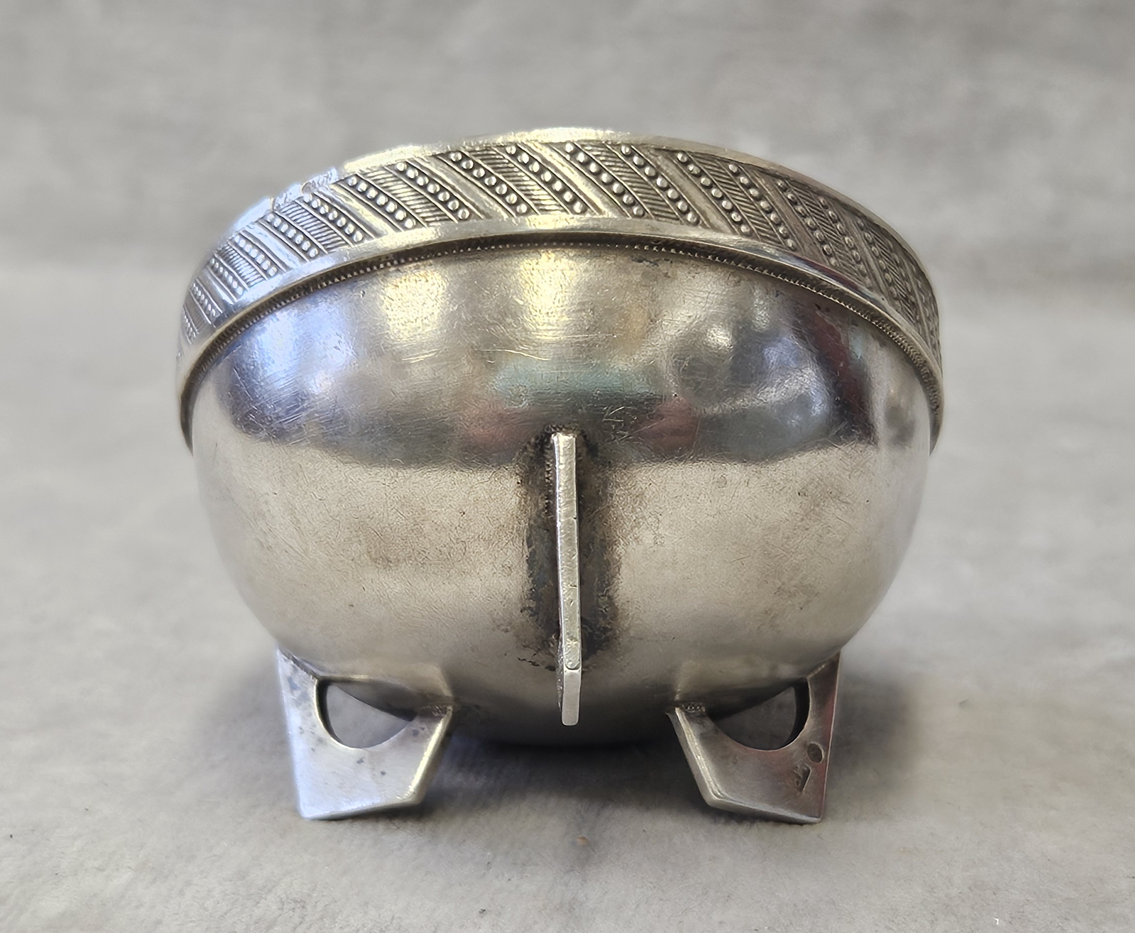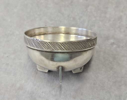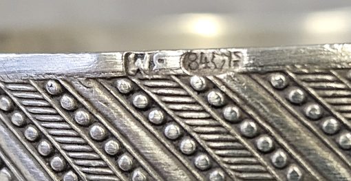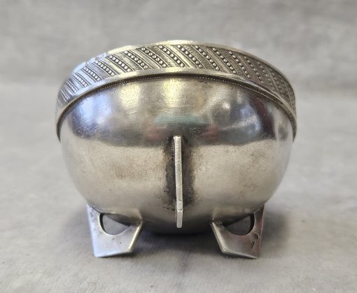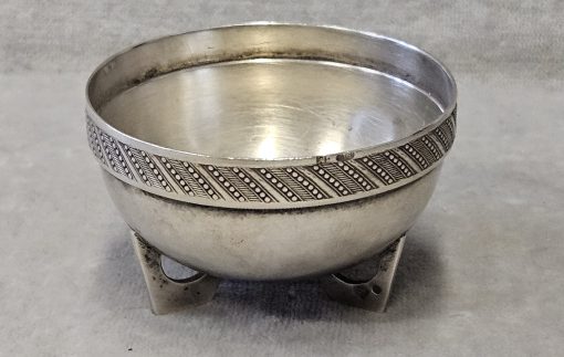 Solniczka srebrna Moskwa lata 1899-1908 . 53 g. Miseczka srebrna , Solniczka srebrna srebro próby 84 wys. cm; śr. cm. waga 53 g., cechowane; . w owalu: 84, głowa w kokoszniku, ИЛ oraz złotnik BM (Machałow B.C.). oraz wtórne w owalu 2 głowa kobiety w chuście i literka W cecha probierni warszawskiej. probierz Iwan Siergiejewicz Liebiedkin; Rosja, Moskwa lata 1899-1908 Machałow B.C.